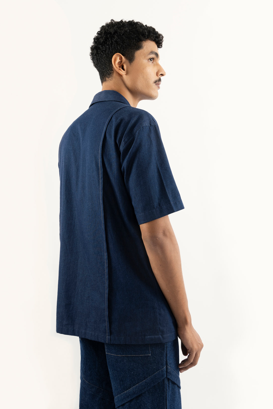 open collar style - wide placket - front and back side pleat - contrast top stitch detail - half sleeve - side pockets - front button down closure - regular fit