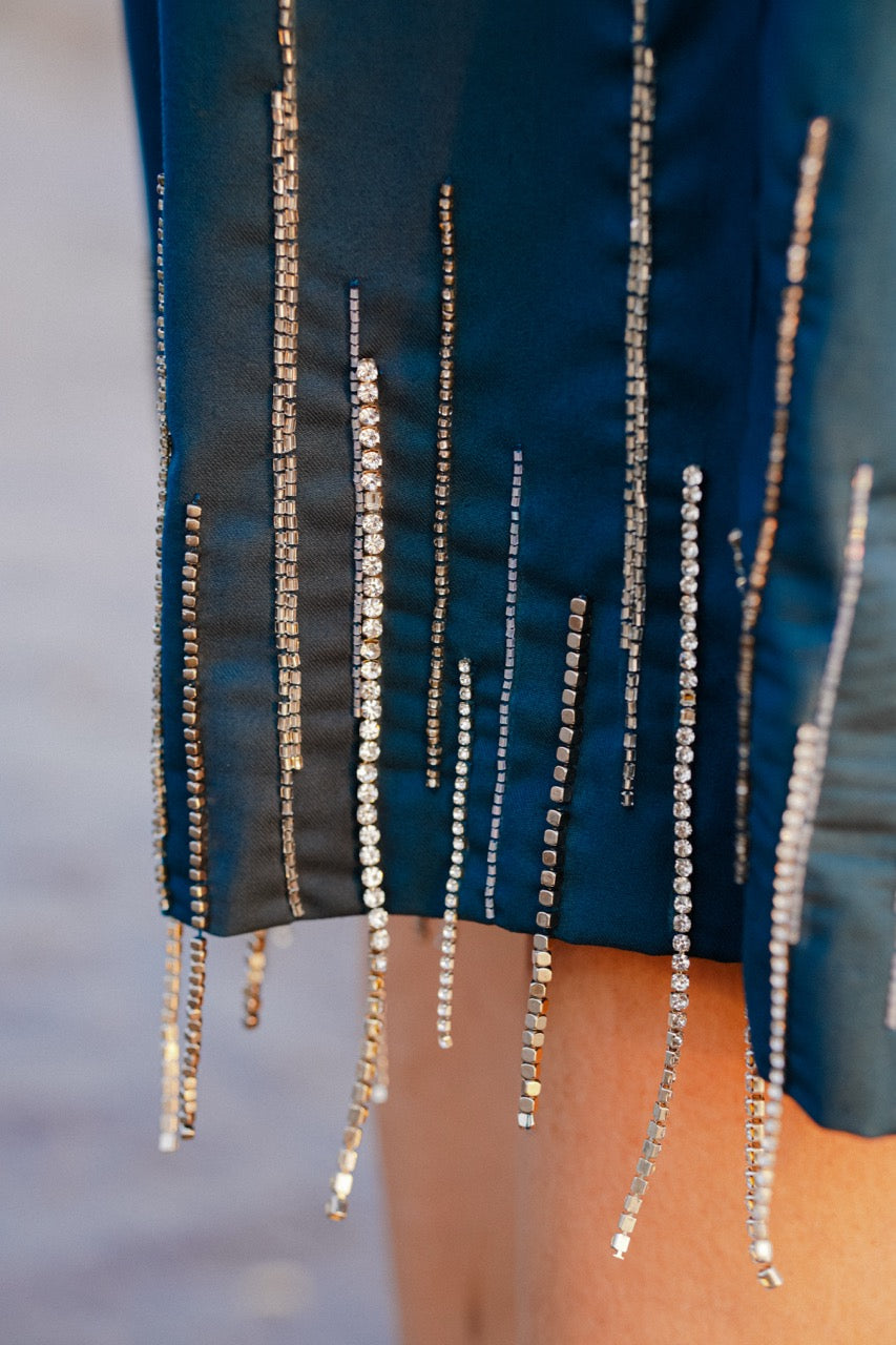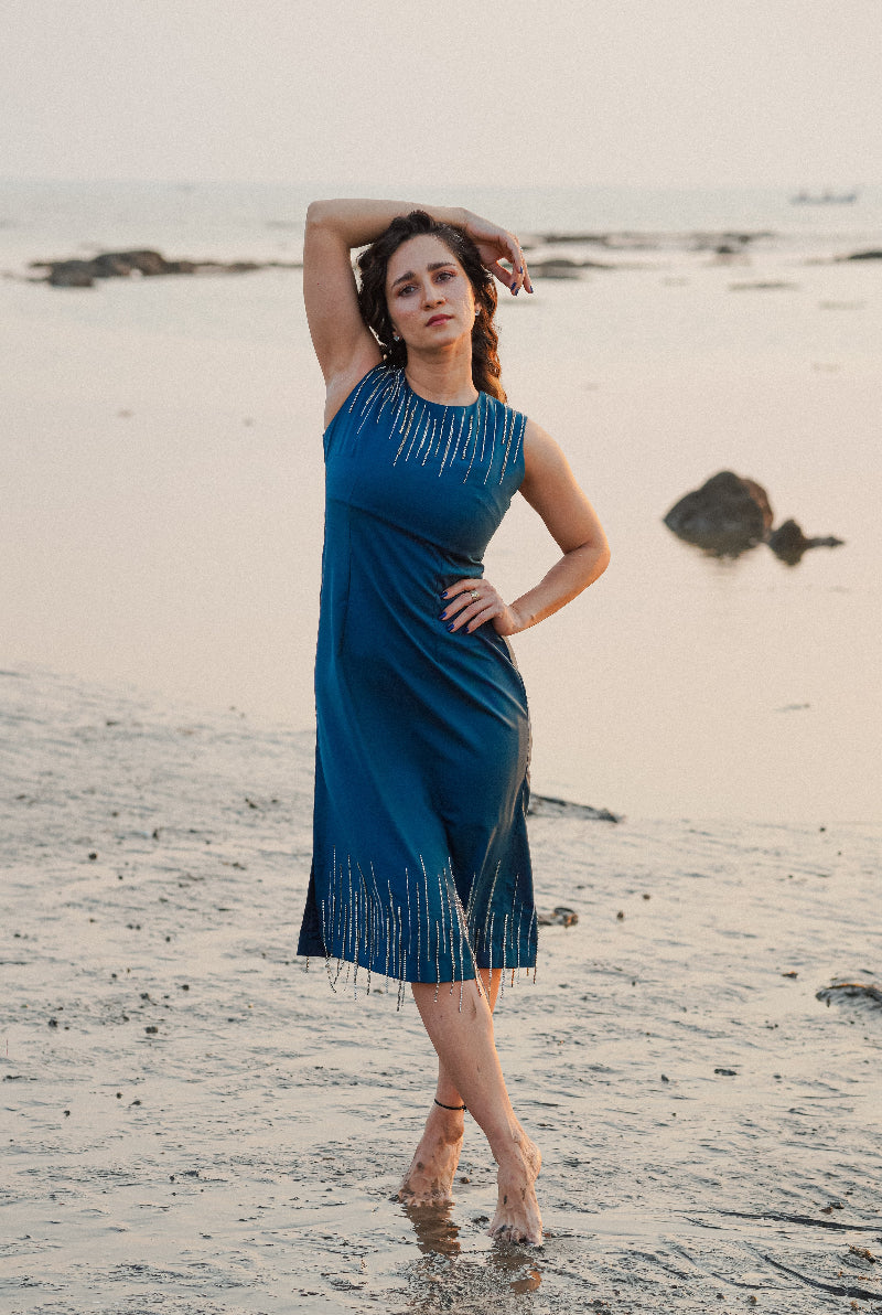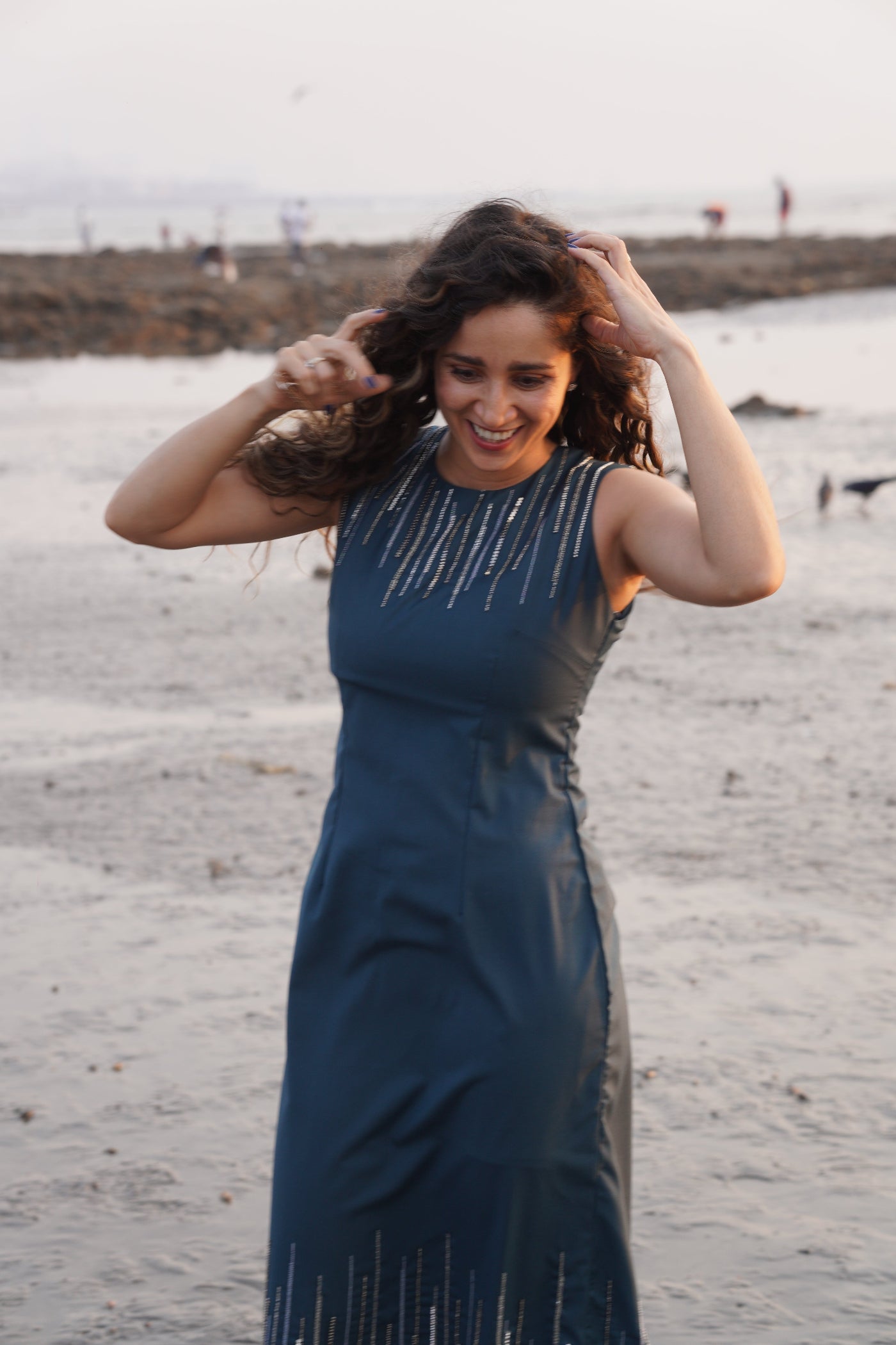 Shay's bestseller has Embellishments inspired by rain's fall. A straight-fit midi dress with slide slit for the monsoon vibe.