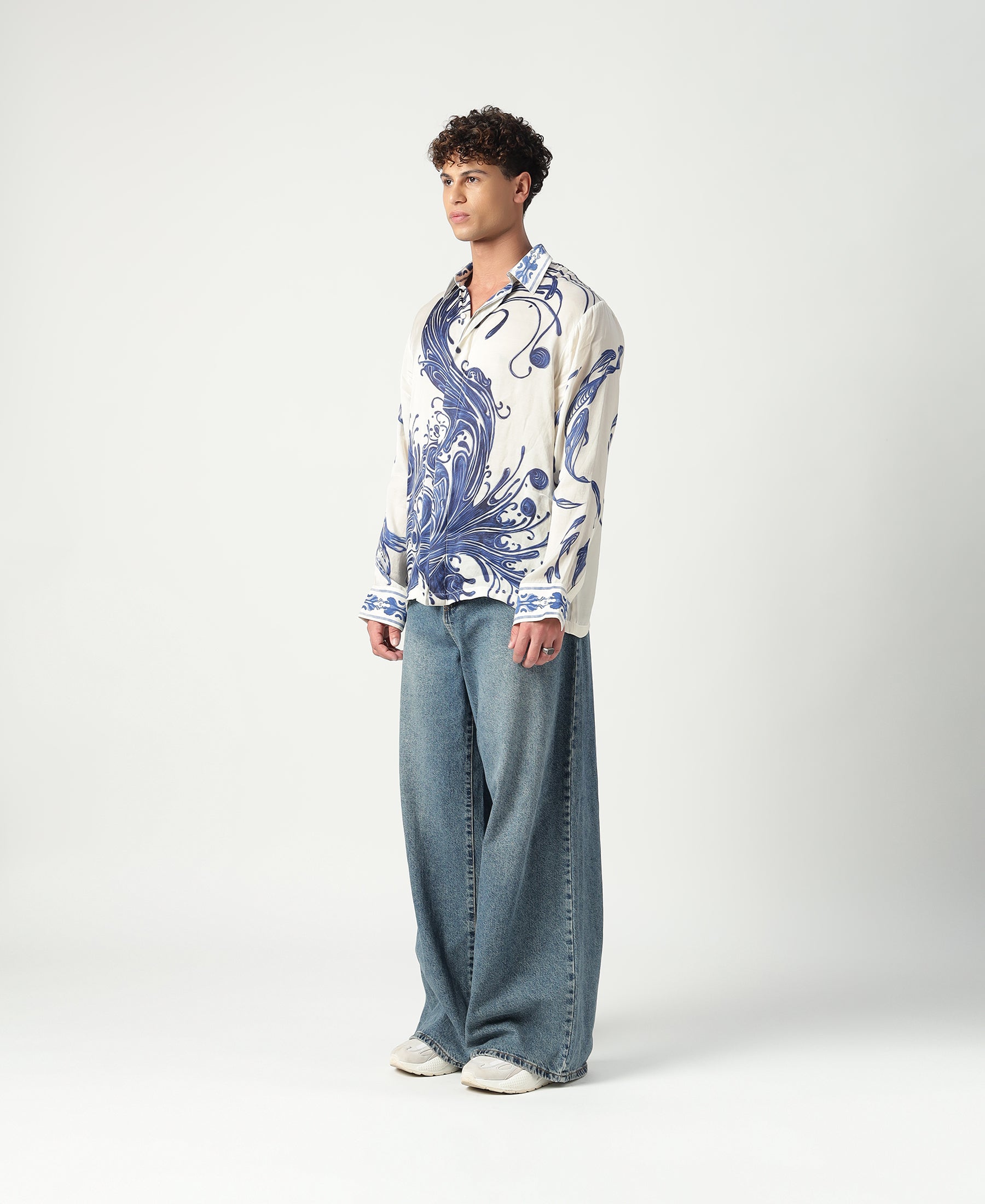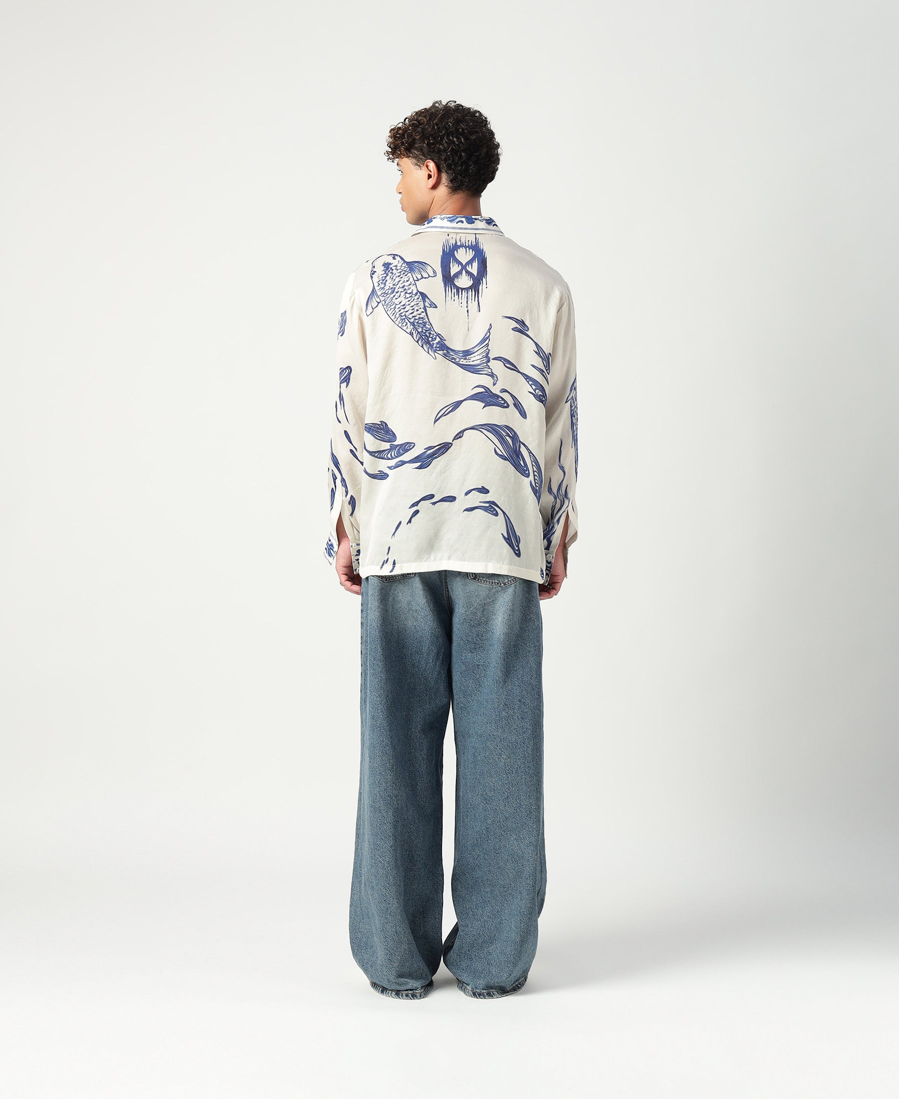 Introducing a full-sleeve engineered print satin shirt in ecru Color , inspired by the beauty of marine life. Featuring a classic collar and shell button closure, this shirt seamlessly blends luxury with artistry. The fish abstract add a unique touch, making it perfect for both casual and semi-formal occasions.