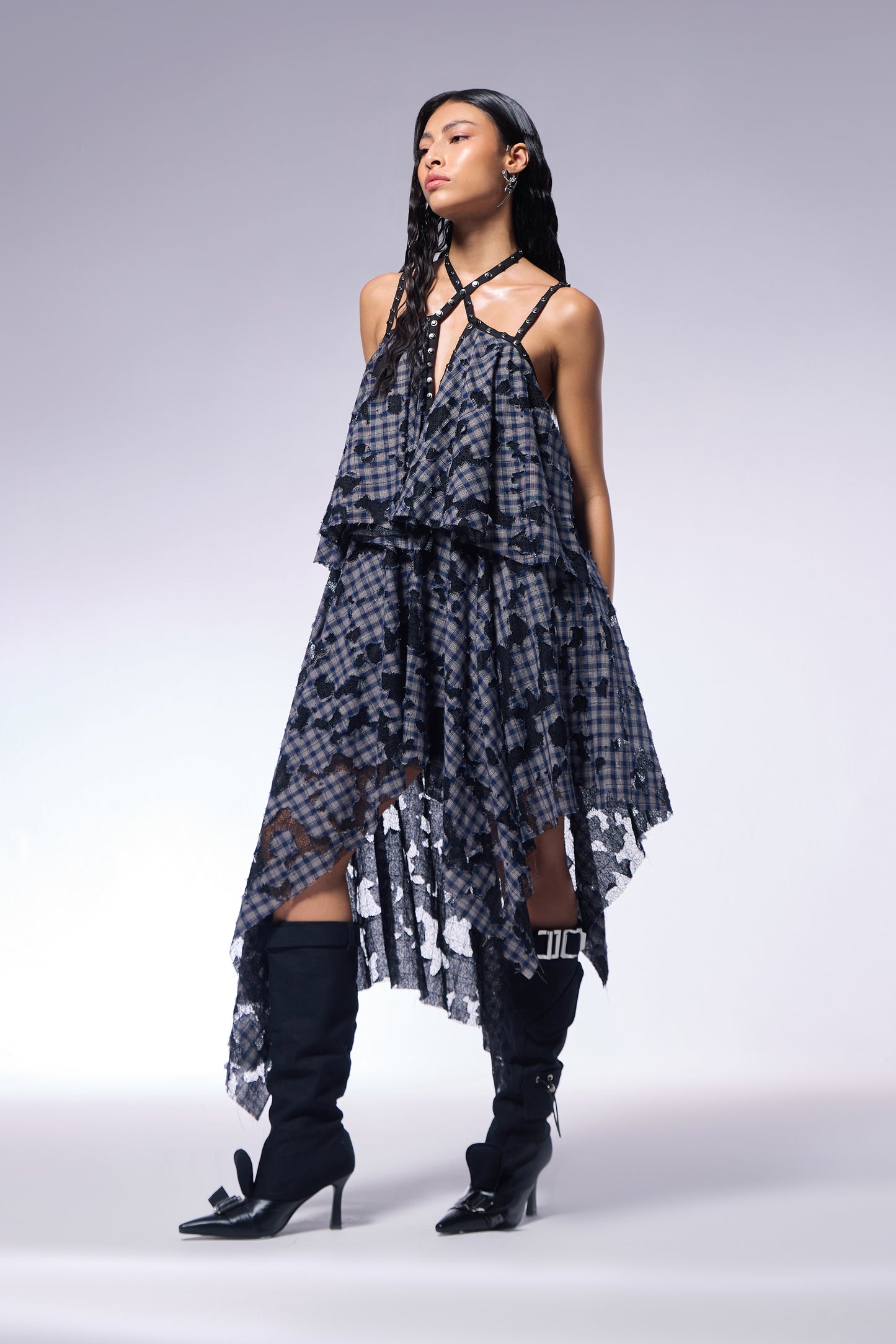 This layered dress crafted from deconstructed tattered fabric, offering a bold, artistic statement. Metal hardware details adorn the straps, enhancing the raw aesthetics.