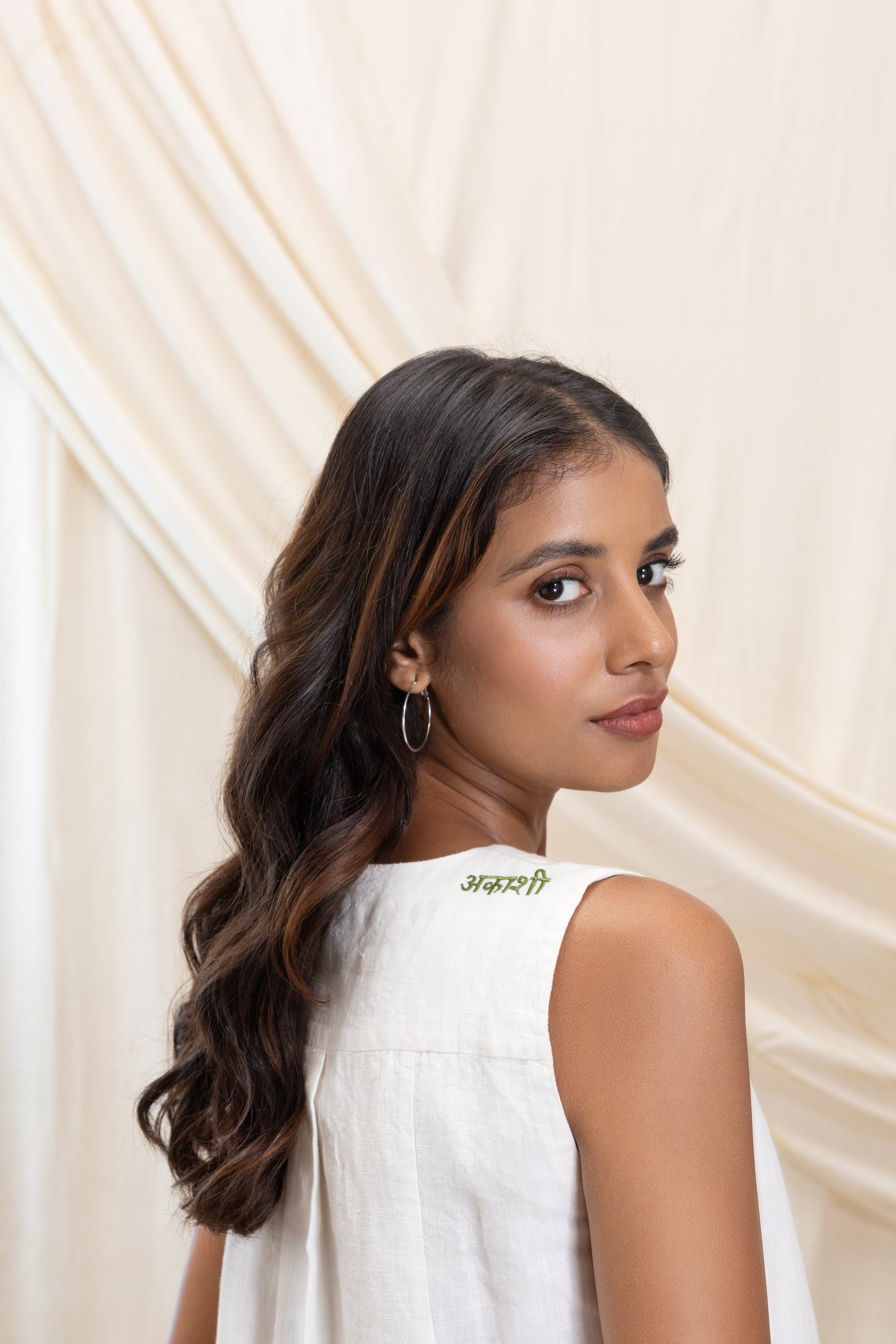 A sleeveless, relaxed-fit tunic with side slits, each accented with our signature line embroidery in contrasting colors. The top also features our stamp embroidery and the Akashi logo subtly placed on the right shoulder, adding thoughtful detail to a minimal silhouette.