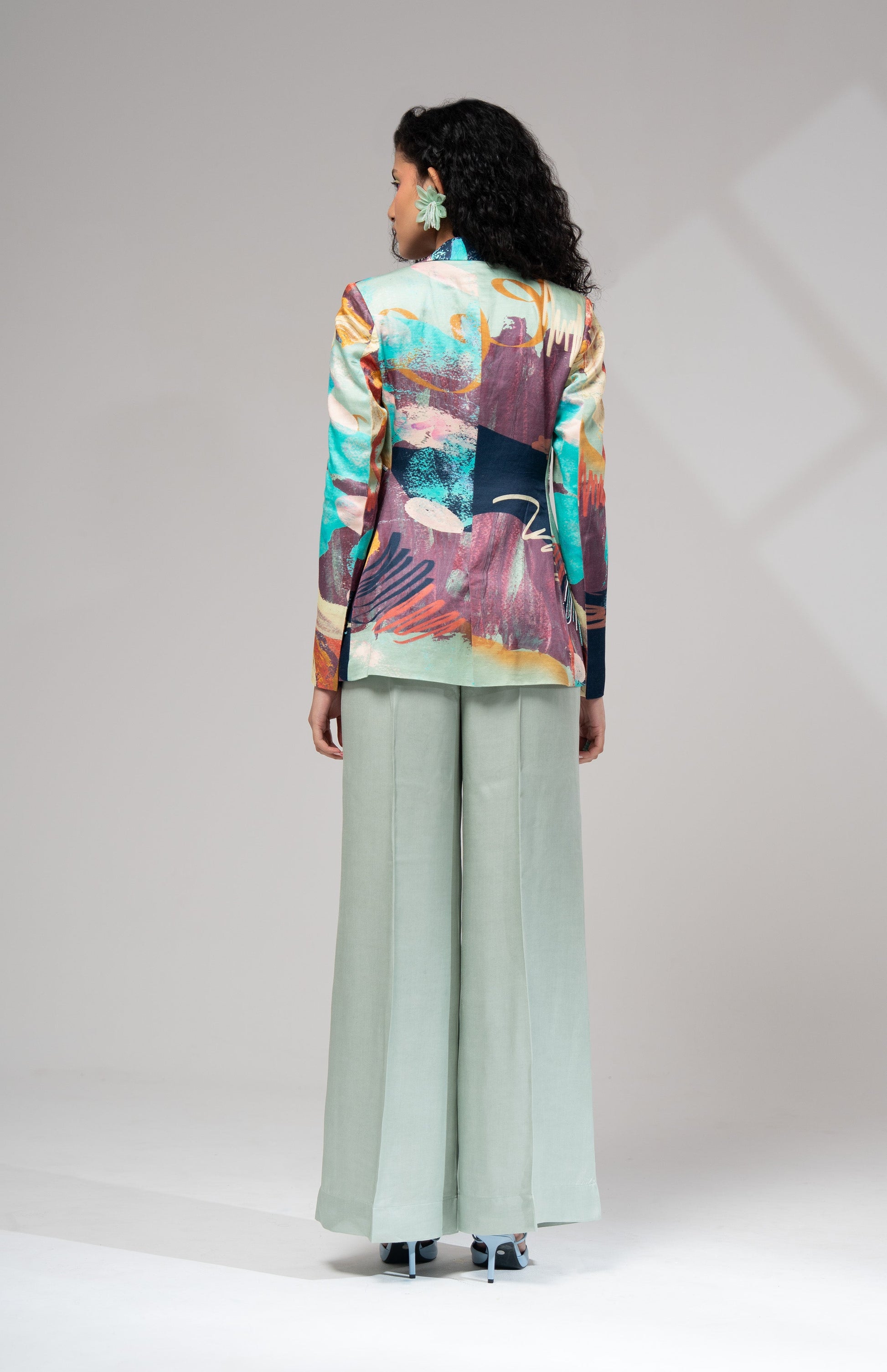 An extremely lightweight blazer with our signature hand embroidery, paired with solid colour wide leg pants.Â