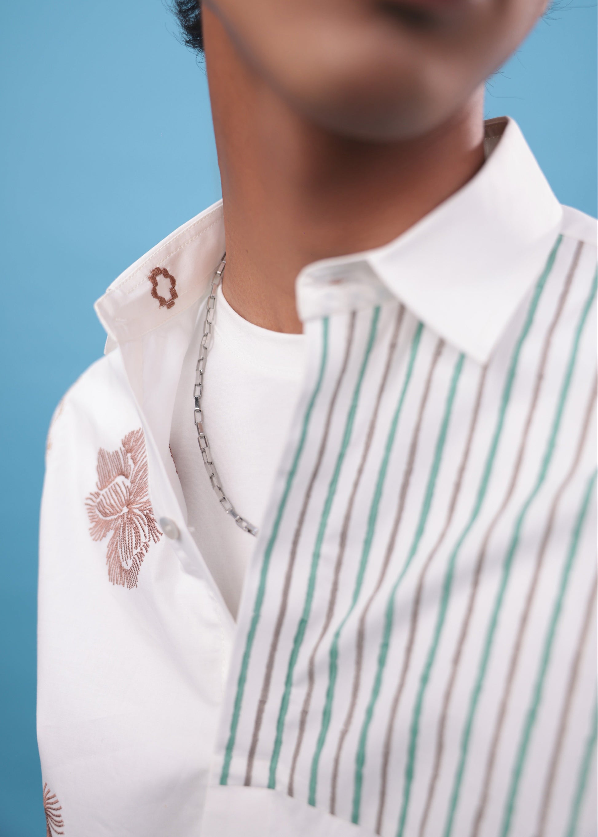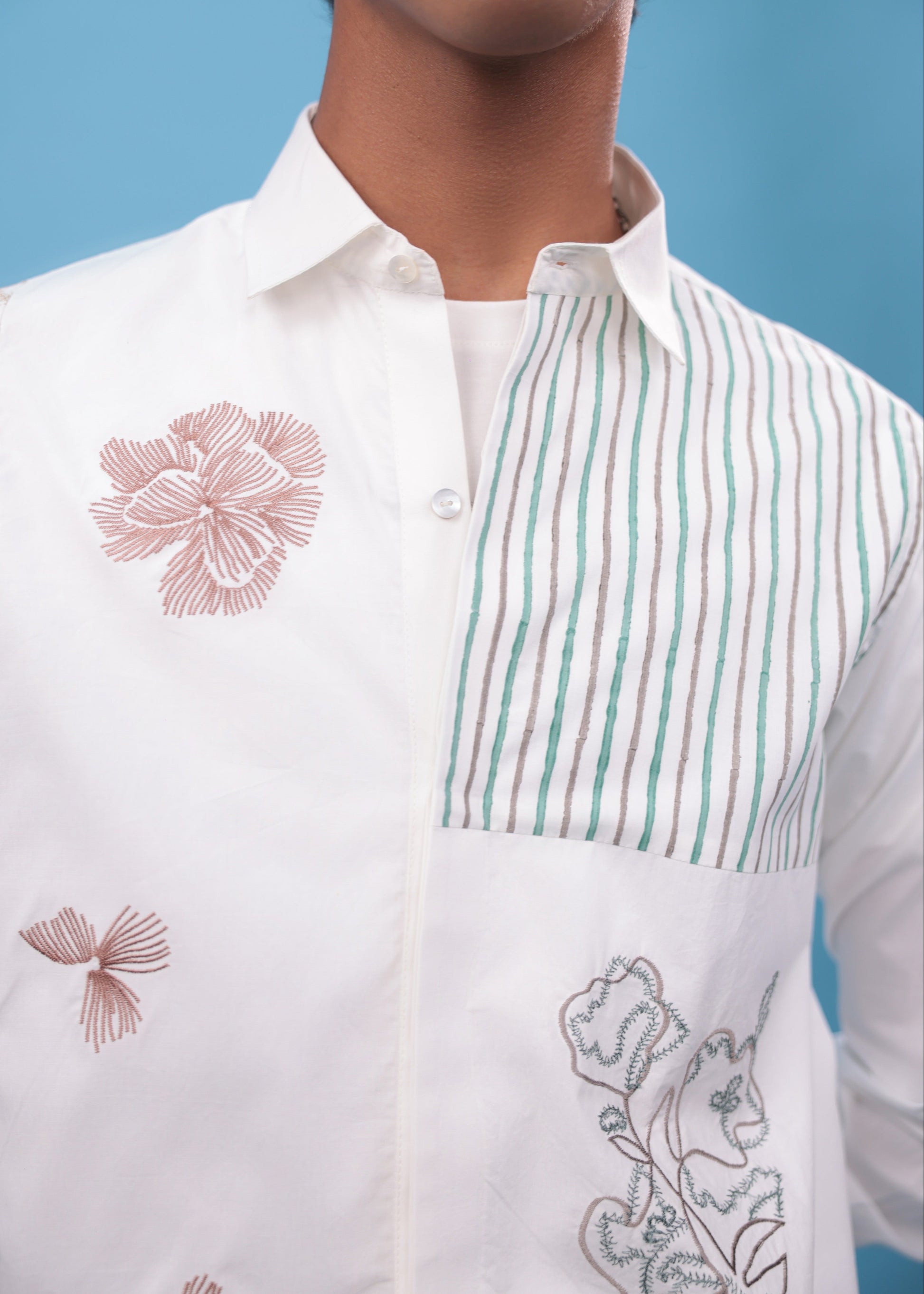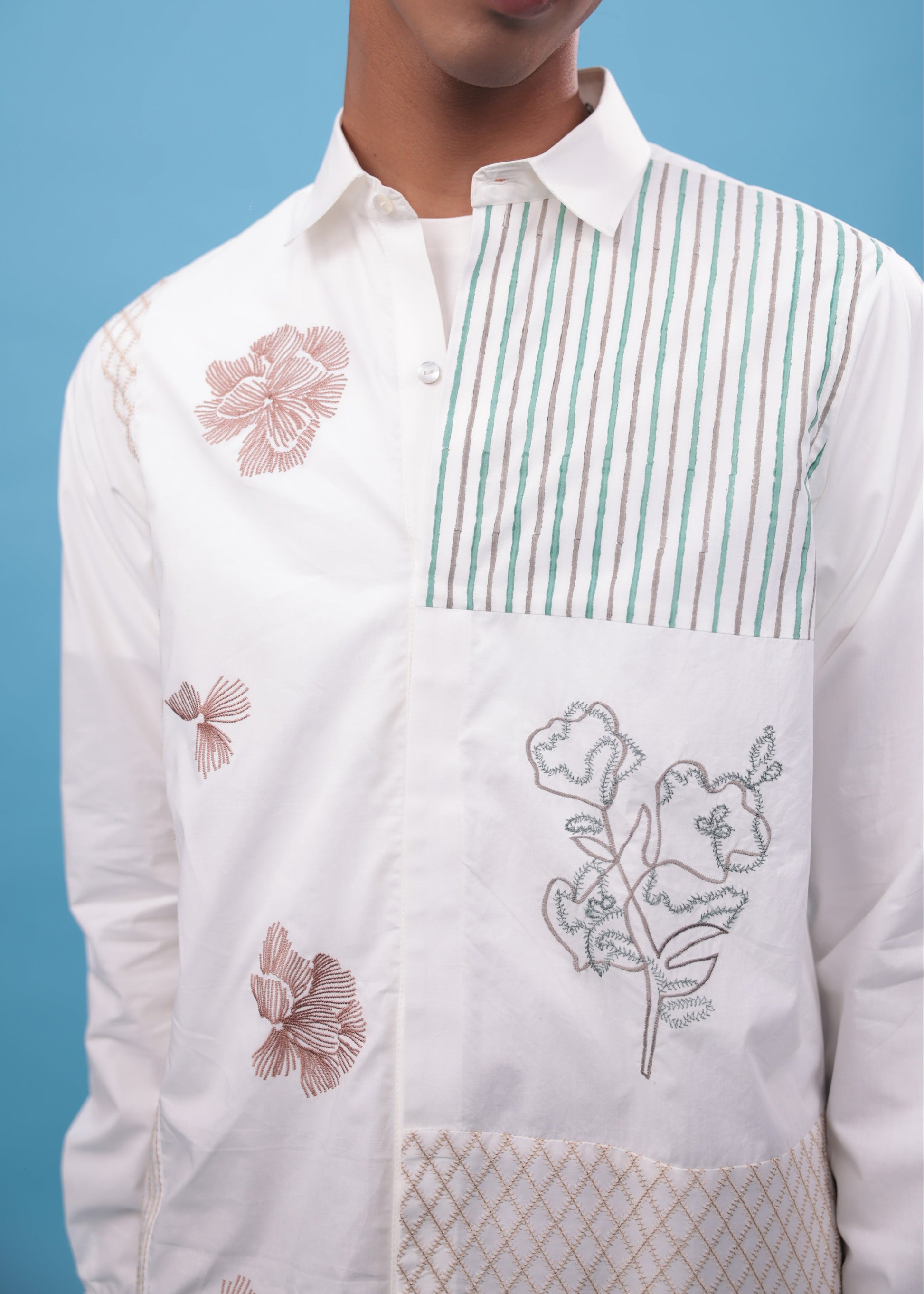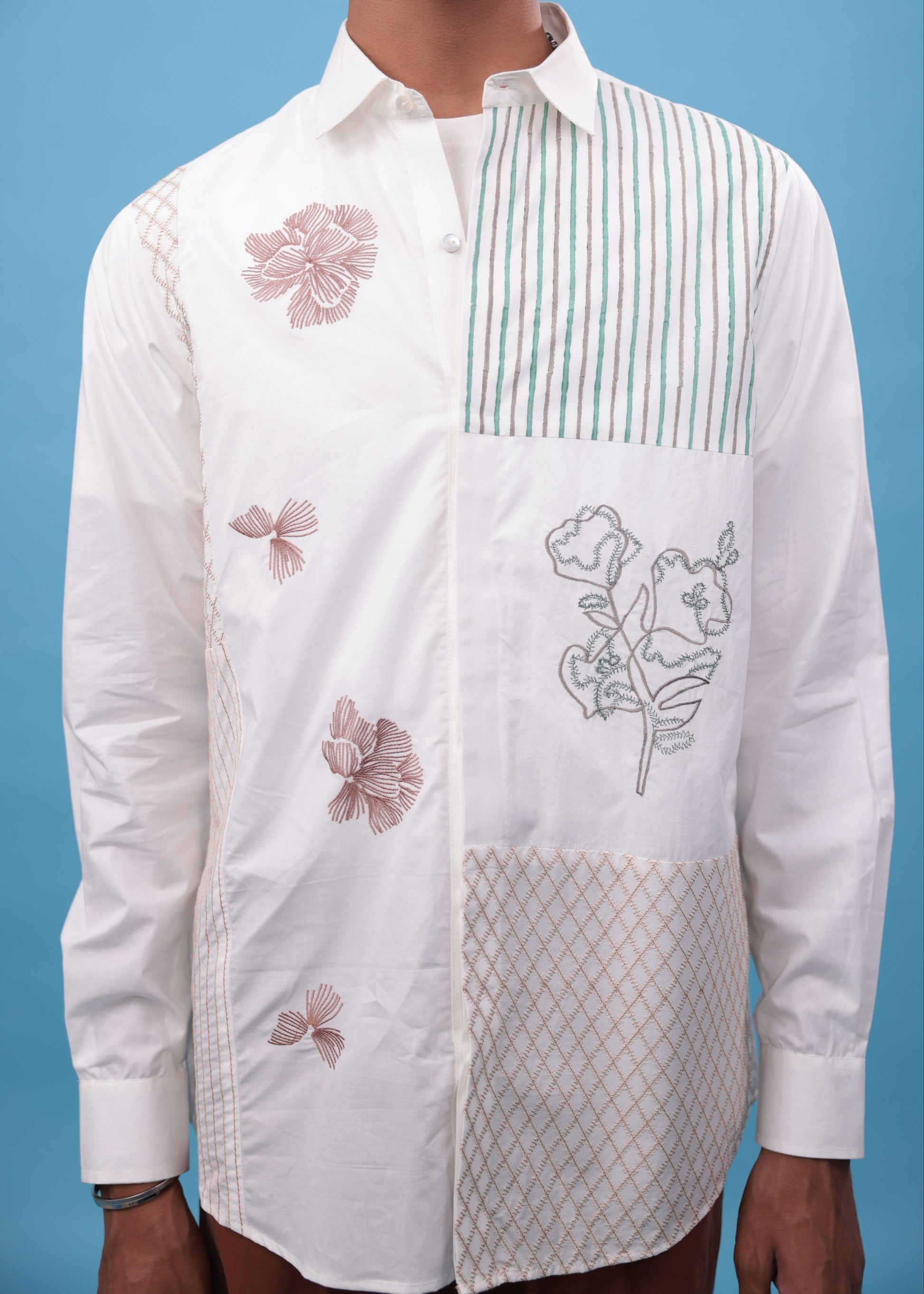The Riviera Bloom Shirt —crafted from luxurious 100% Egyptian giza cotton poplin, this off-white shirt embodies coastal elegance. Featuring a harmonious blend of hand block printing and thread embroidery, it showcases abstract floral motifs and textured patchwork. Handcrafted in over 45 hours, it provides exceptional softness, strength, and breathability, ensuring unparalleled comfort during warm-weather outings. Ideal for holiday wear, sundowners, and resort outings.