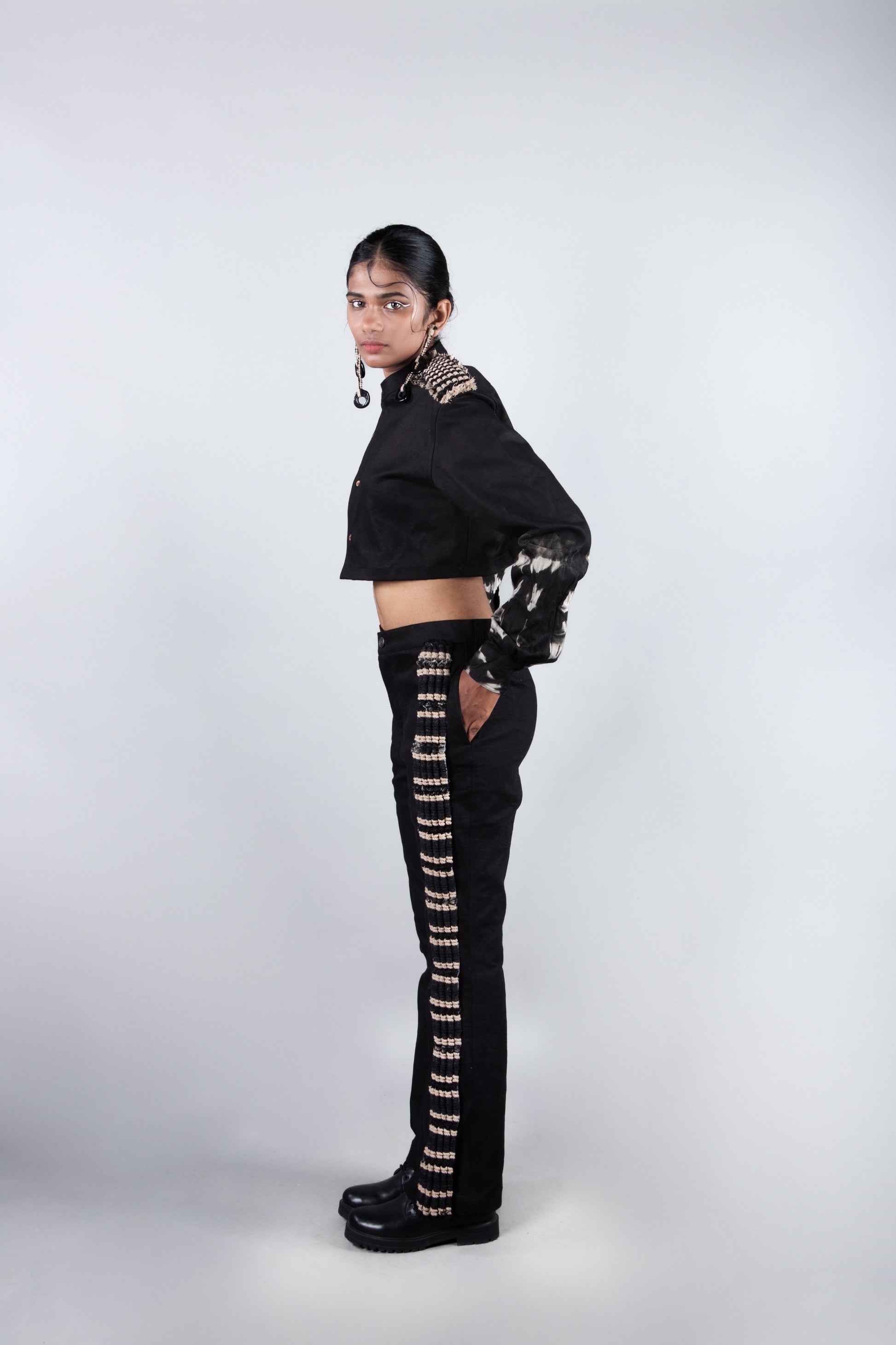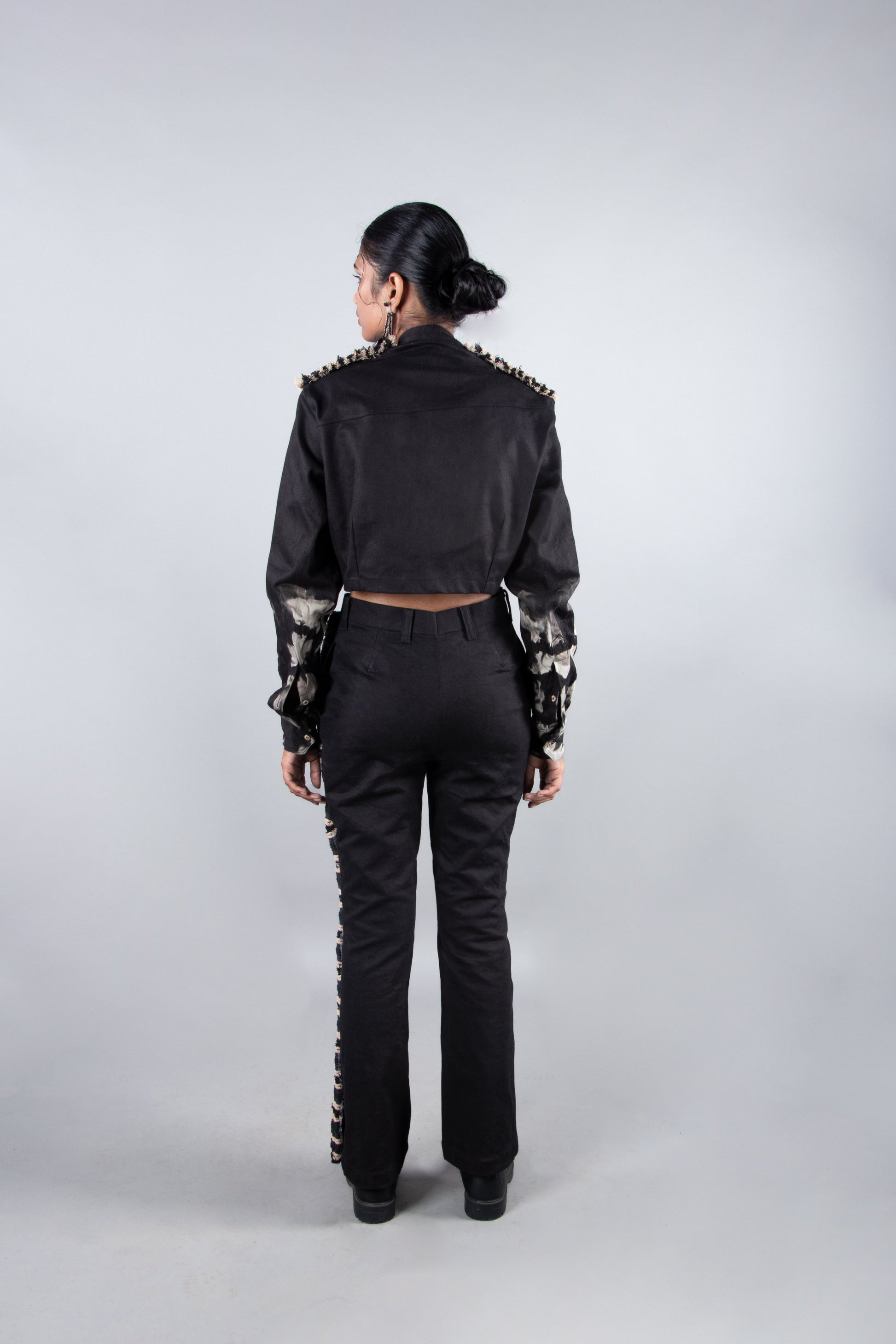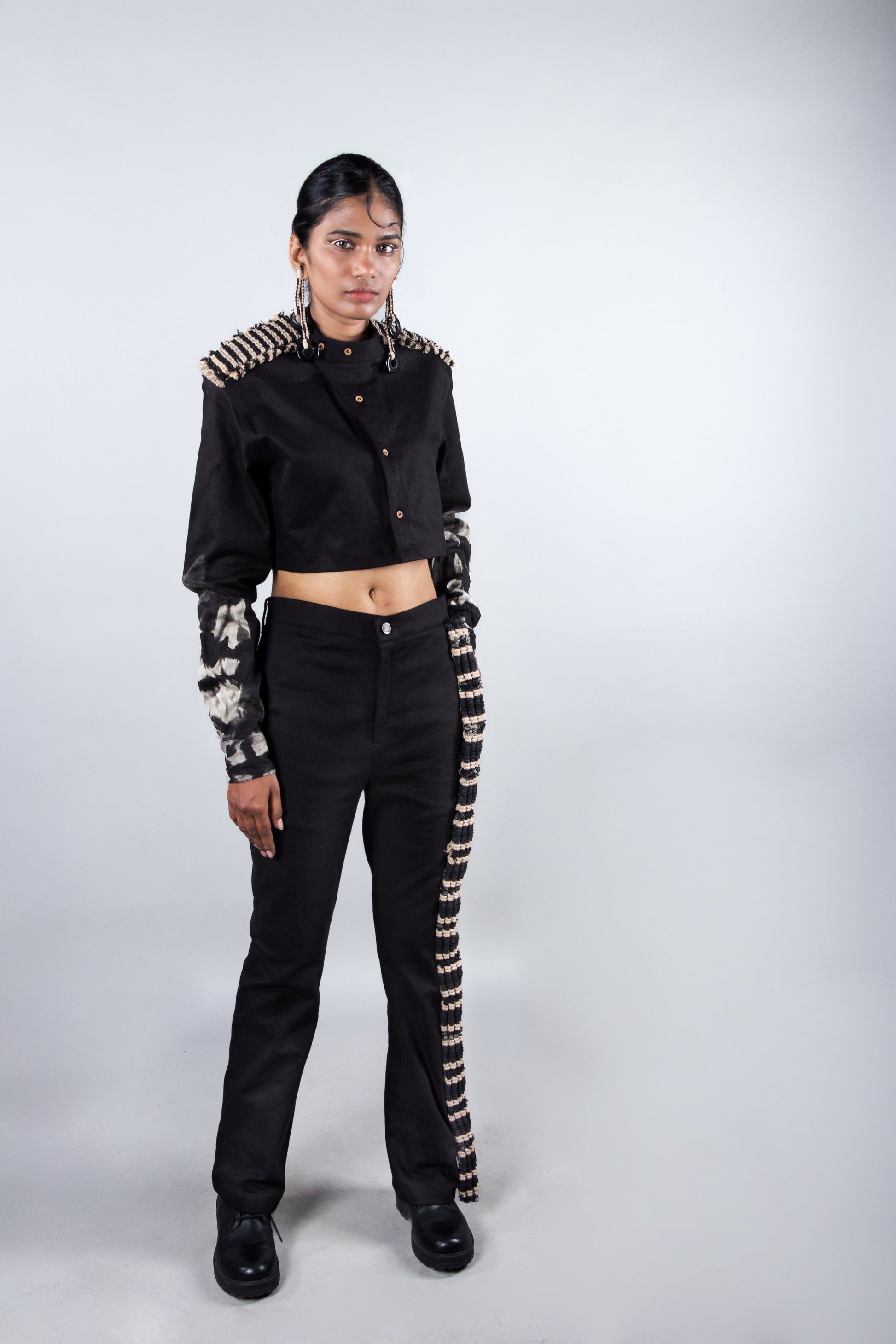 Description – Elevate your style with the Rock Black set. This co-ord set consists of a black denim cropped shirt with a mandarin collar, handcrafted macrame details at the shoulders, and tie-dye accents on the sleeves. Paired with black denim bootcut pants featuring a handcrafted macrame panel on one side. Expertly crafted for a unique look.