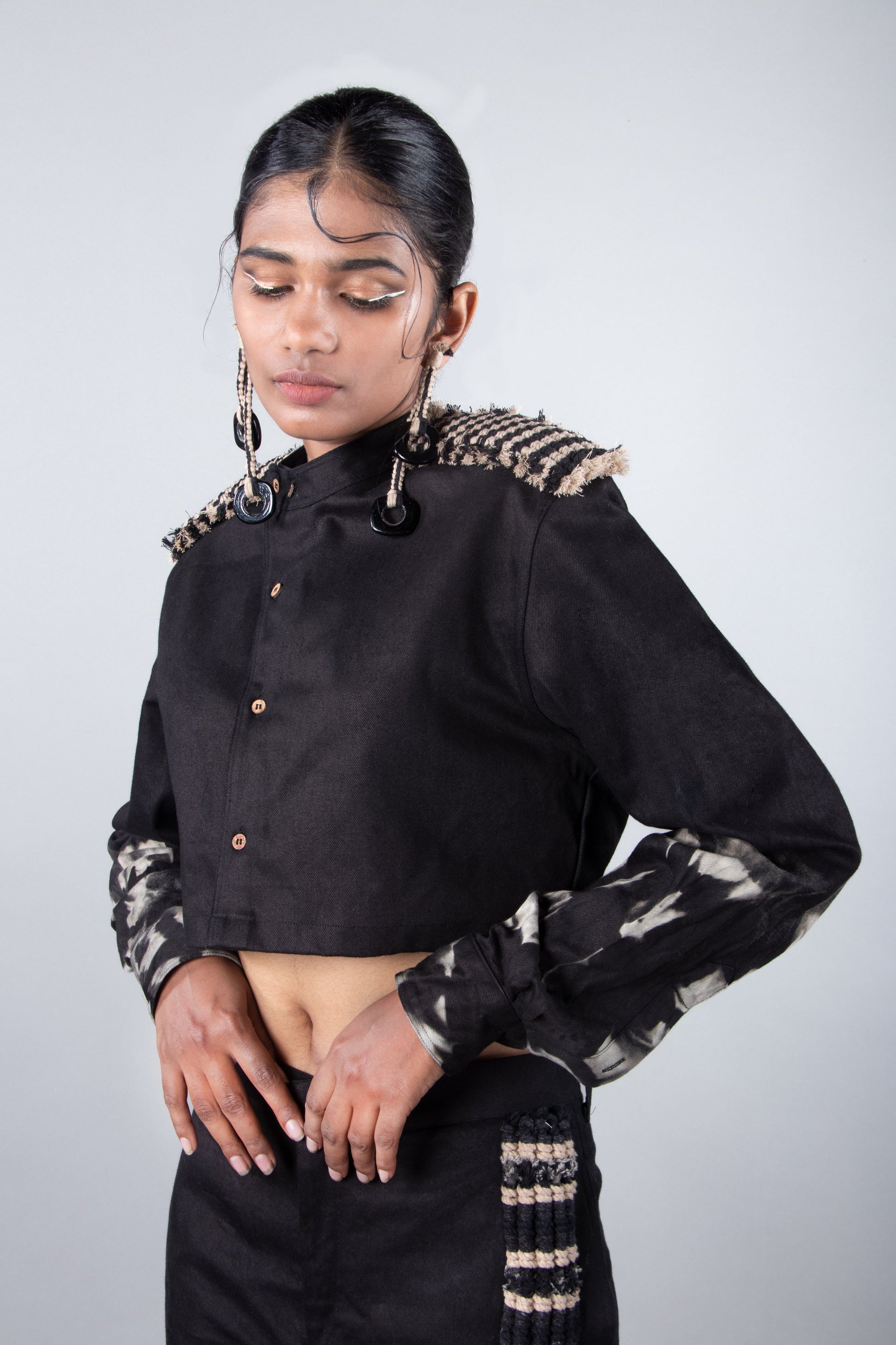 - Black cropped shirt with mandarin collar