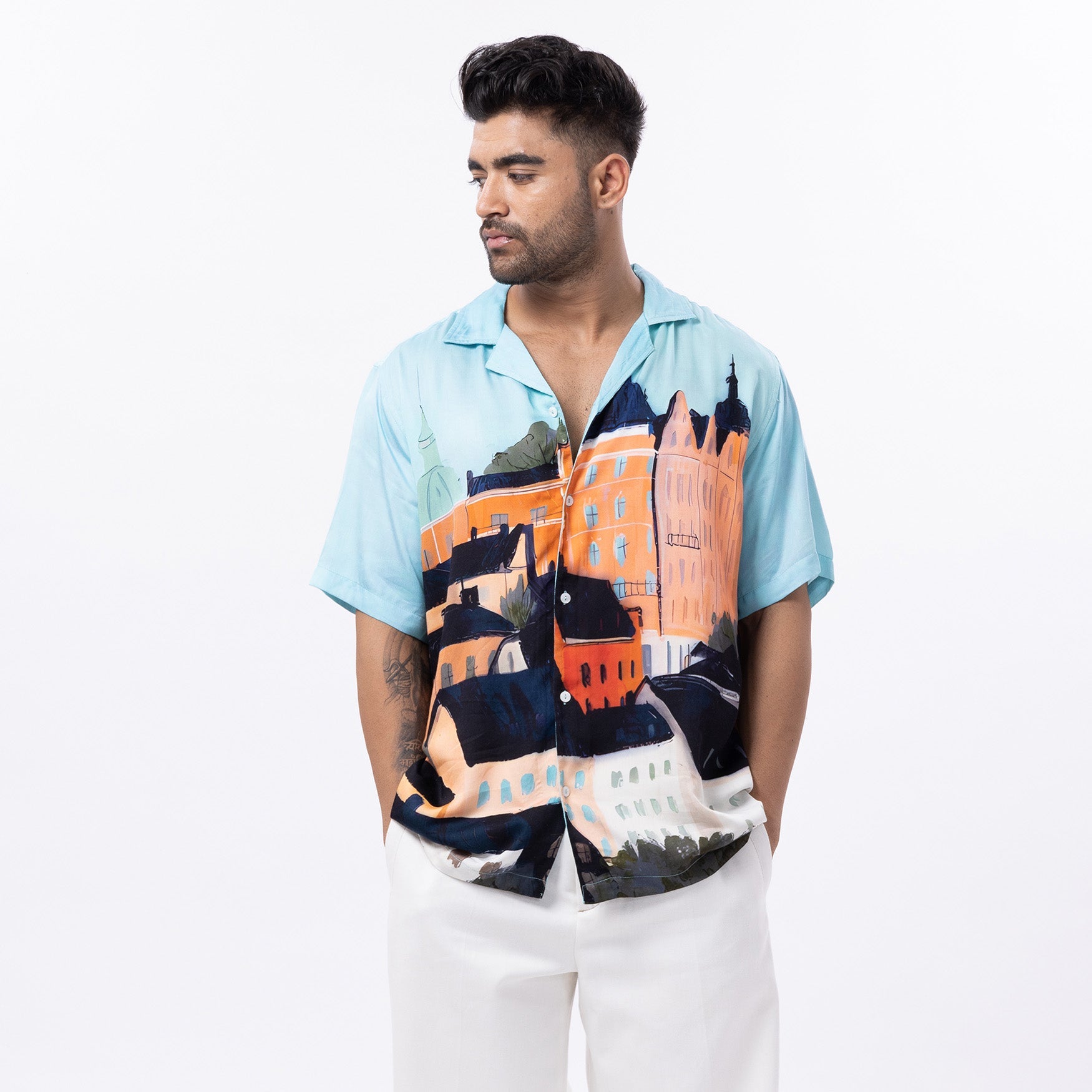 What's special about this shirt? An exceptional shirt which captures the romantic expression through the city's rooftops, adorned with chimneys and gables, create a charming backdrop that sets the stage for their love story.