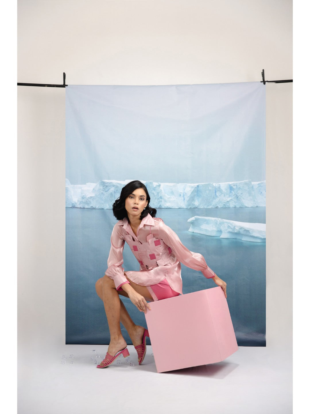 Our 3 piece set features an intricately crafted bodice adorned with squares, paired with a button-down organza shirt boasting a double cuff - one in contrast and one in a classic style, and high waist shorts with a striking contrast organza panel at the hem.