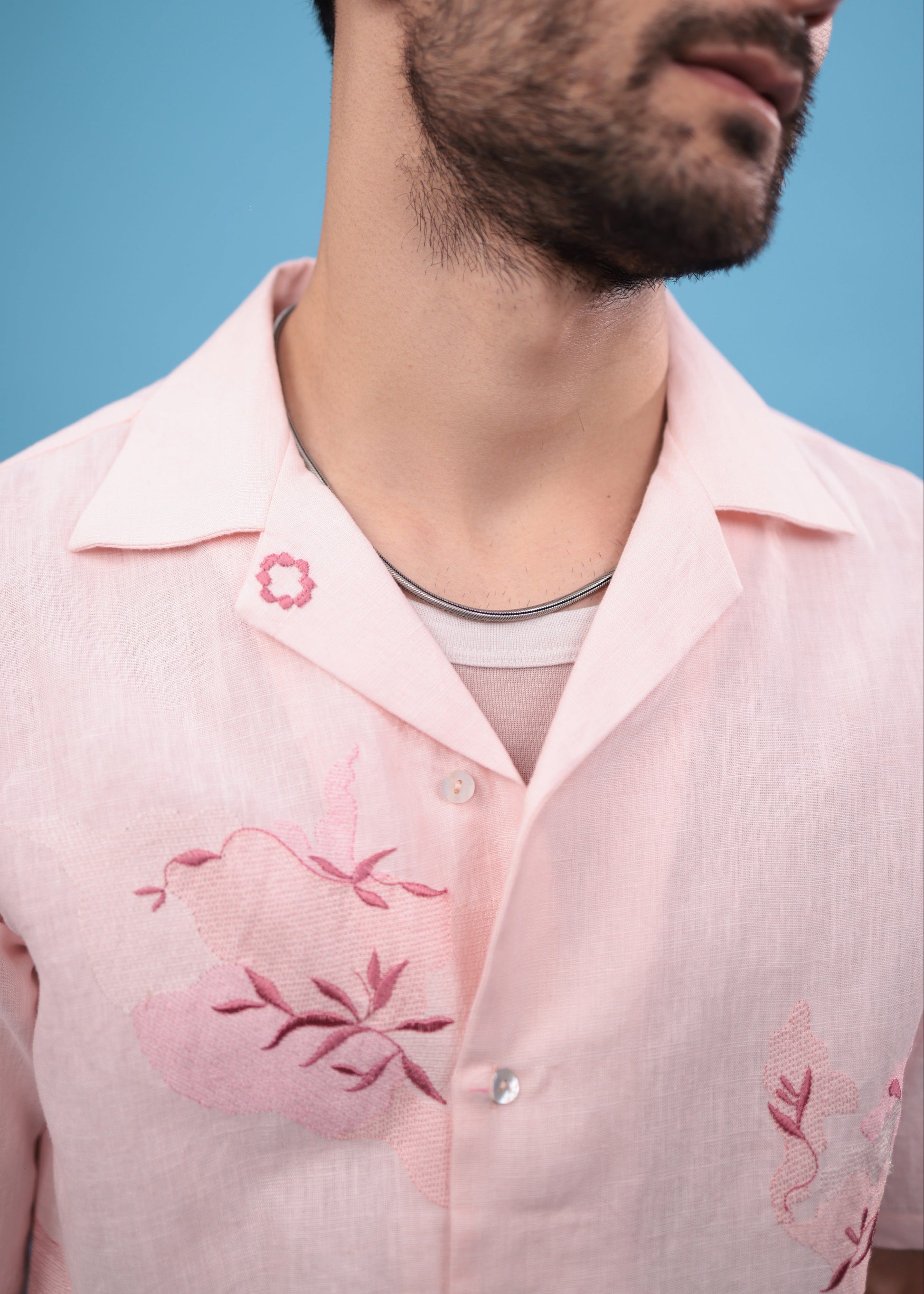 The Rosé Tides Shirt, crafted from a luxurious blend of linen and cotton, is inspired by the delicate pink hues of rosé wine savoured on sunlit shores and the tranquil rhythm of ocean tides. Adorning the fabric is intricate abstract floral embroidery, adding a touch of artistic flair and sophistication to the overall design. Featuring a relaxed camp collar, this shirt exudes a laid-back yet refined aesthetic, perfect for both casual and semi-formal occasions.
