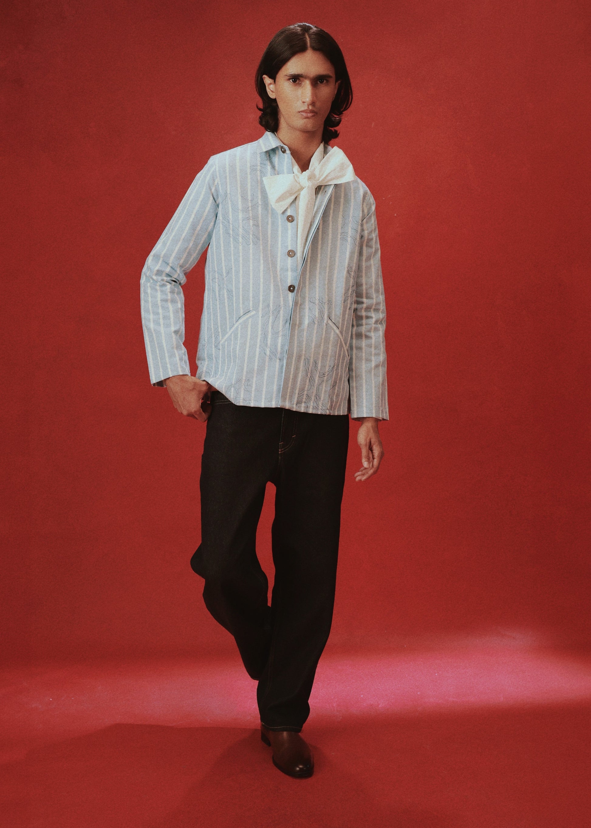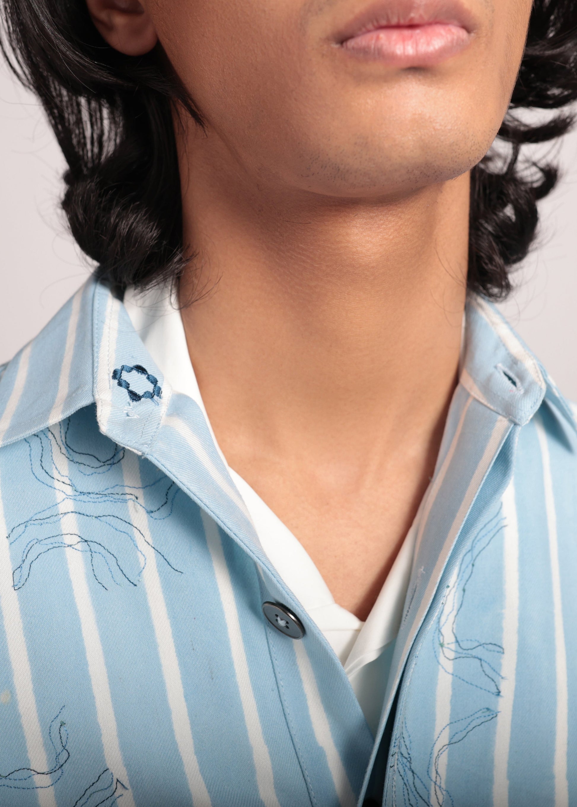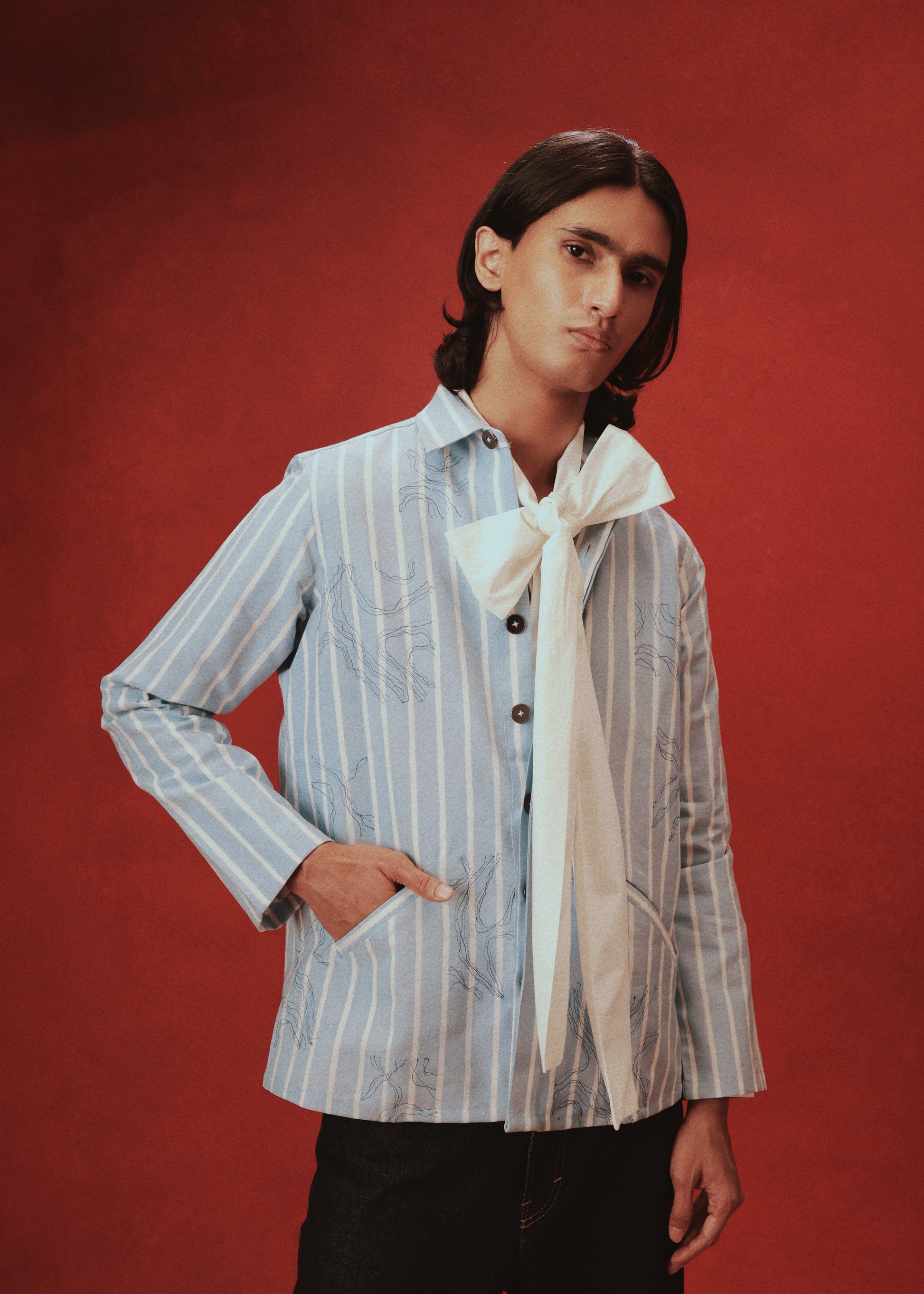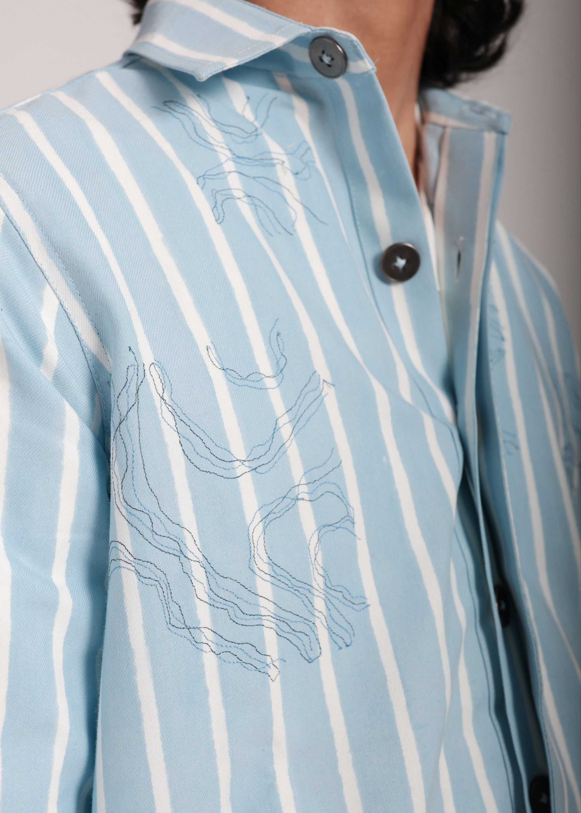 The Sapphire Horizon Shacket is a bold and versatile piece that embodies refined craftsmanship and contemporary style. Crafted from recycled yet premium cotton PET fabric, this shacket offers a structured yet relaxed silhouette that complements any outfit. The shacket is hand block printed and the body is enhanced with abstract embroidery adding an artistic touch to the ensemble. Designed for both comfort and style, this shacket is perfect for layering and a statement piece too.