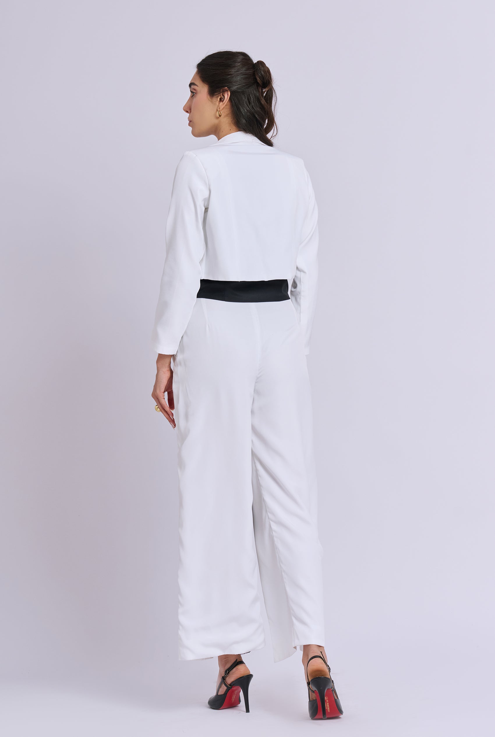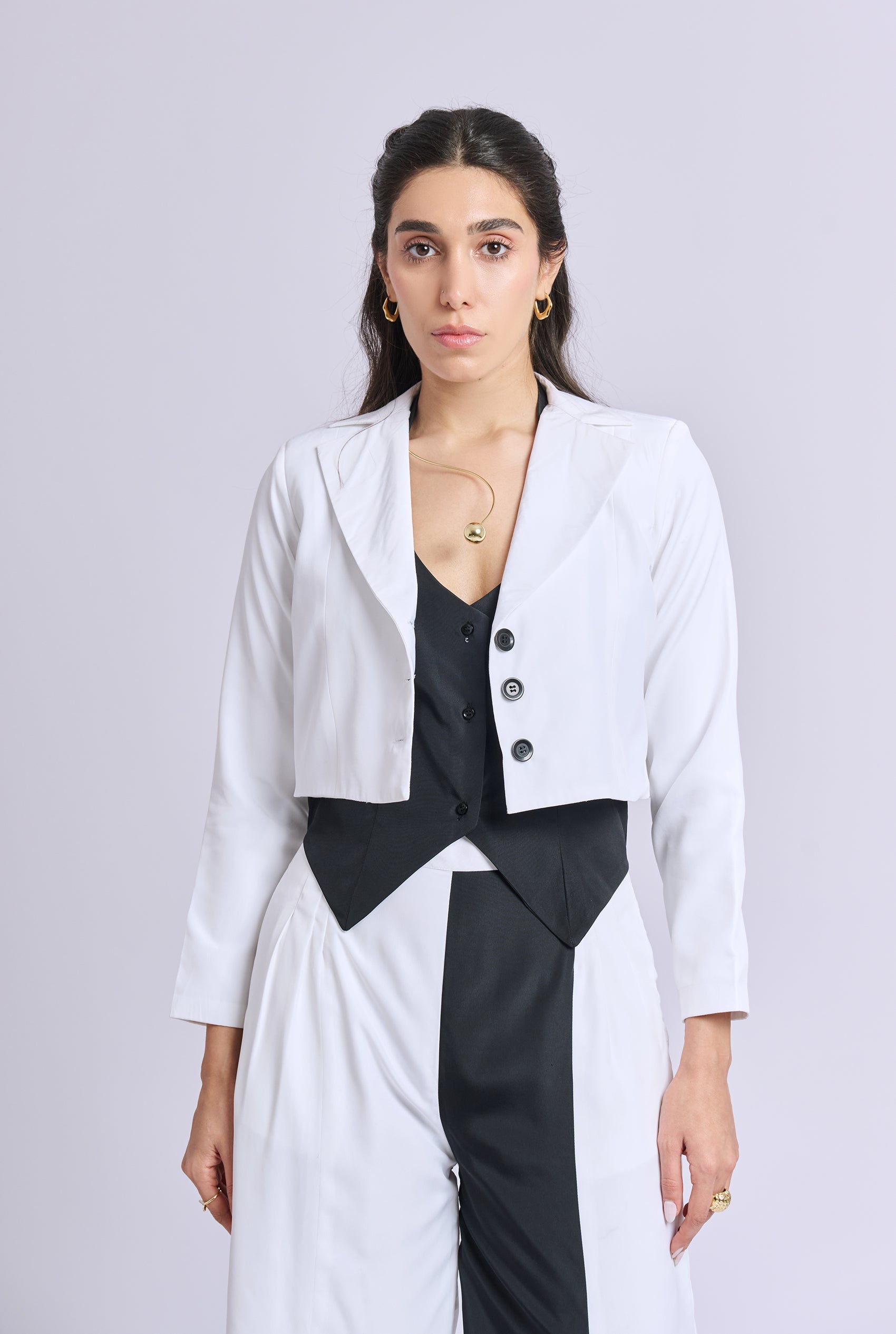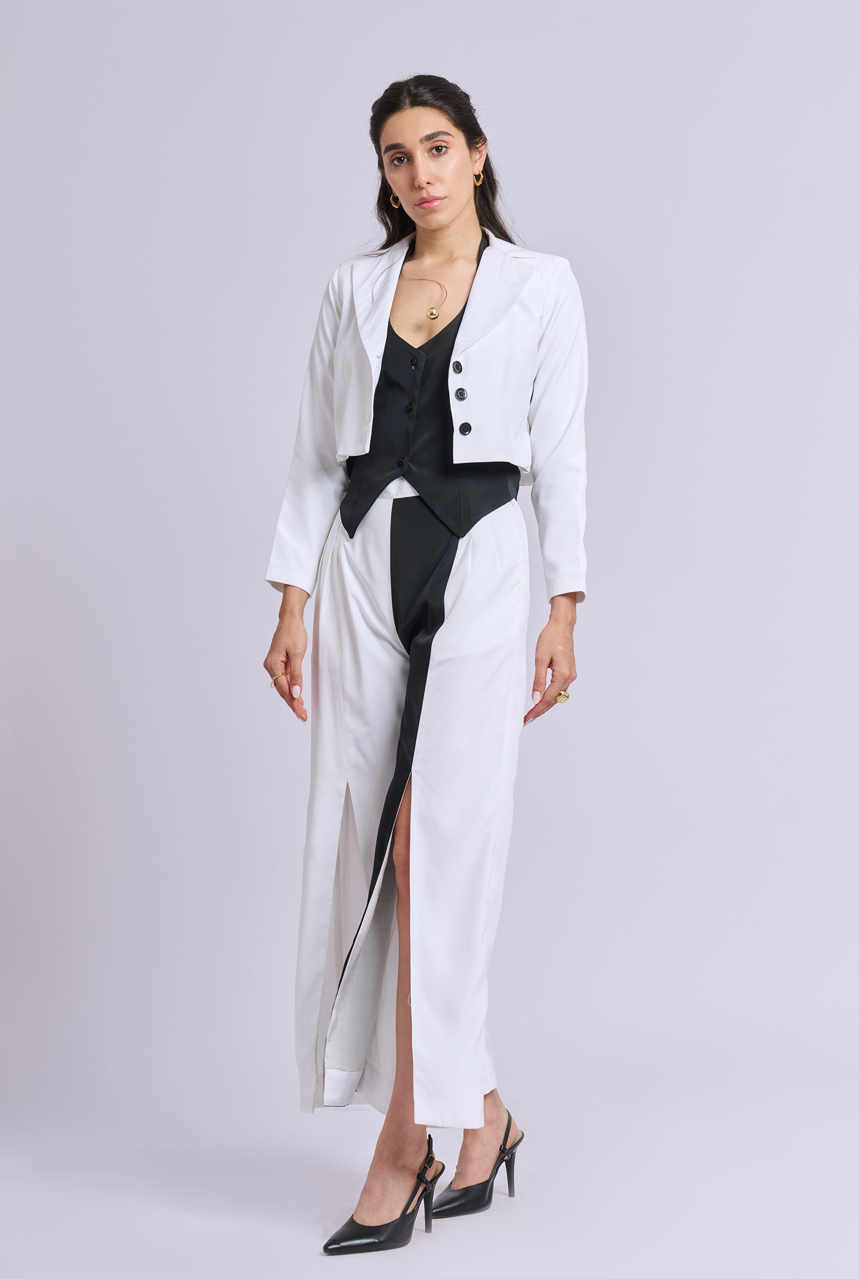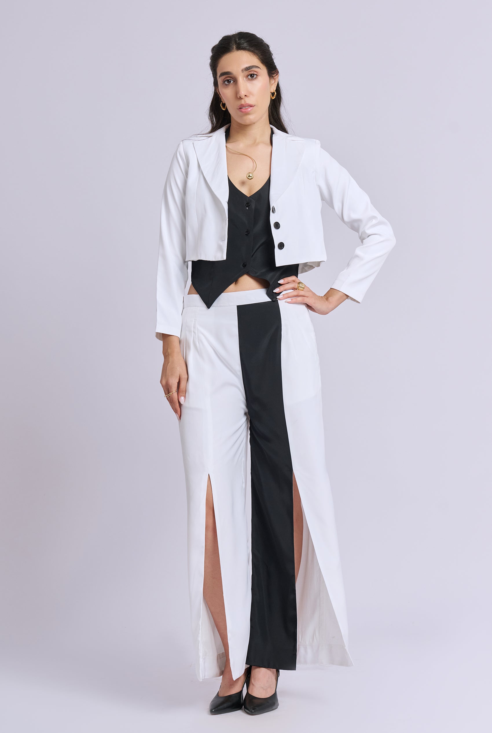 This three-piece coord set features a stylish monochrome look that combines statement with a modern edge. The short white blazer has full sleeves, giving it a chic and sharp appearance. The pants are designed with slits on the front on both sides, with one part in black for a bold, contrasting look. The black inner vest, with buttons, completes the outfit, adding a sleek and polished touch to the overall ensemble.