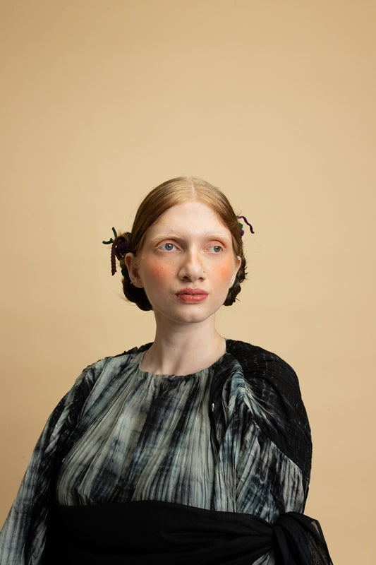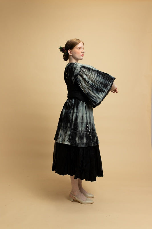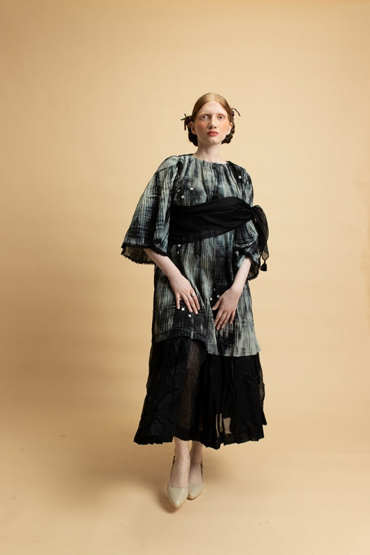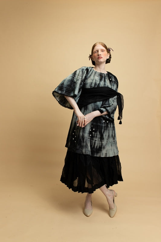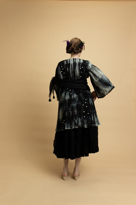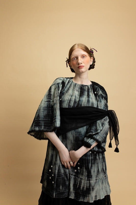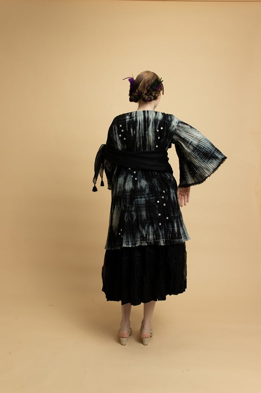 The Moon collection is created using soft cotton mal-mal that is heat pleated to create texture. The fabric is then tied and dyed into different colors of Scorpio black. The tunics are enhanced using hand mirrorwork embroidery details.