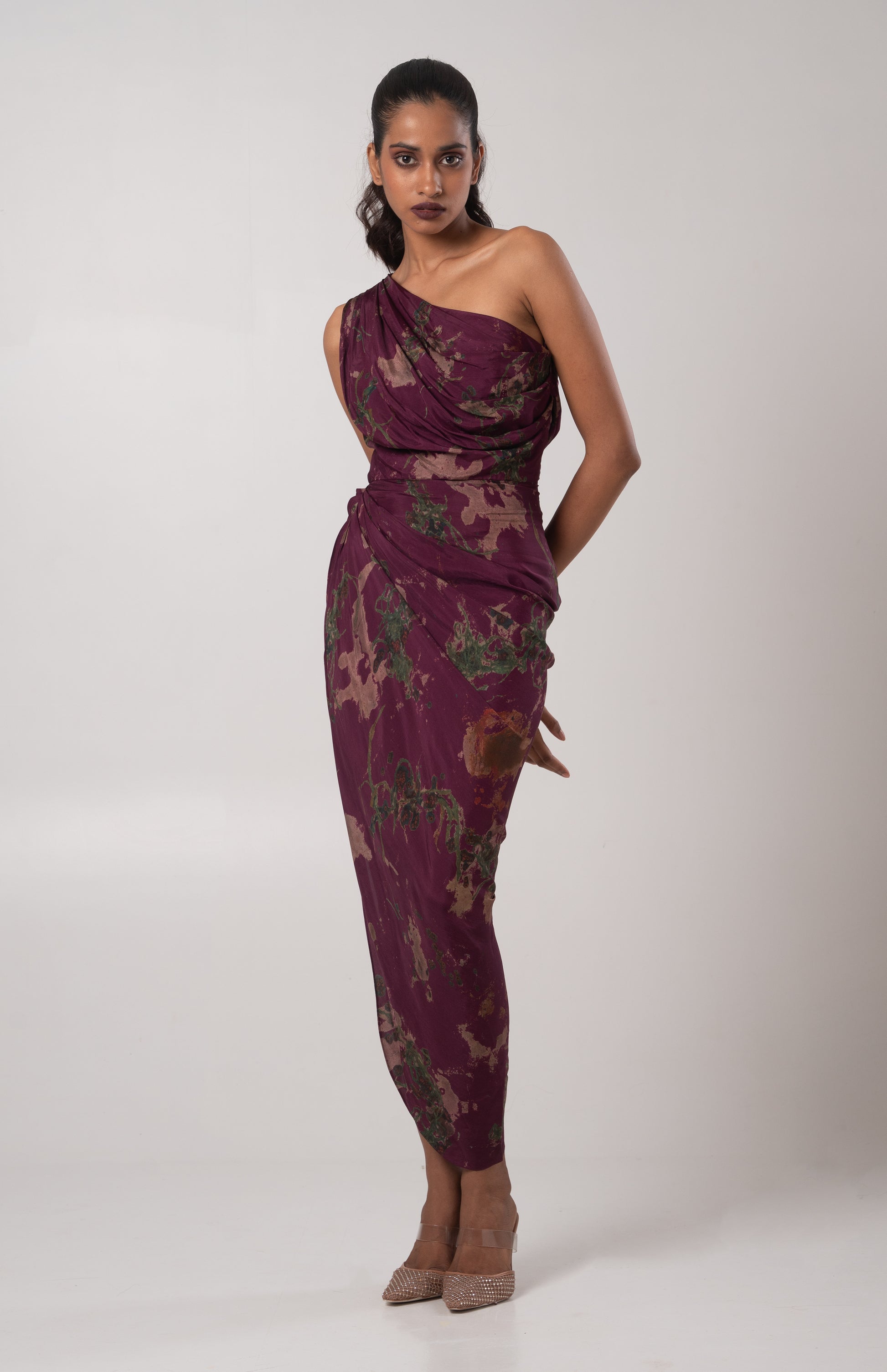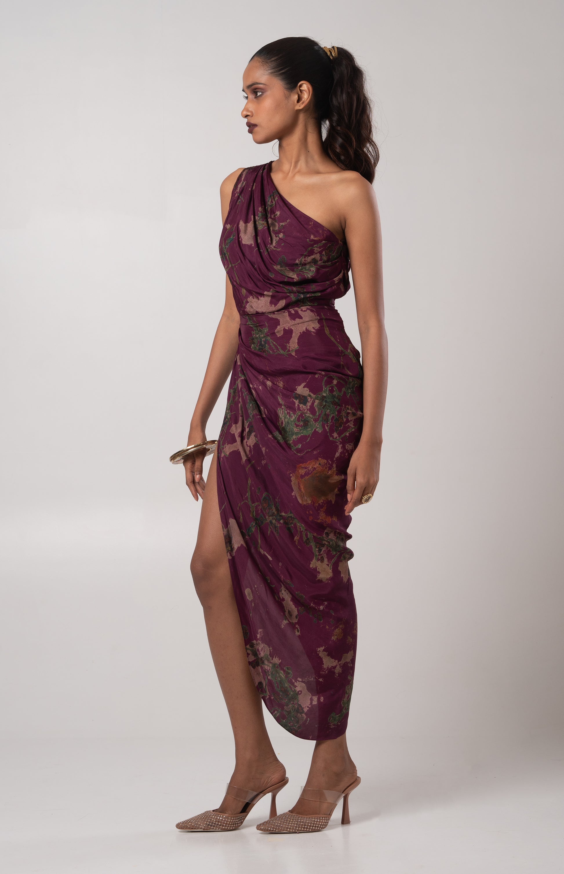 A one-shoulder dress with a fitted drape that accentuates the body, complemented by a side slit for better movement.