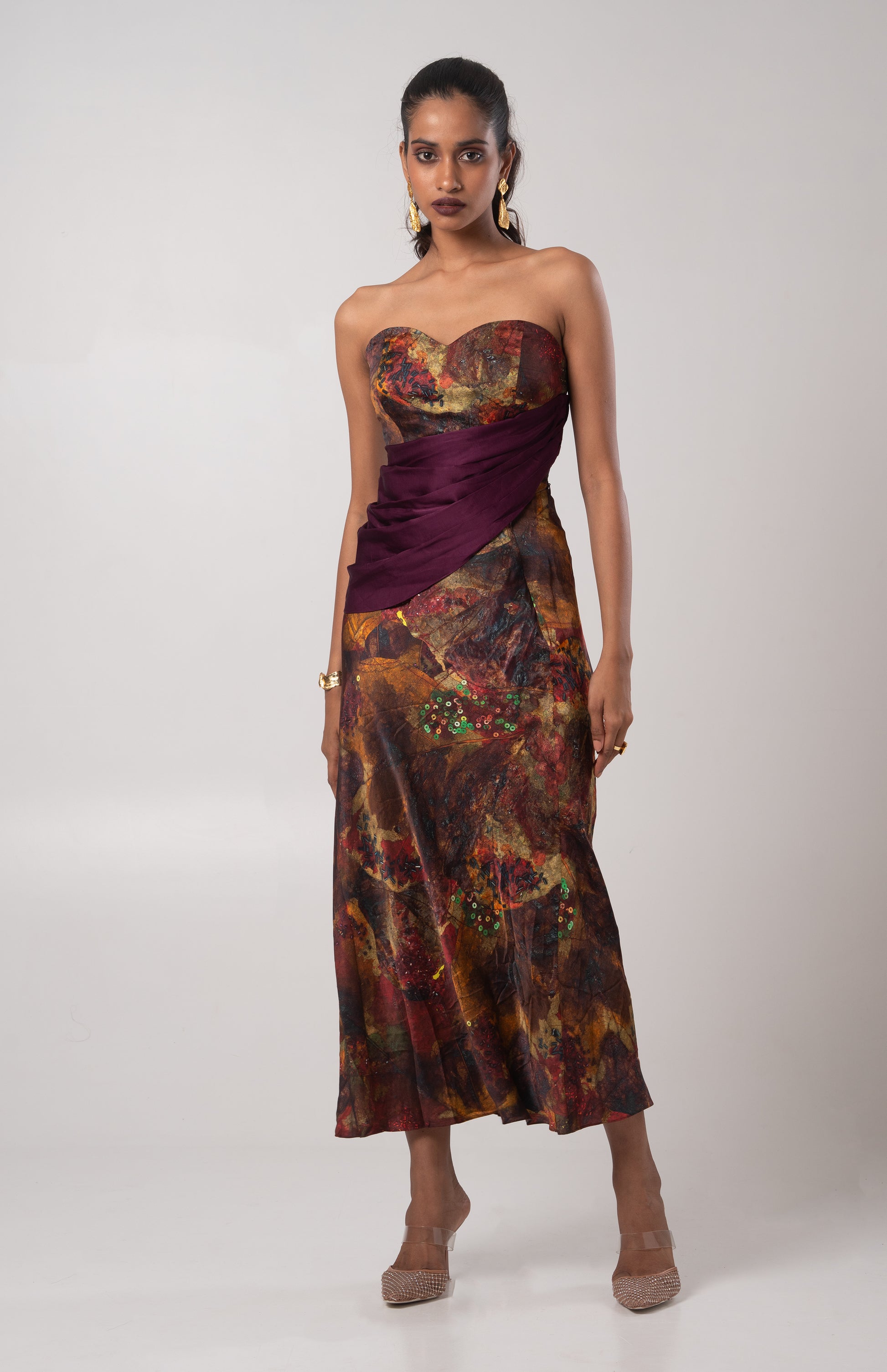 A corset with a detachable solid colour drape paired with a slinky bias cut skirt.