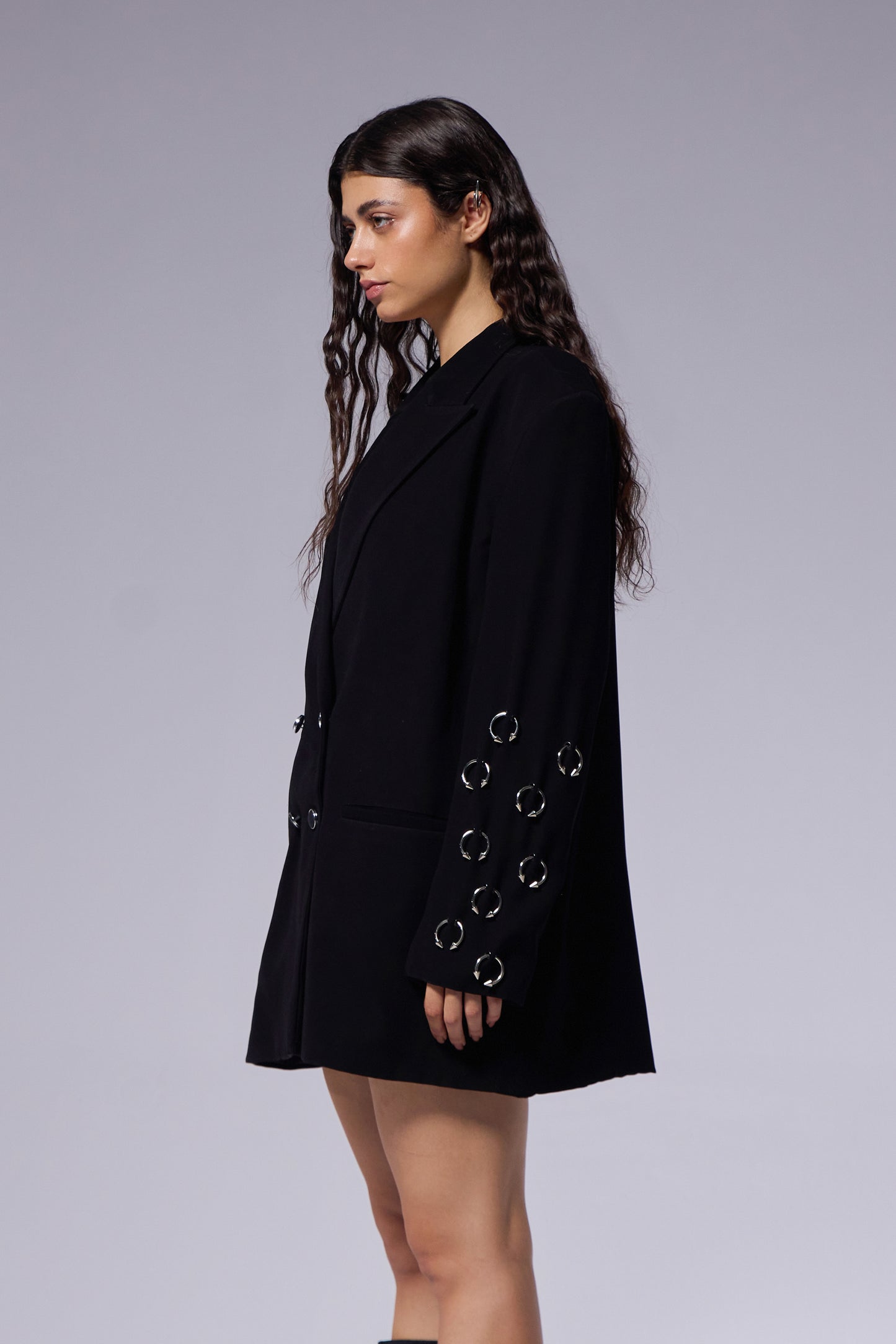 This oversized black blazer redefines modern tailoring with its bold and edgy details. The metal septums adorning the sleeves create a standout feature.
