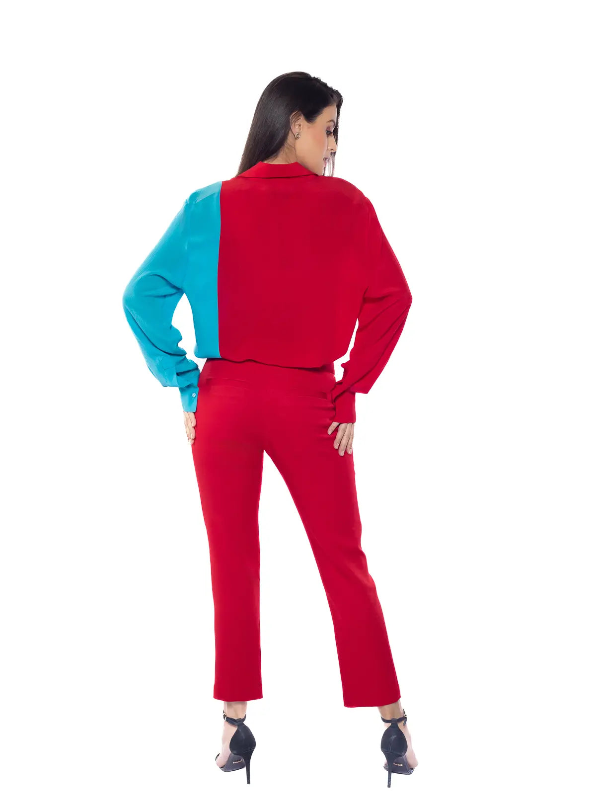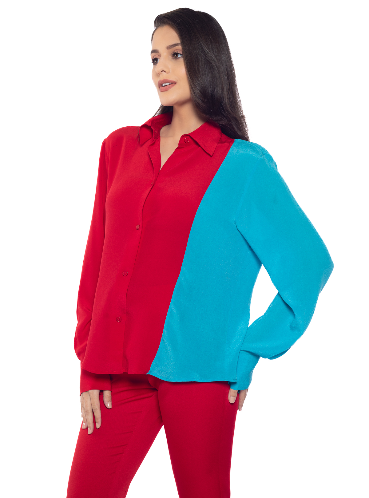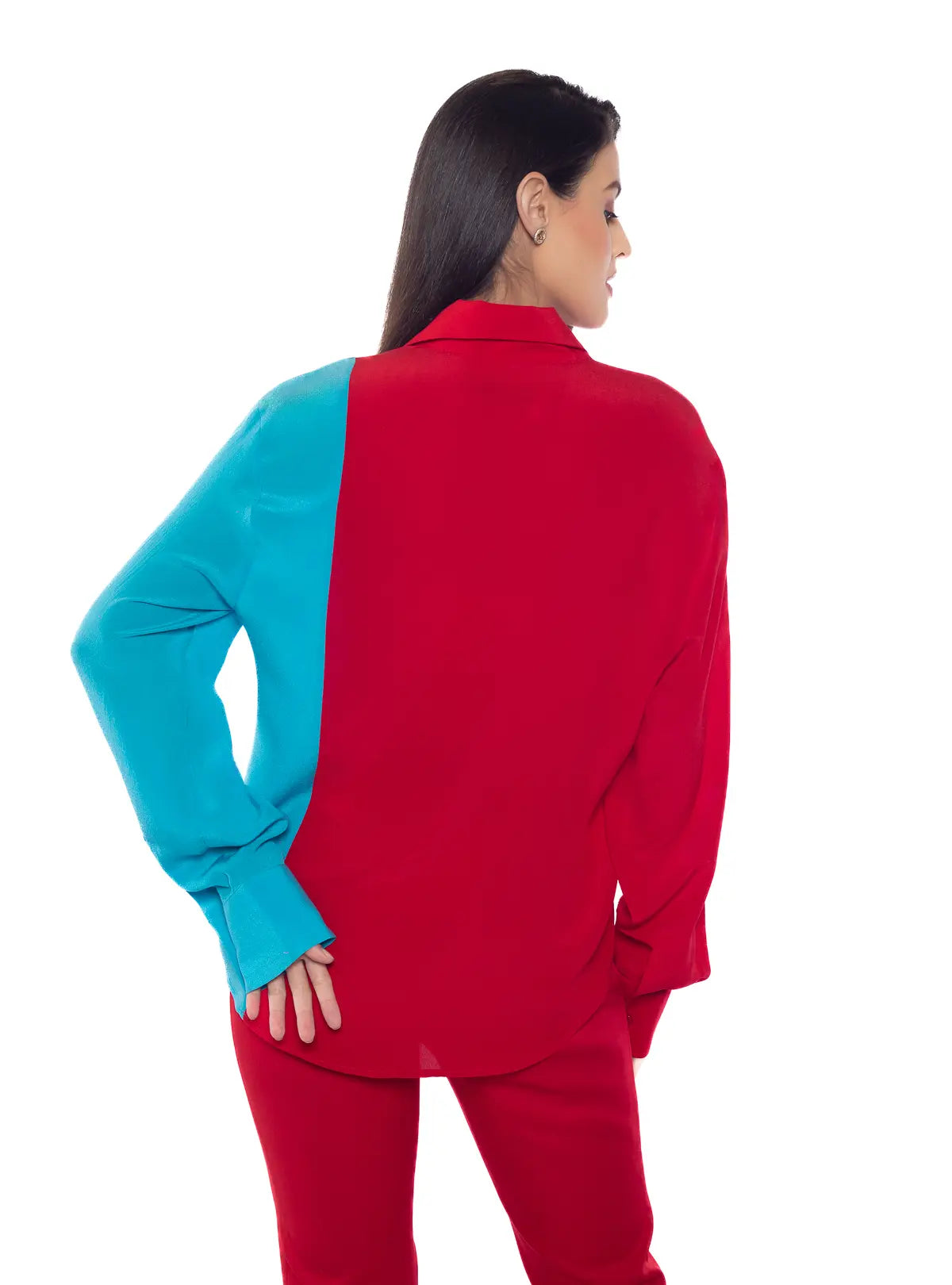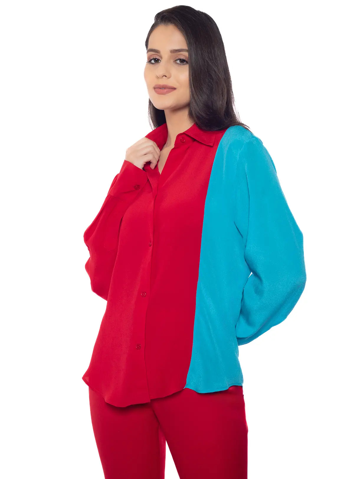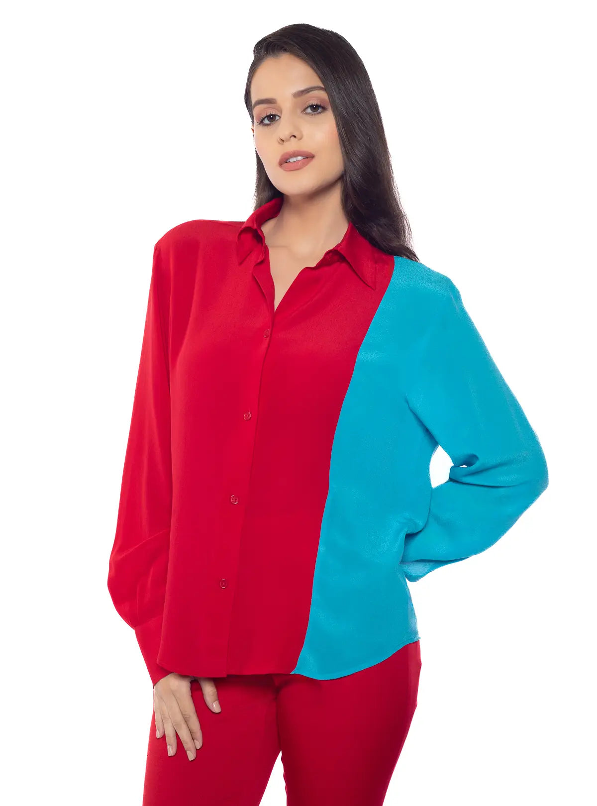 The Dual-Tone Fluid Shirt offers effortless elegance with a modern twist. Its striking color block panels create bold visual contrast while maintaining a clean, minimalist design. The fluid drape enhances comfort, making it perfect for both work and off-duty styling. Finished with a classic collar and button-down front, this statement piece balances the contemporary edge with timeless versatility.