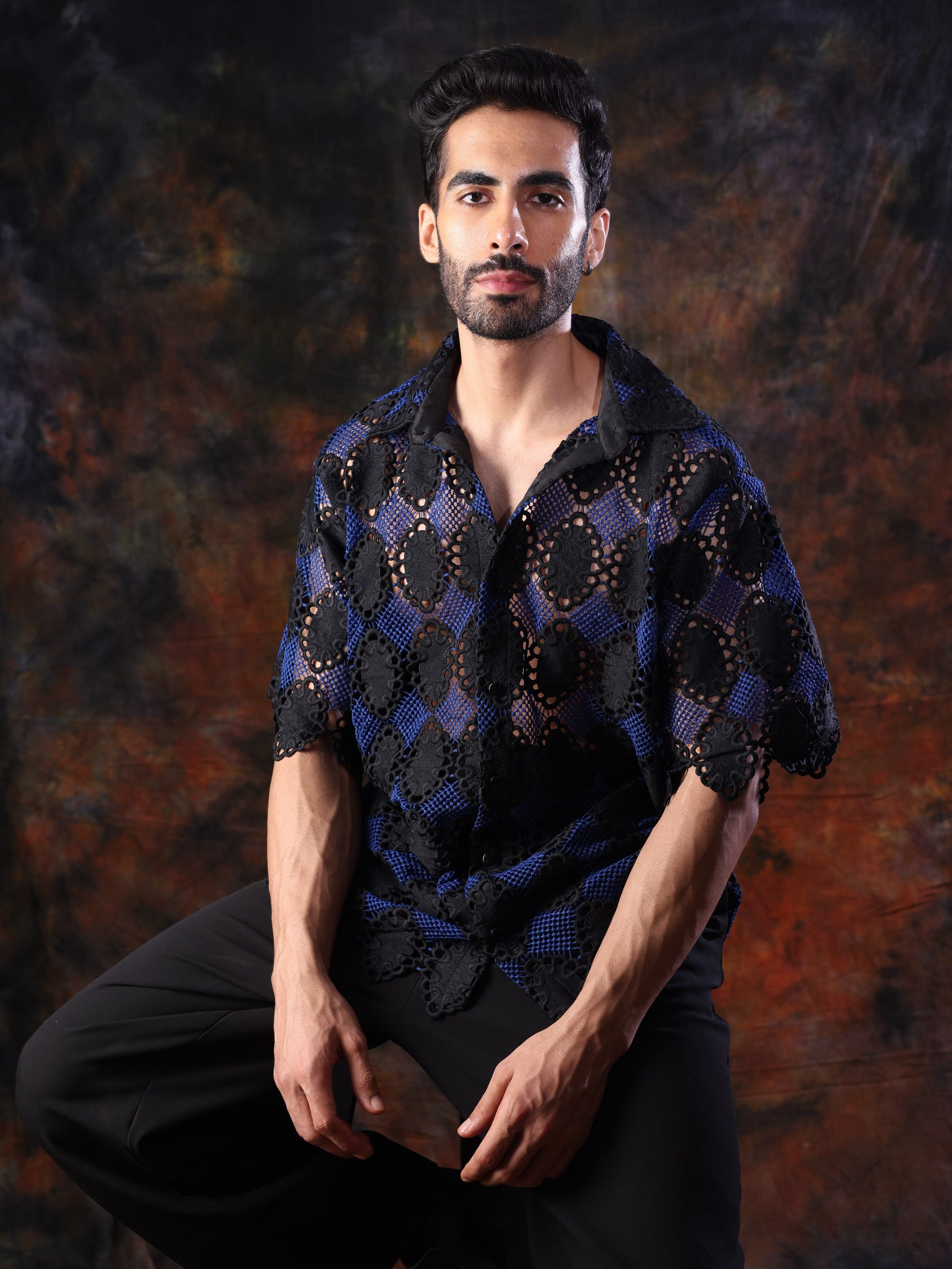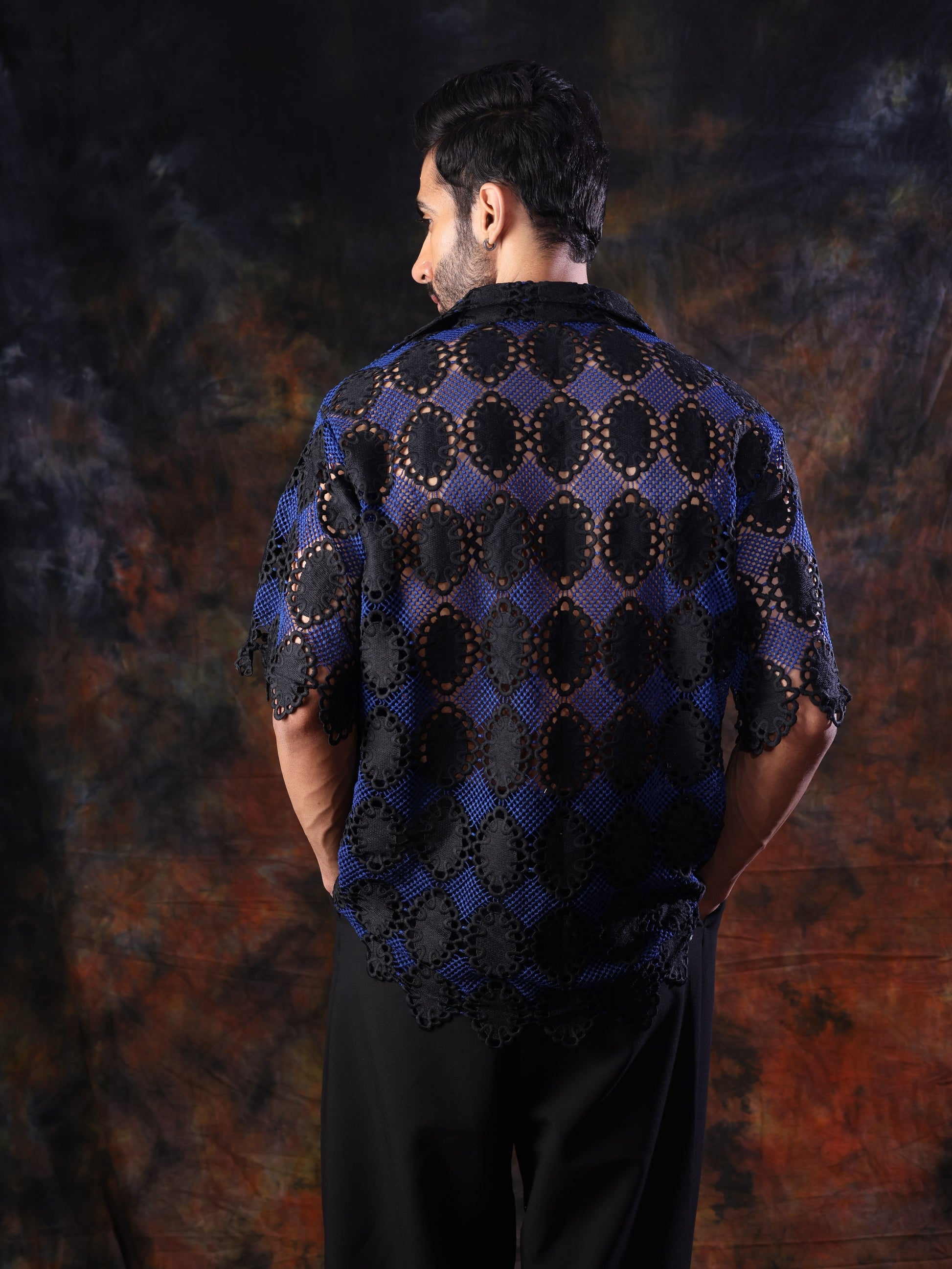 Elevate your style with our Mosaic Shirt, crafted from intricate black crochet lace layered over a rich cobalt blue mesh. This statement piece features a relaxed silhouette, short sleeves, and a sharp collar — perfect for those who appreciate bold textures and standout designs. Whether styled for a night out or layered for a fashion-forward daytime look, this shirt blends modern edge with timeless craftsmanship.
