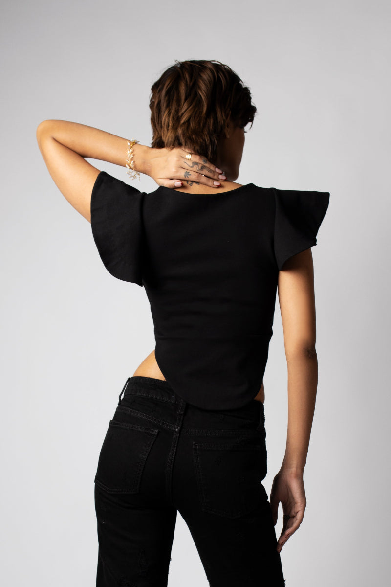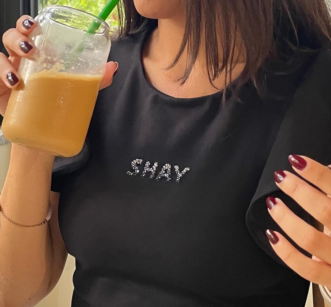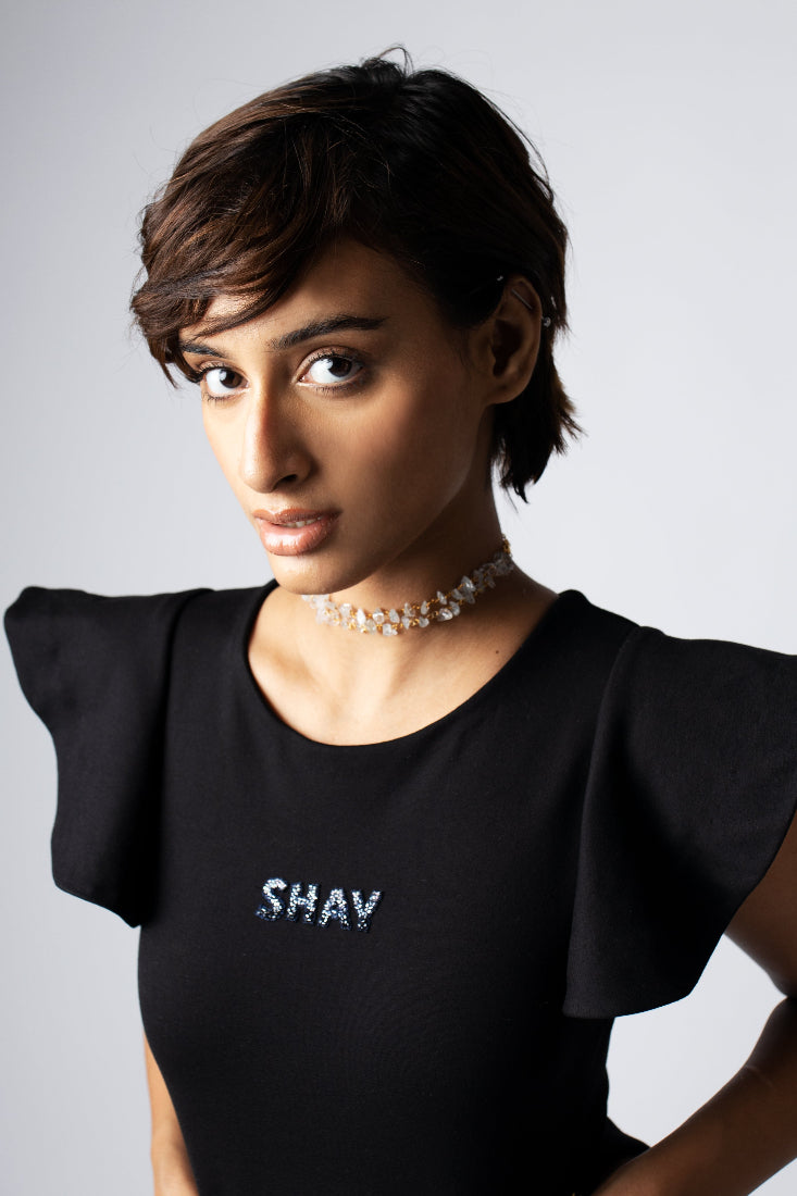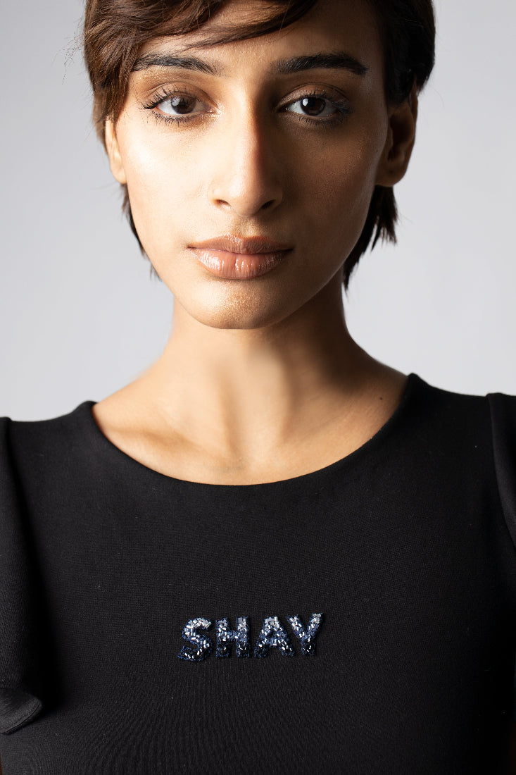 Shay's exclusive embellished lettering with seductive waist cut-out.
