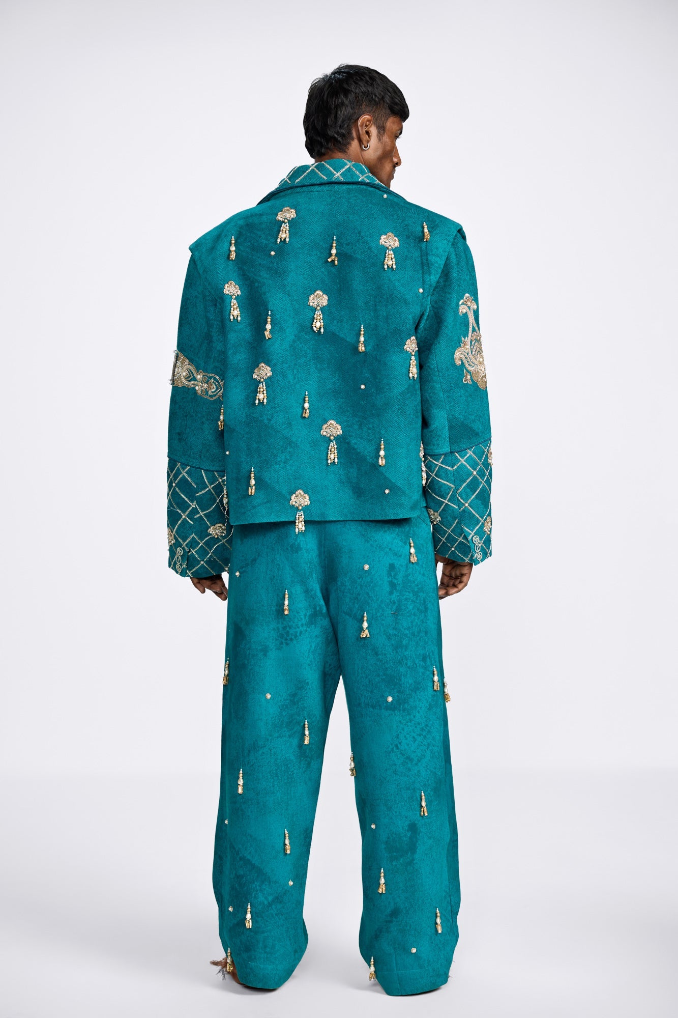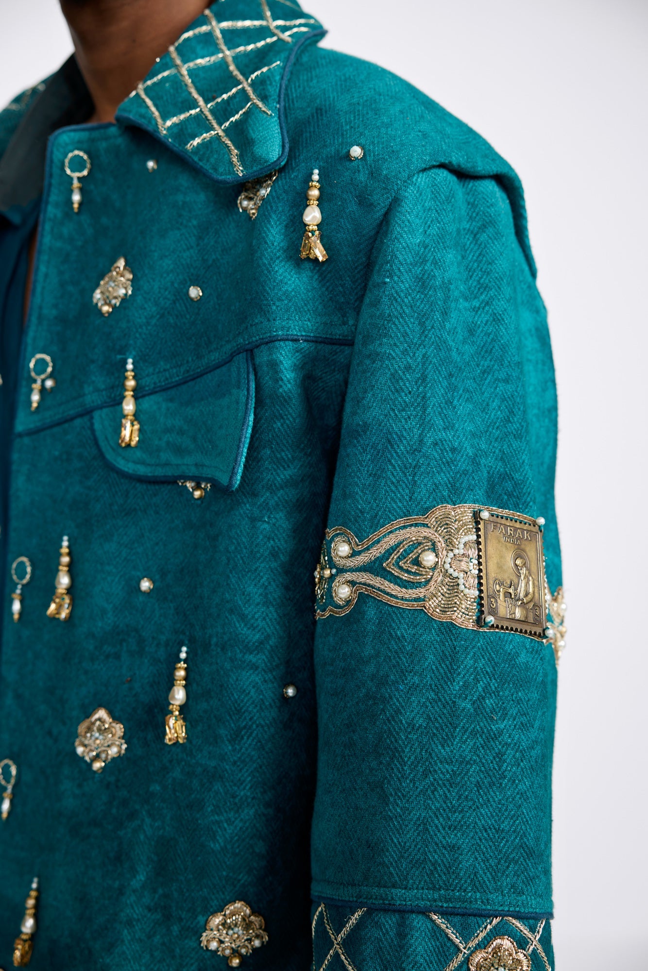 Majestic in detail, grounded in craft — the Shehzaada Jacket brings royal nostalgia to the now. With hand-embroidered florals and structured layering, it fuses regal flair with street-edge cool. The quilted sleeves and golden motifs whisper tales of darbars and dynasties, while the bold cut reclaims that history with confidence. This is Farak’s take on modern royalty — not inherited, but earned, stitched with pride and presence.