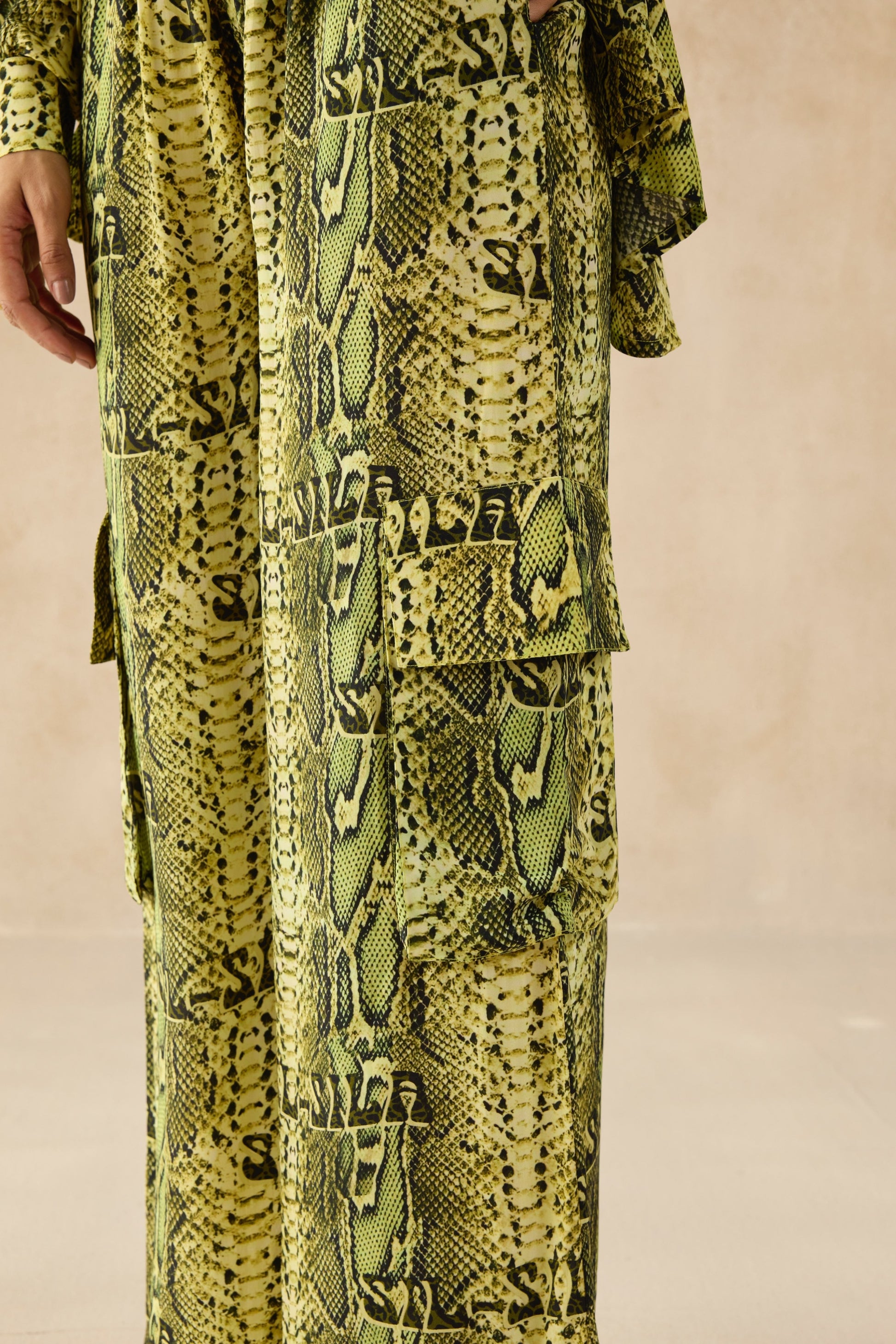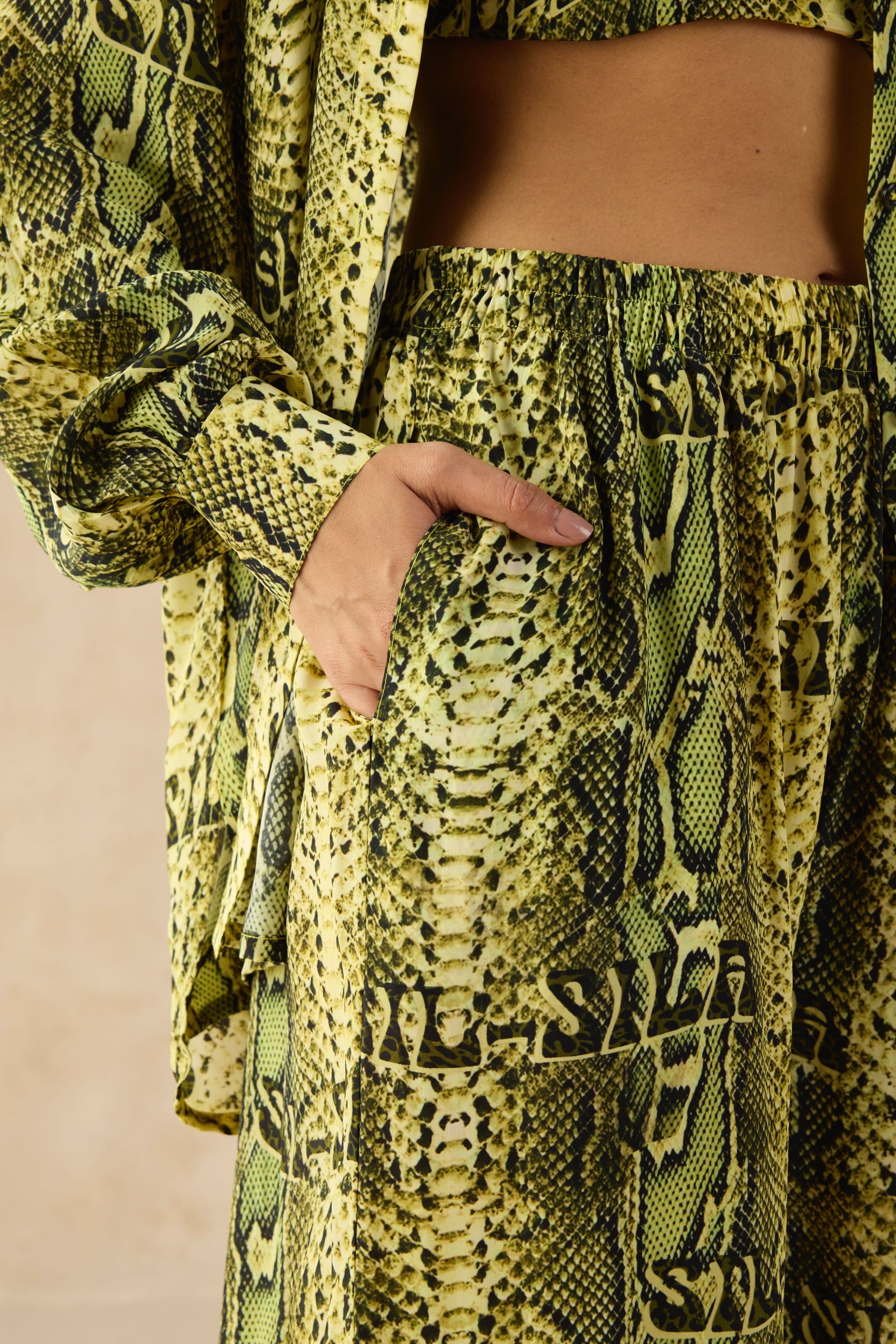 Turn heads with this statement Snake Print Co-ord Set featuring bold Sil Sila typography. Crafted from lightweight crepe fabric, it offers a flowy, breathable feel. The striking snake print adds an edgy touch, making it perfect for effortless styling—whether you’re dressing up or keeping it casual. Fabric: Crepe