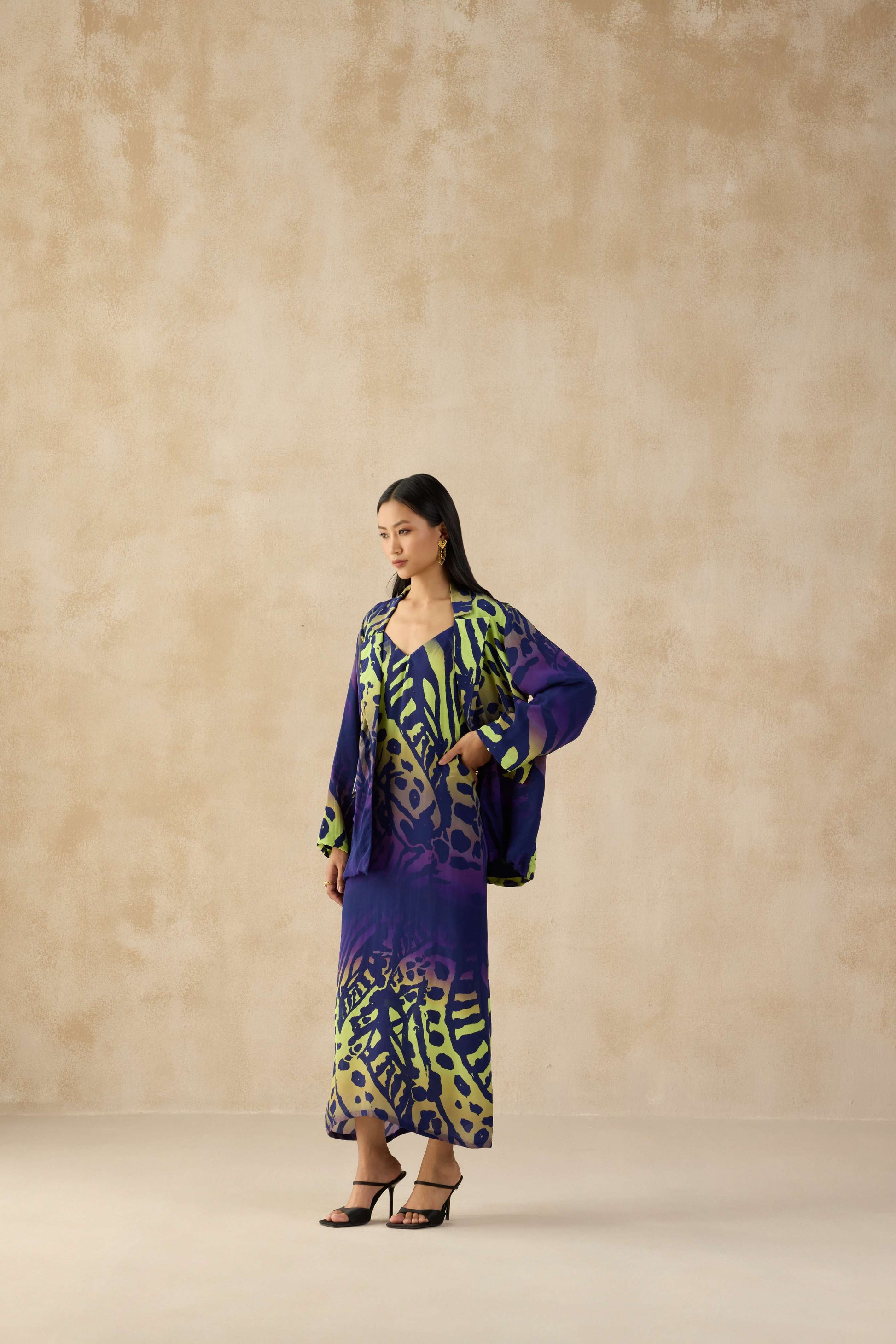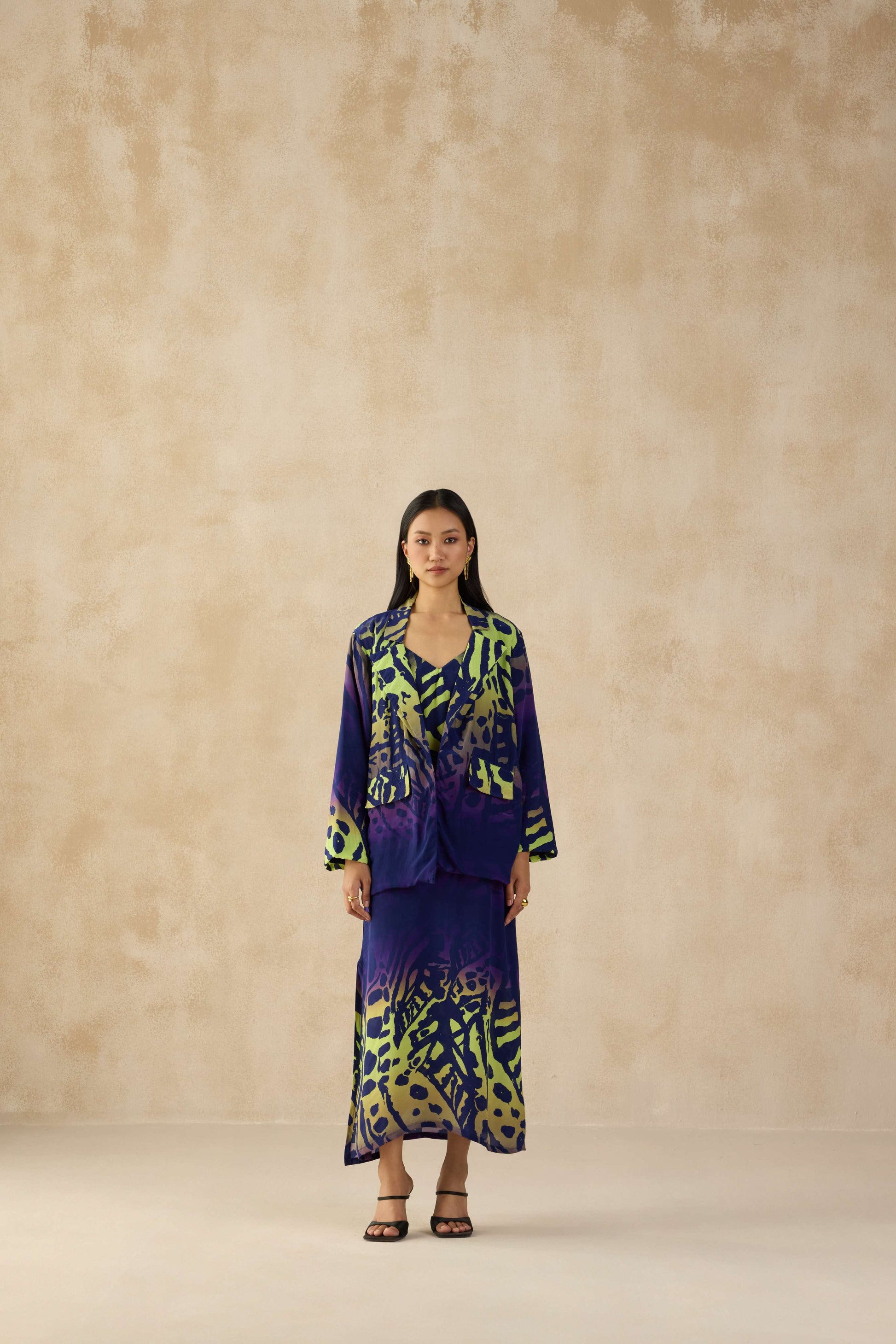 Step into power dressing with the Rio Blazer, a masterpiece of bold expression and effortless style. Featuring an electrifying neon and deep blue animal print, this oversized blazer is a head-turner that embodies confidence and flair. The fluid silhouette, relaxed fit, and statement lapels make it a versatile piece—perfect for layering over dresses or adding an edge to minimalistic outfits. With its lightweight crepe fabric and striking contrast hues, the Rio Blazer is designed for those who dare to stand out.