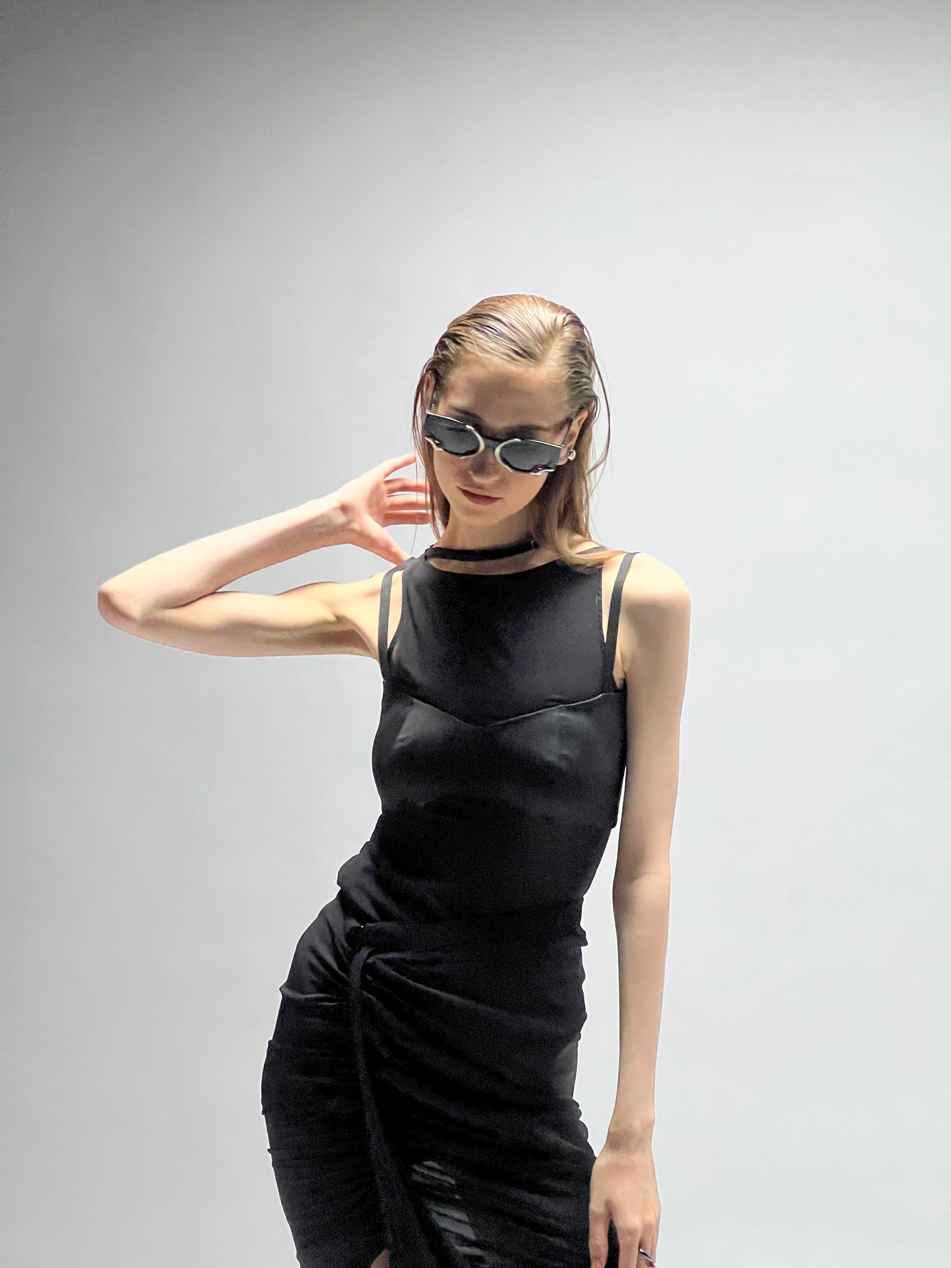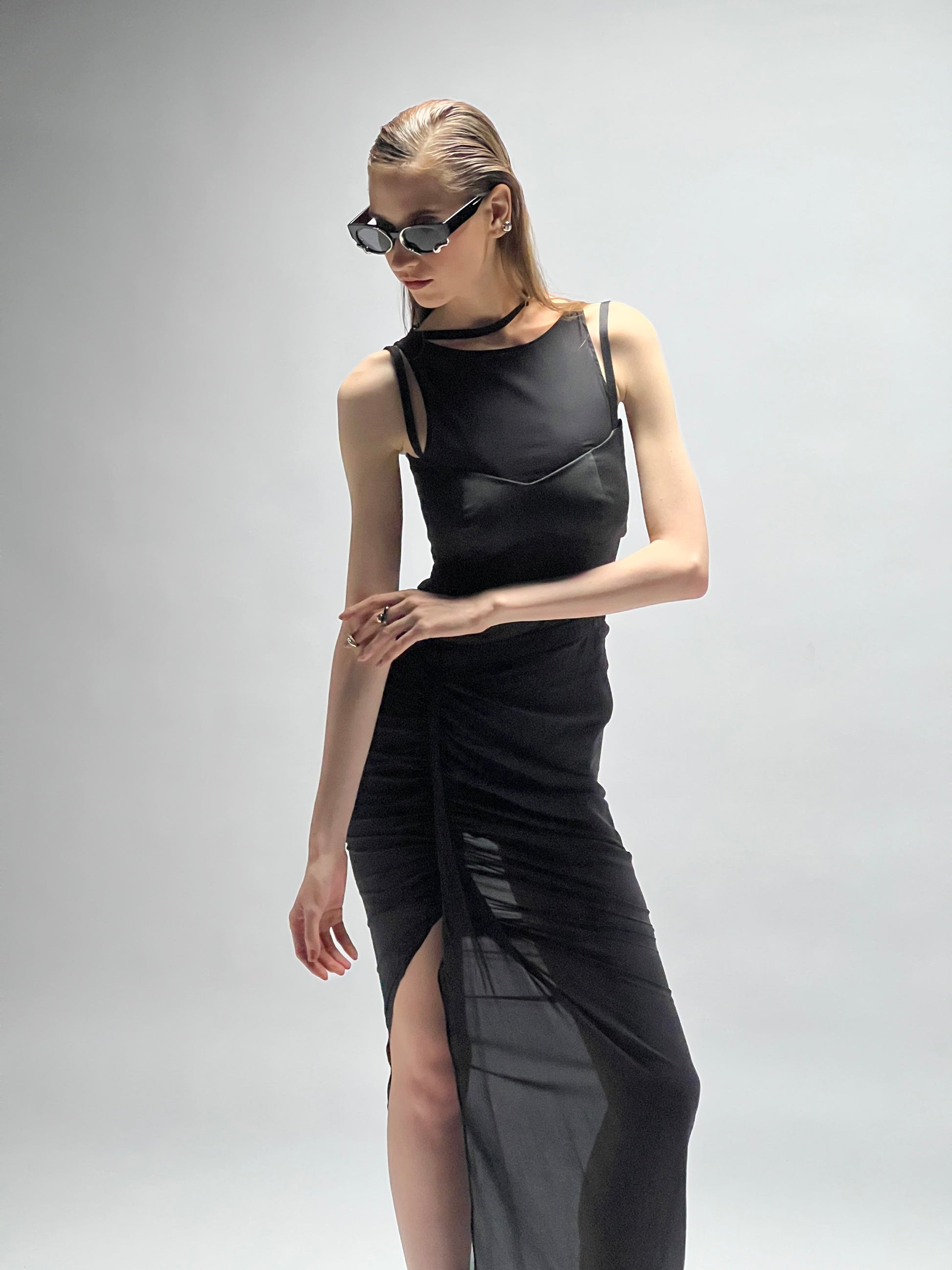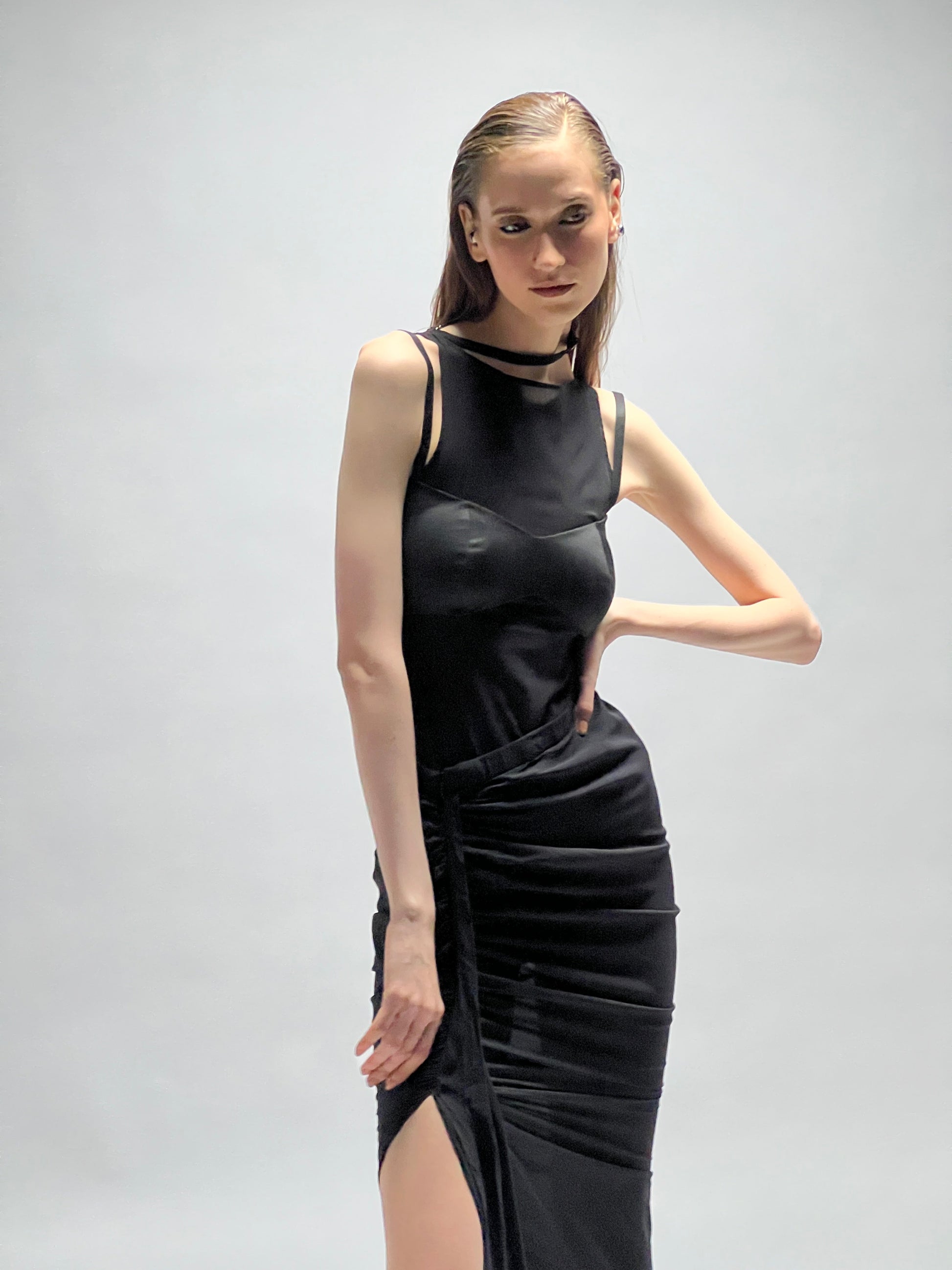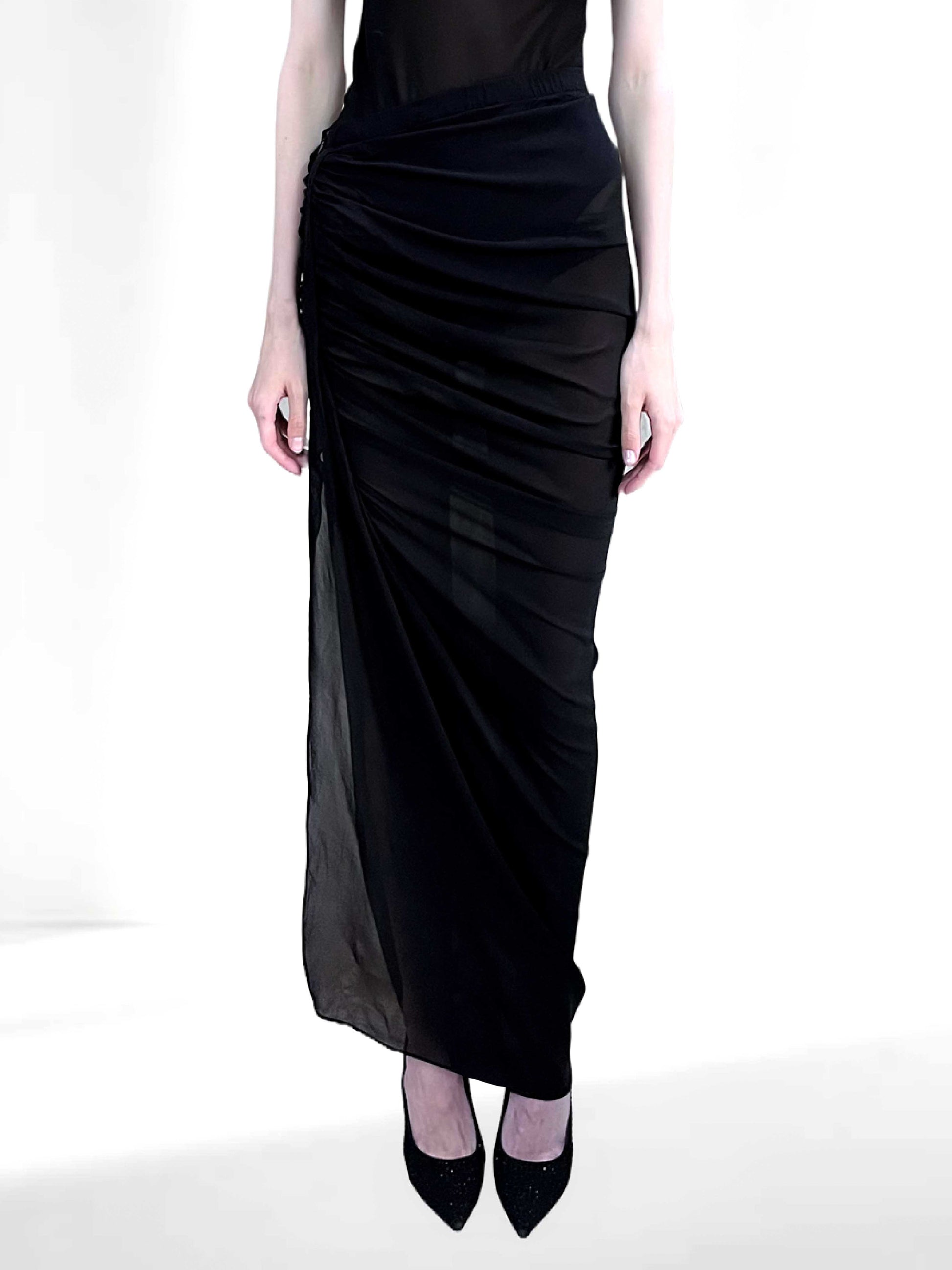 Pure silk stretch fabric in soft chiffon, draped on one side for a luxurious, sculpted look. The full-length maxi skirt features a dramatic side slit, finished with a stretch belt and concealed side zip fastening. Each skirt is hand-draped individually to ensure every piece has its own distinct flow.