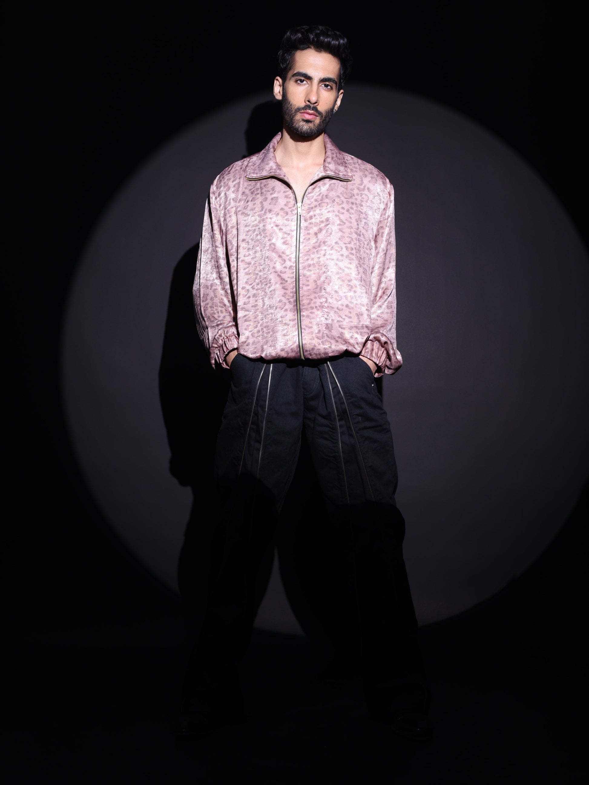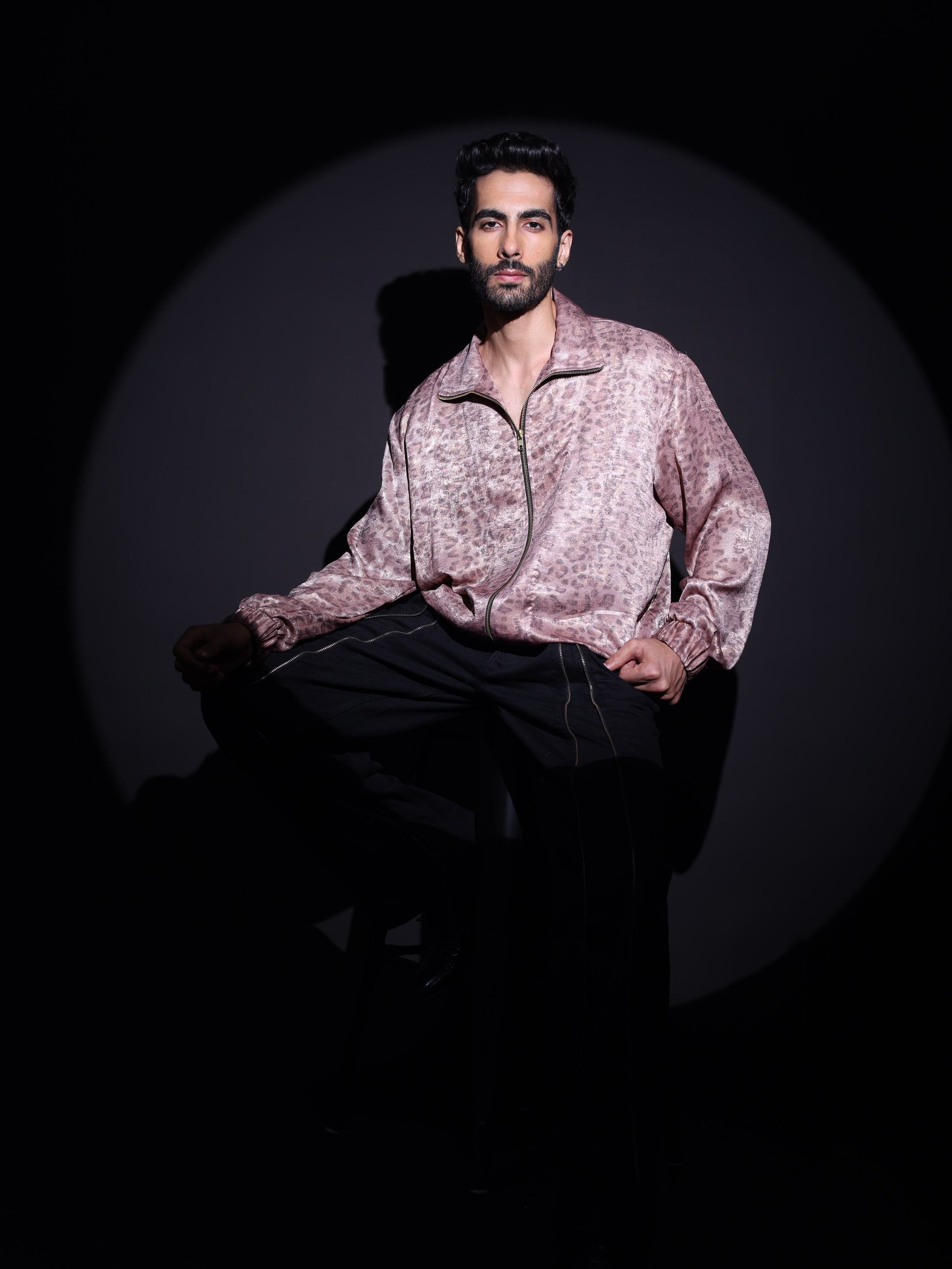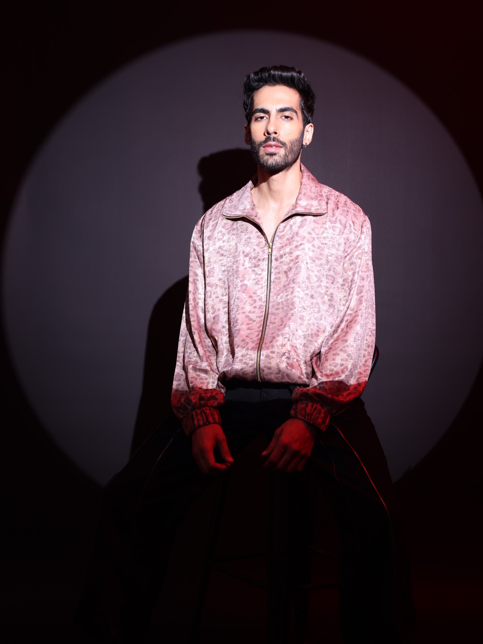 The Silk Smoke Jacket is a poetic contradiction — soft in hue, bold in silhouette. Designed in a dusty blush base with textured floral shimmer, the relaxed bomber-style shape is elevated by elastic cuffs, a statement zipper, and a fluid, barely-there sheen. Under low light, the jacket glows with a muted luster, making it perfect for dusky soirées, rooftop nights, or art-forward dressing. Masculinity meets romance in this quietly powerful piece.