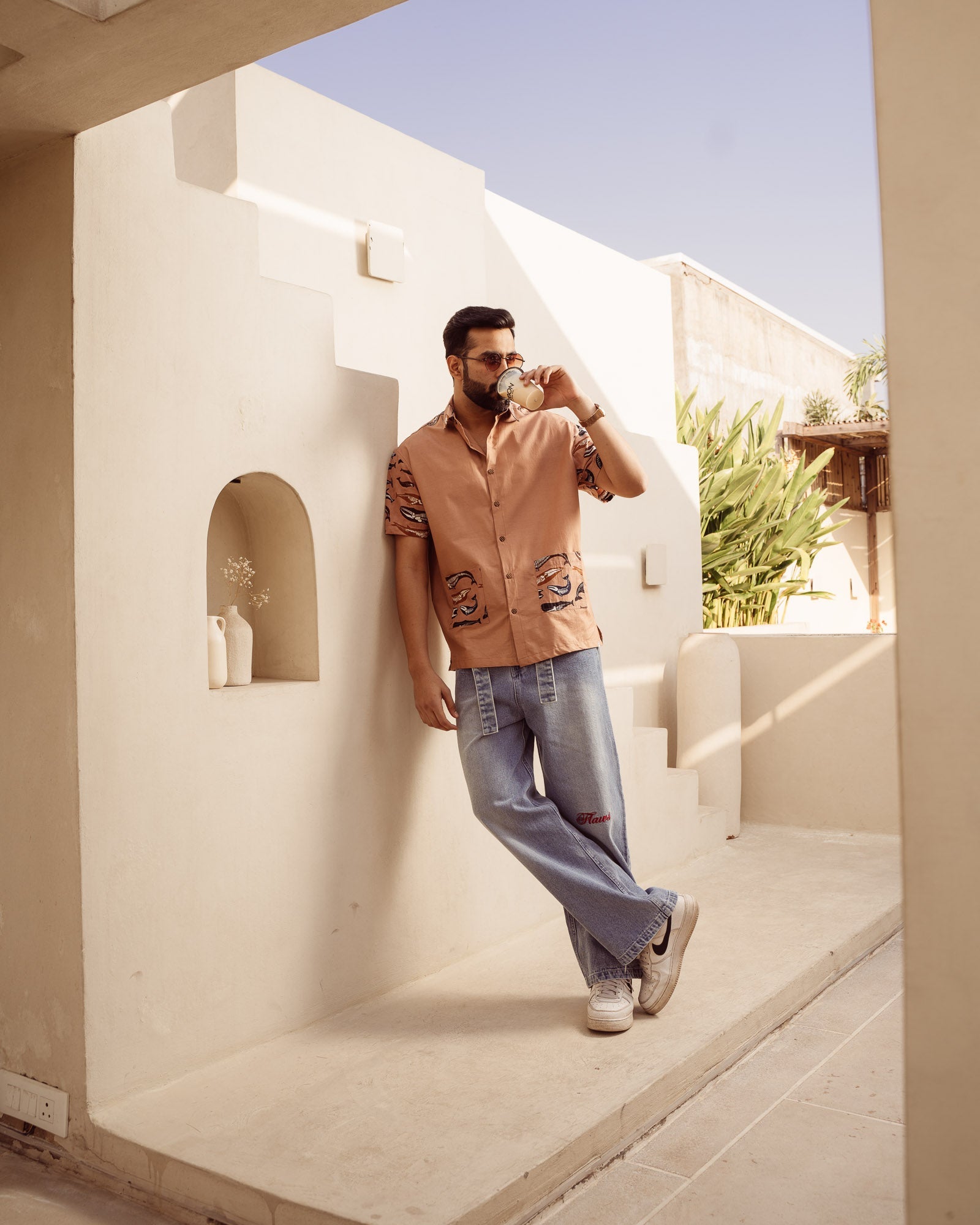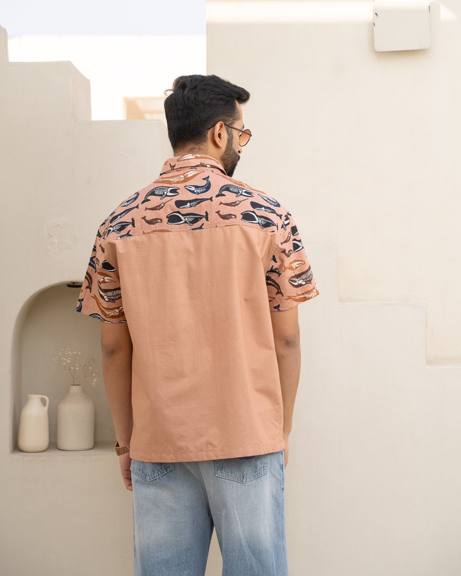 Unique Beige shirt with whale skeleton prints, perfect for beach days, summer parties, and relaxed weekend.