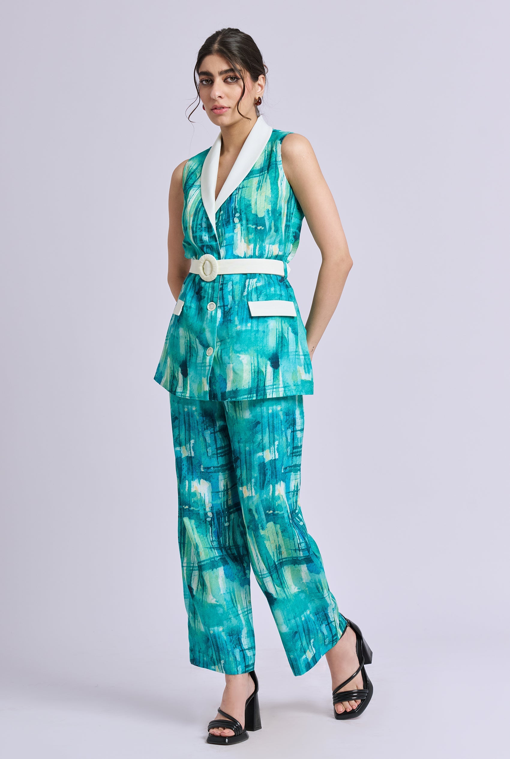 Skye Blue and Green Brush Stroke Print Blazer set with White Belt