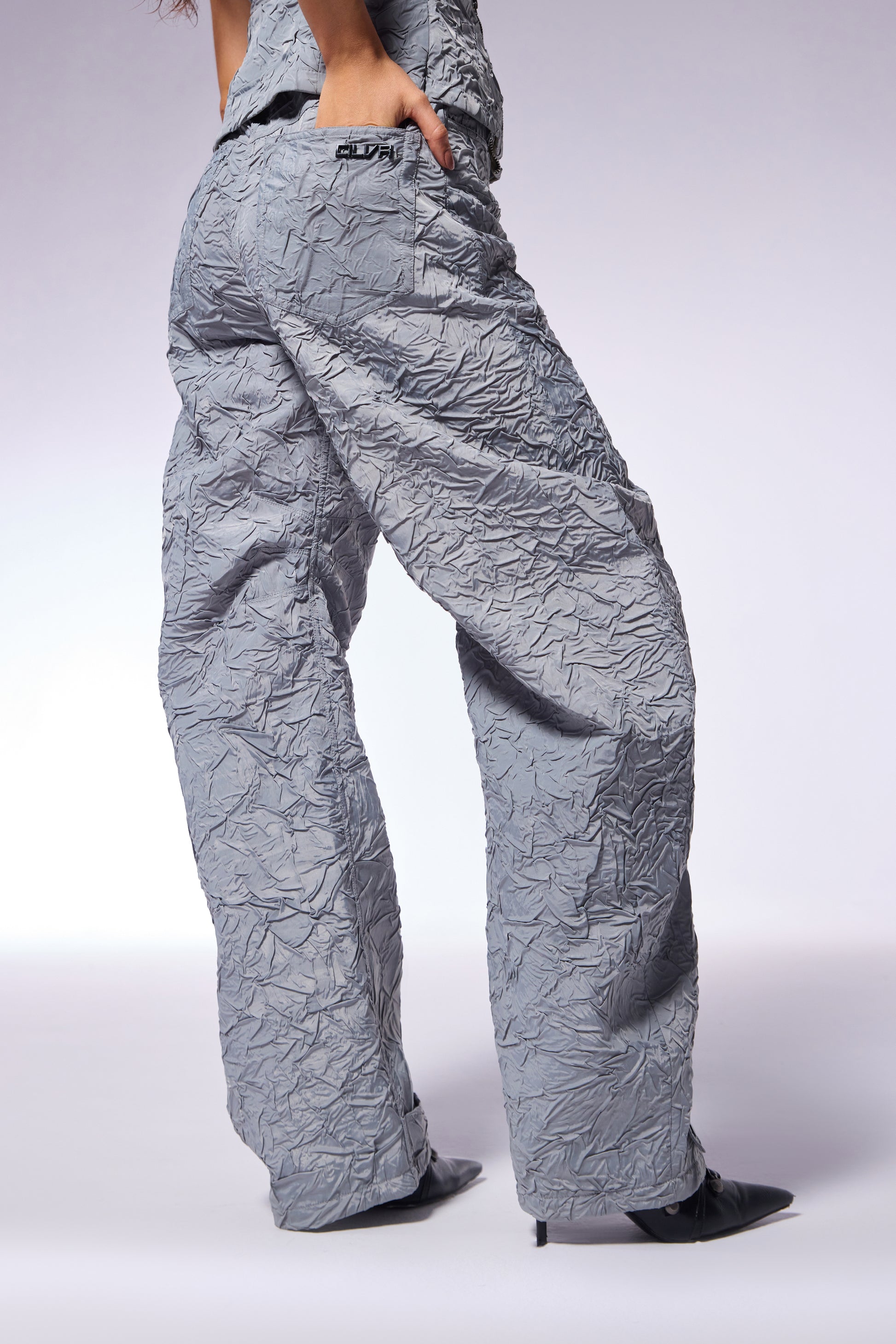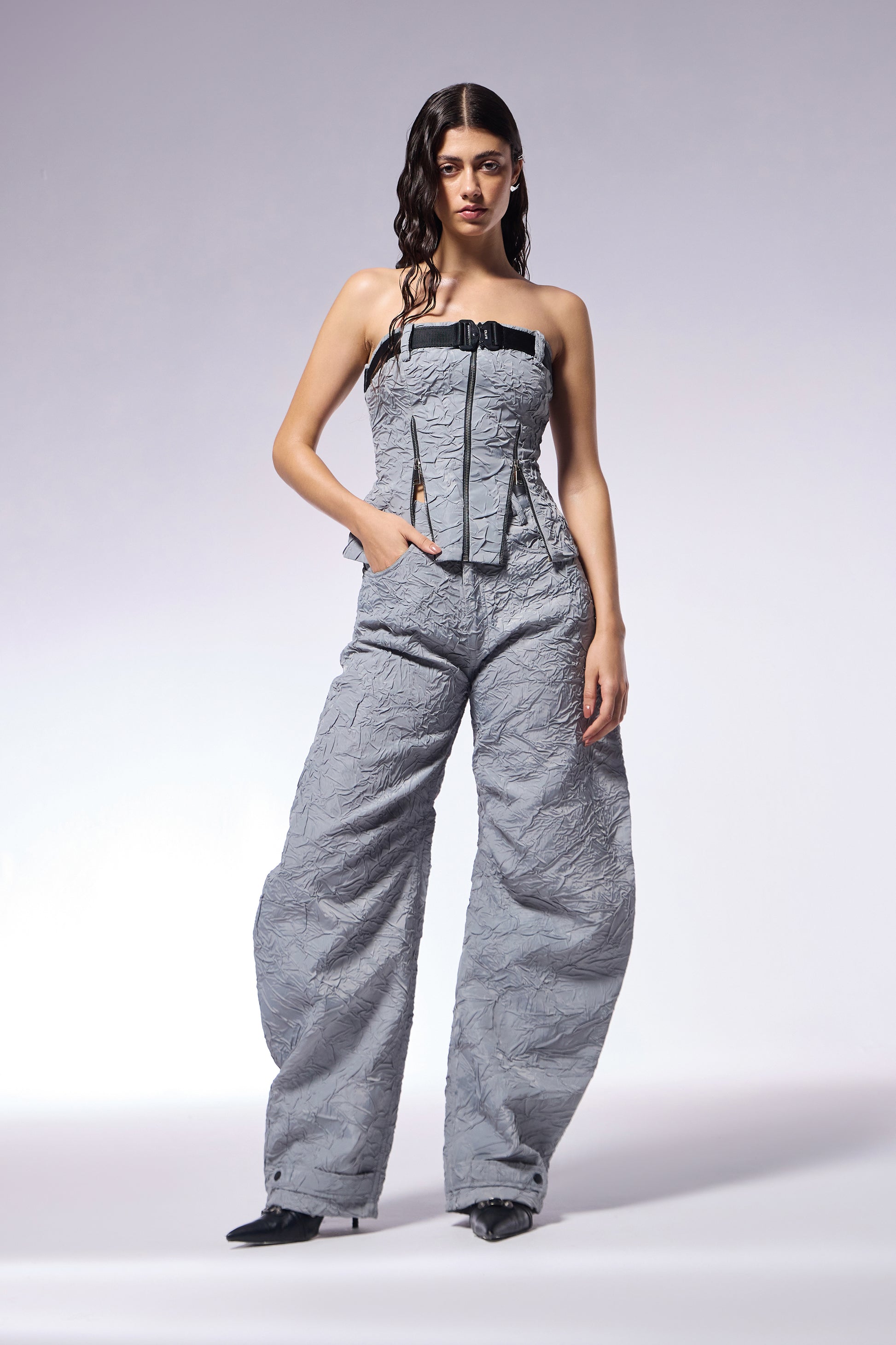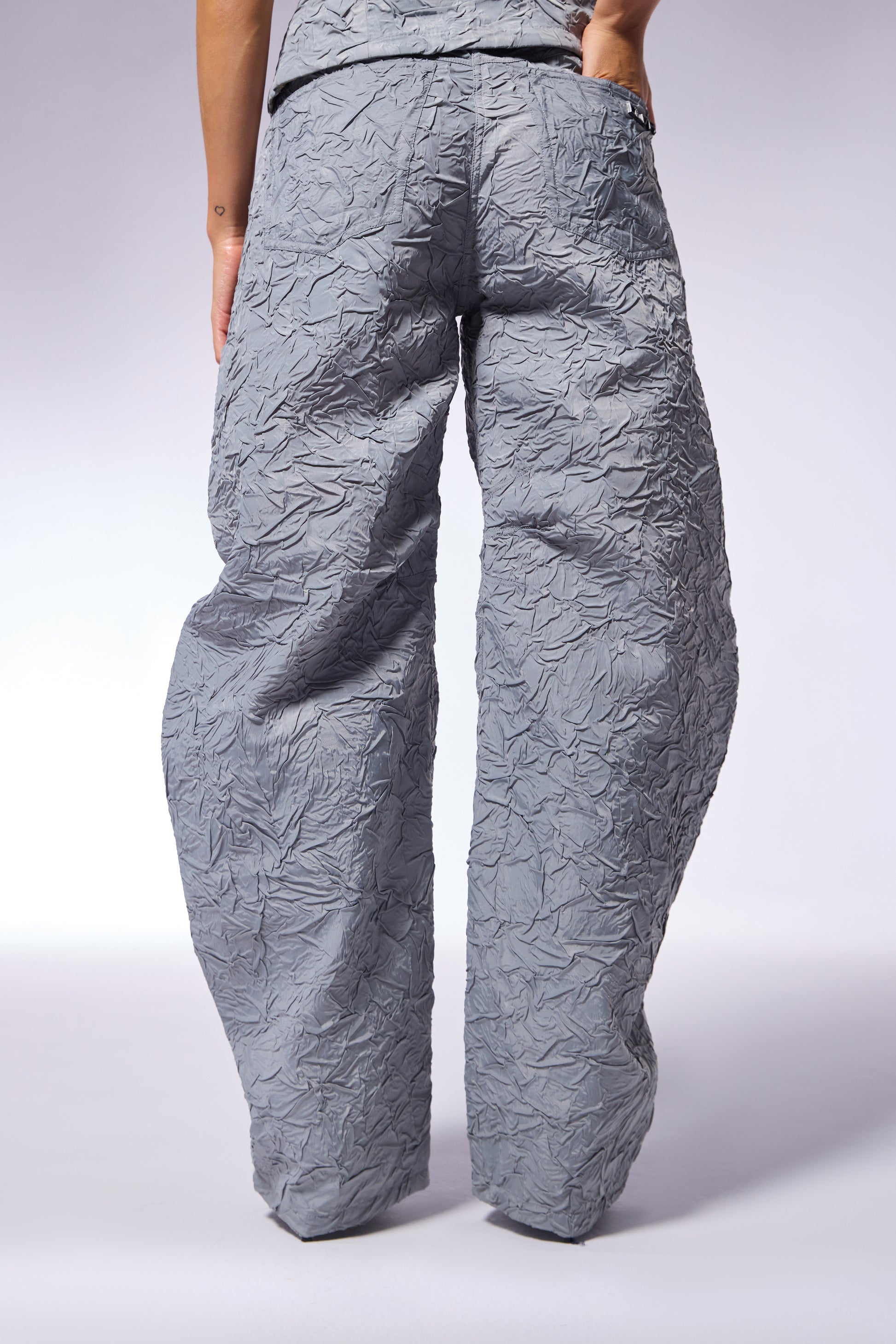 Long pants in a distinctive D-cut shape and finished with a metal logo.