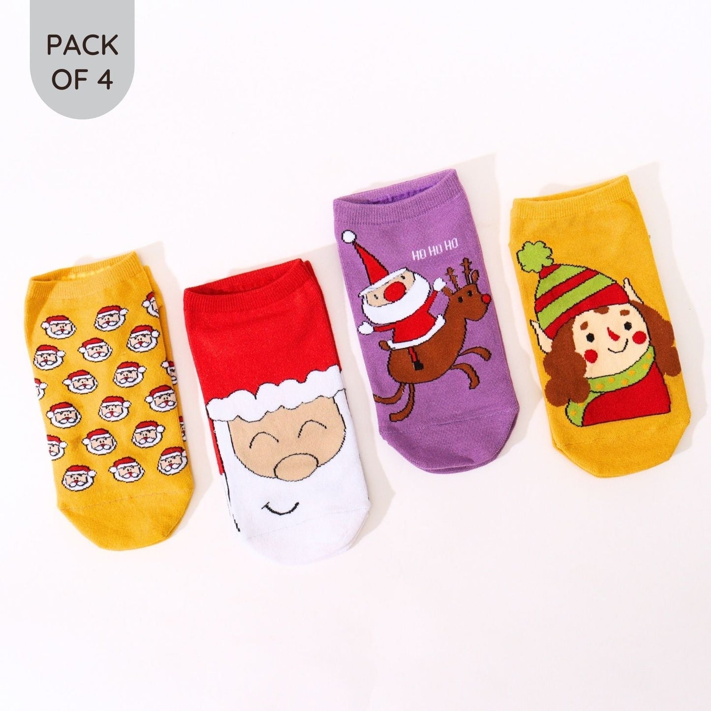 Get ready for some festive fun with our Snow Carnival pack of 4 socks! Made with breathable cotton and a low cut ankle length, they're perfect for both men and women. Each design is inspired by Santa, snow animals, and features quirky colors for a touch of playfulness. One size fits most.