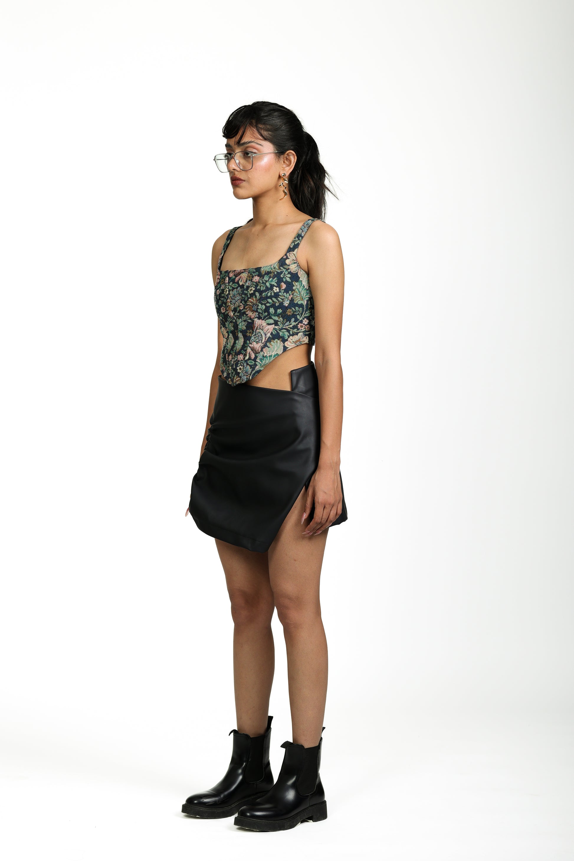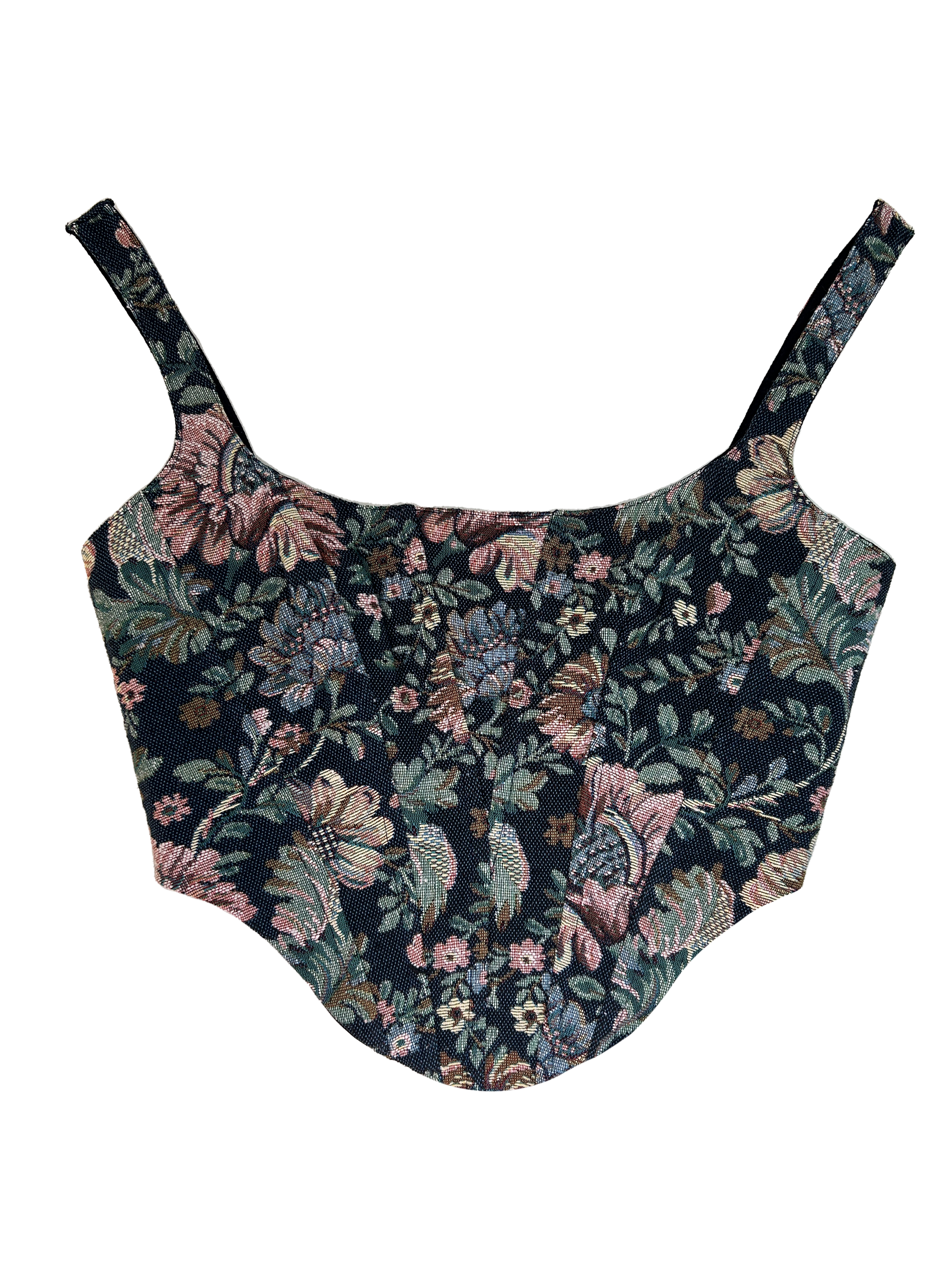 Floral Jacquard corset with a tie up at the back, so that it fits you even if you gain a few pounds. It is equipped with boning inside so that it gives you a cinched up look.