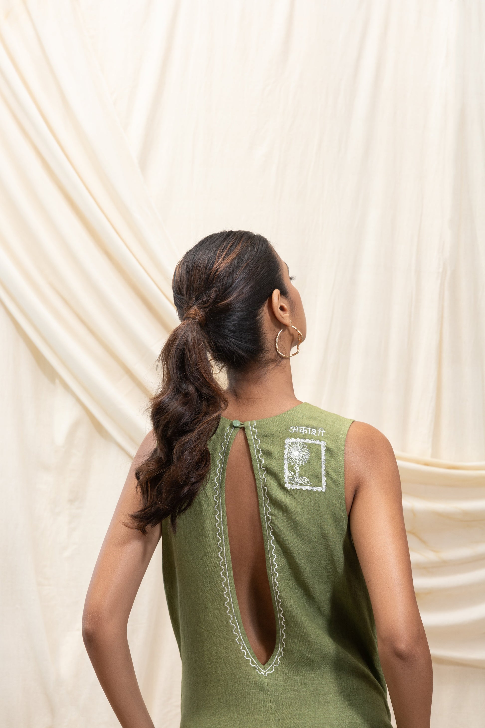 A relaxed-fit, full-length sleeveless jumpsuit designed for effortless style and comfort. The back features an elegant oval-shaped cutout, highlighted with our signature line embroidery in a contrasting shade. A button fastening at the neck ensures a secure fit, while our signature stamp and Akashi logo in Hindi add a distinctive touch. The flared bottoms enhance the flow of the silhouette, giving it a cool, easygoing appeal.