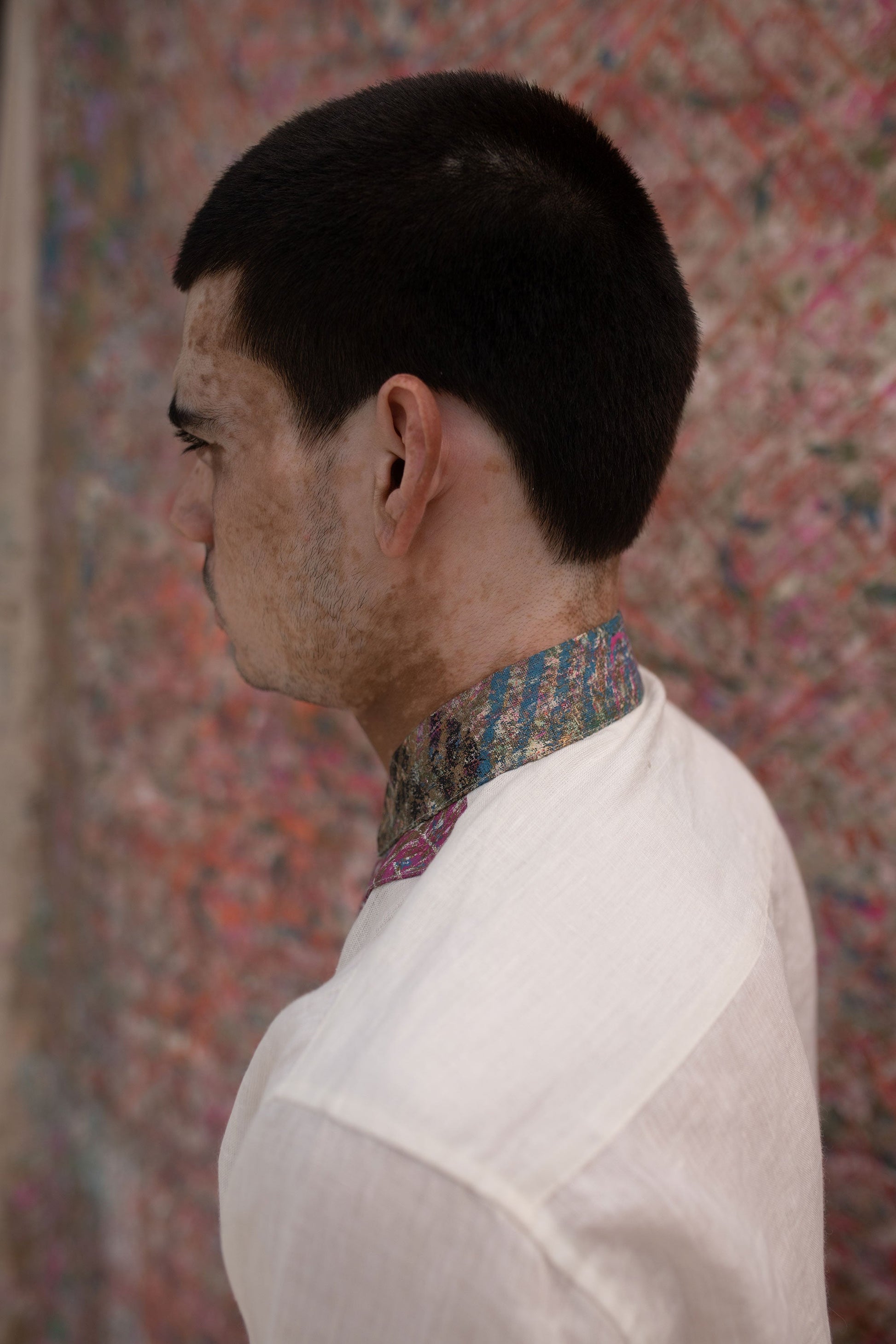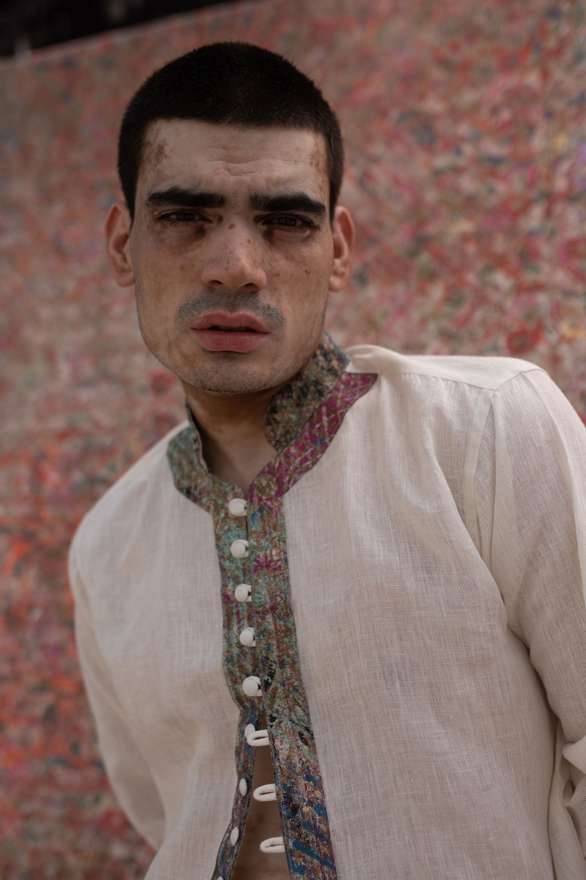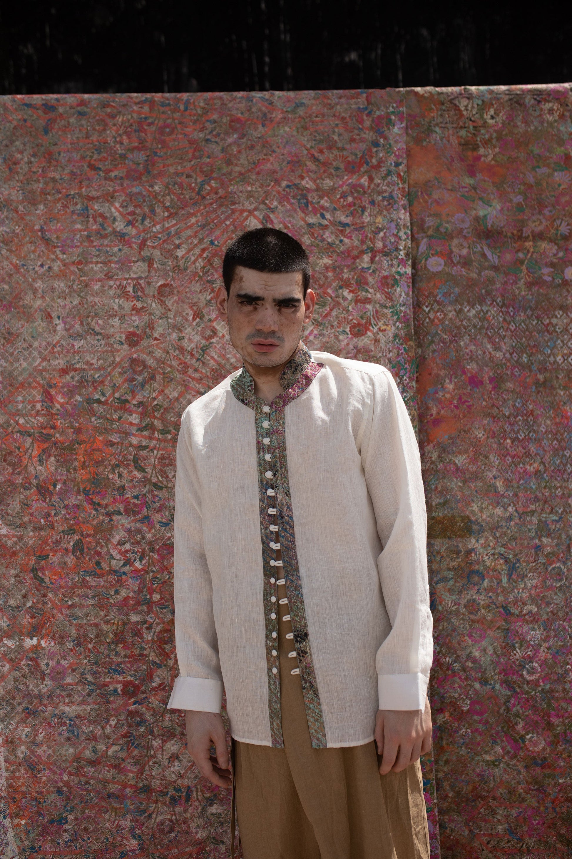 This shirt has a Patina block printed one-of-a-kind fabric placket detail with potli buttons.