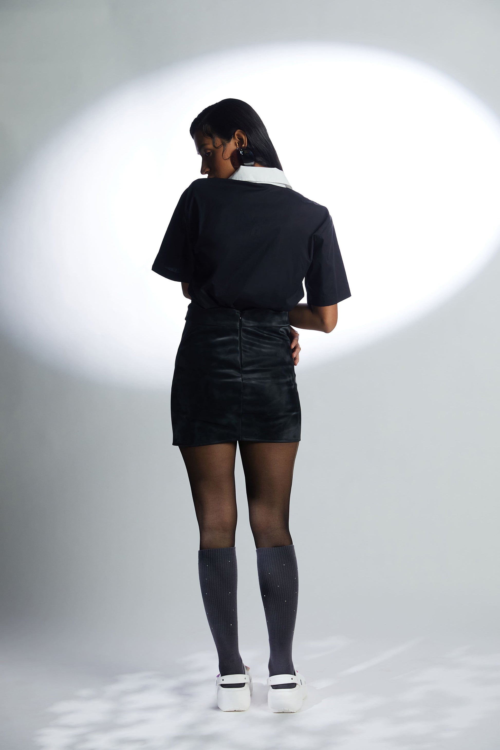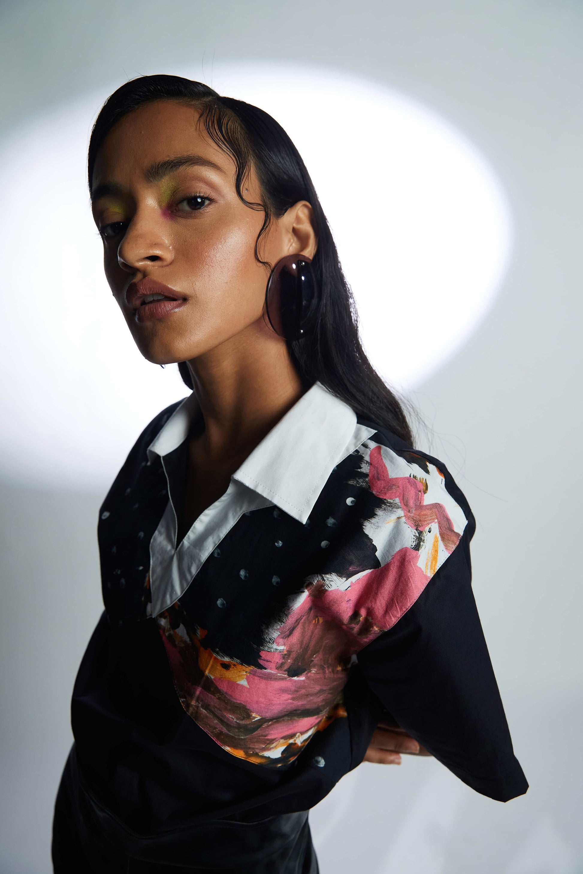 Collared Bodysuit shirt with short sleeves. Featuring asymmetric print of "Starburst galaxy" artwork. The starburst is designed in collaboration with Muskaan. An NGO for specially abled. This Artwork was created by Sanjay. 15% of our net profits will be donated for their welfare.