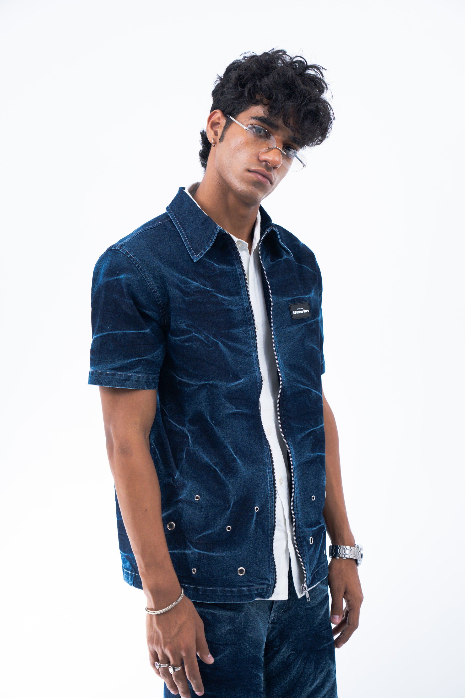 Shirt : An oversized shirt with the striking visual achieved through acid wash and elevated through silver eyelets. A metallic zipper at front for an elevated look.