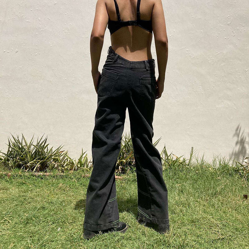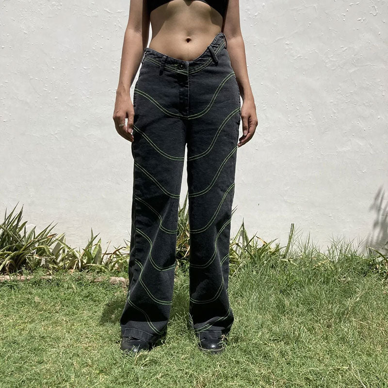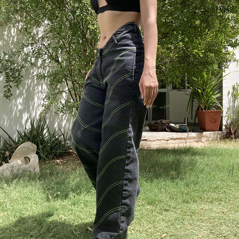 The jeans with high and low pattern waistline. These jeans have a pop of lime embroidery work at the front. Comes with 2 front and back pockets.