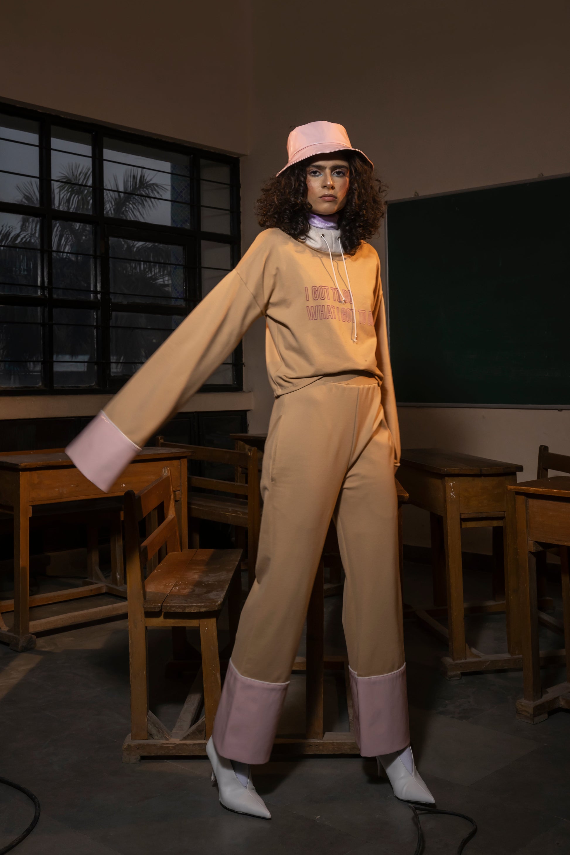 Straight pants with elastic waistband and side pockets. Finished with colour blocking at the hem.