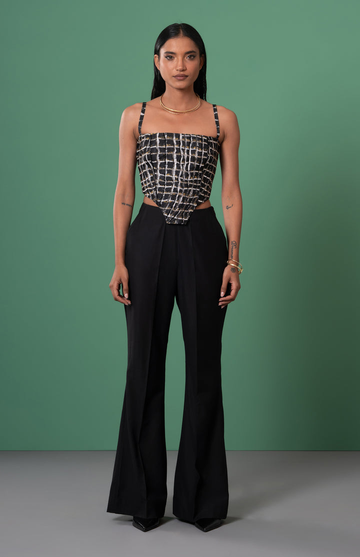 This expertly crafted corset features structured hand embroidery and boning for optimal support. Utilizing an adjustable tie at the center back, this piece provides customizable fit and comfort for the wearer.