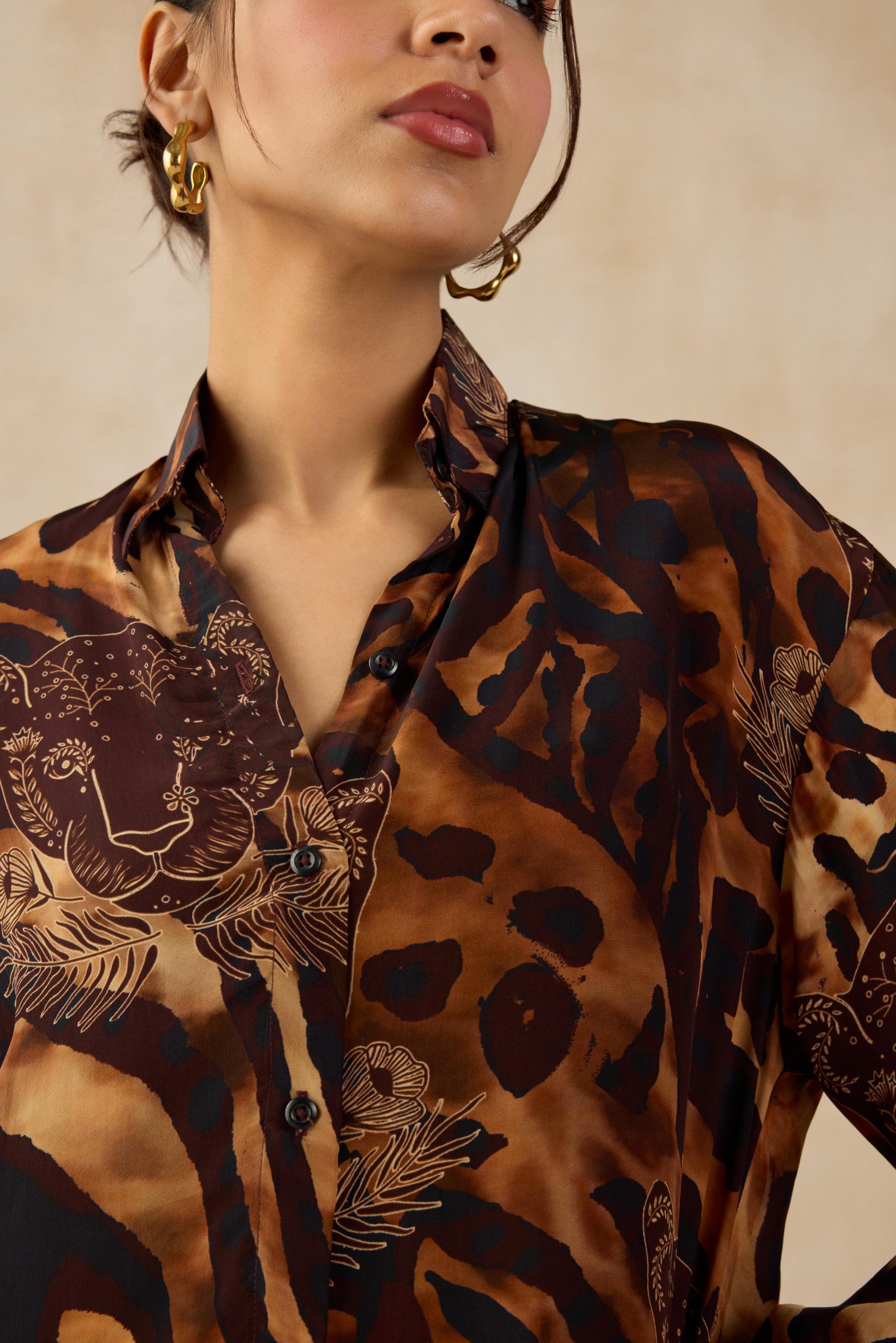 Elevate your wardrobe with the Barcelona Shirt, a bold yet effortless piece designed for statement dressing. Featuring an intricate mix of animal prints and signature Sil Sila typography, this oversized button-down is crafted from lightweight, breathable crepe fabric for all-day comfort. Its relaxed fit, full sleeves, and structured collar make it perfect for both casual layering and elevated styling. Pair it with the Barcelona Cargo Pants for a power-packed co-ord look or wear it solo for an effortlessly chic vibe.