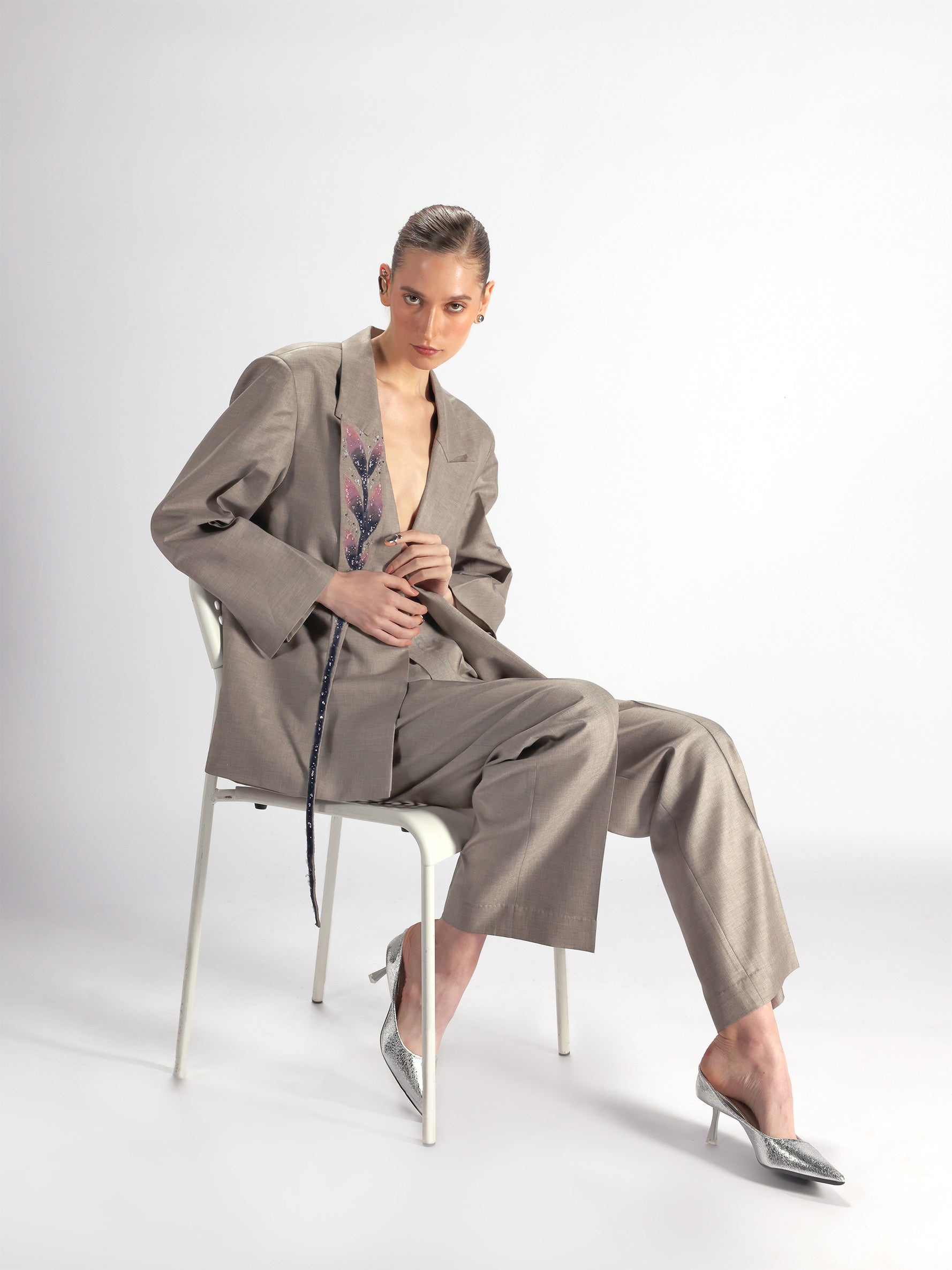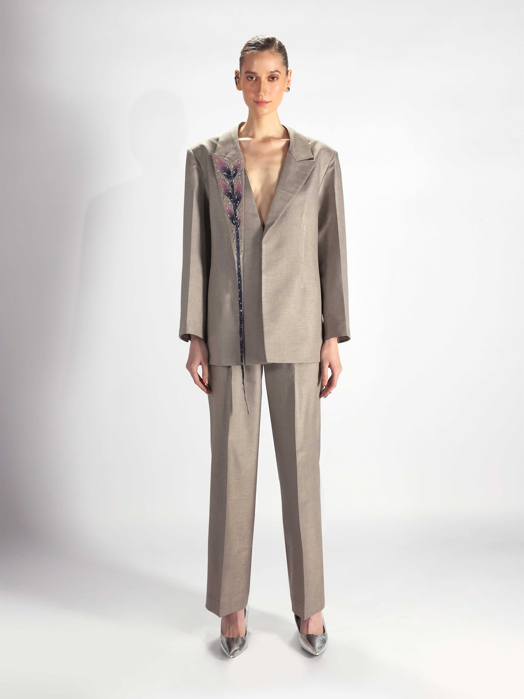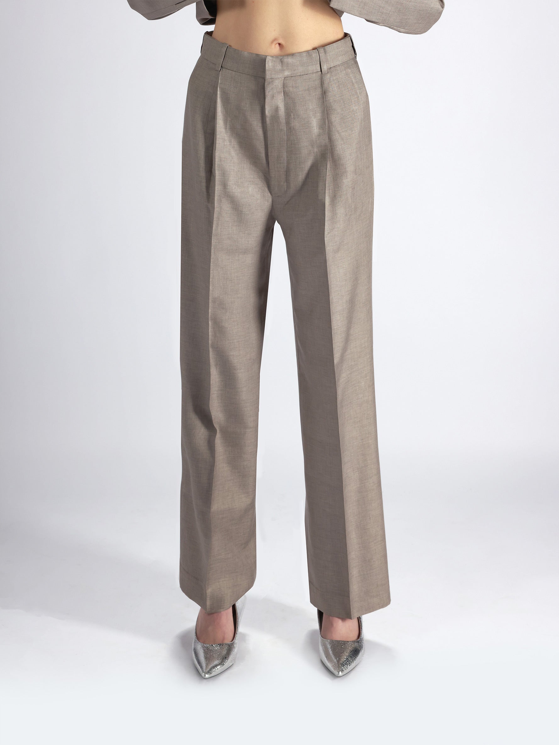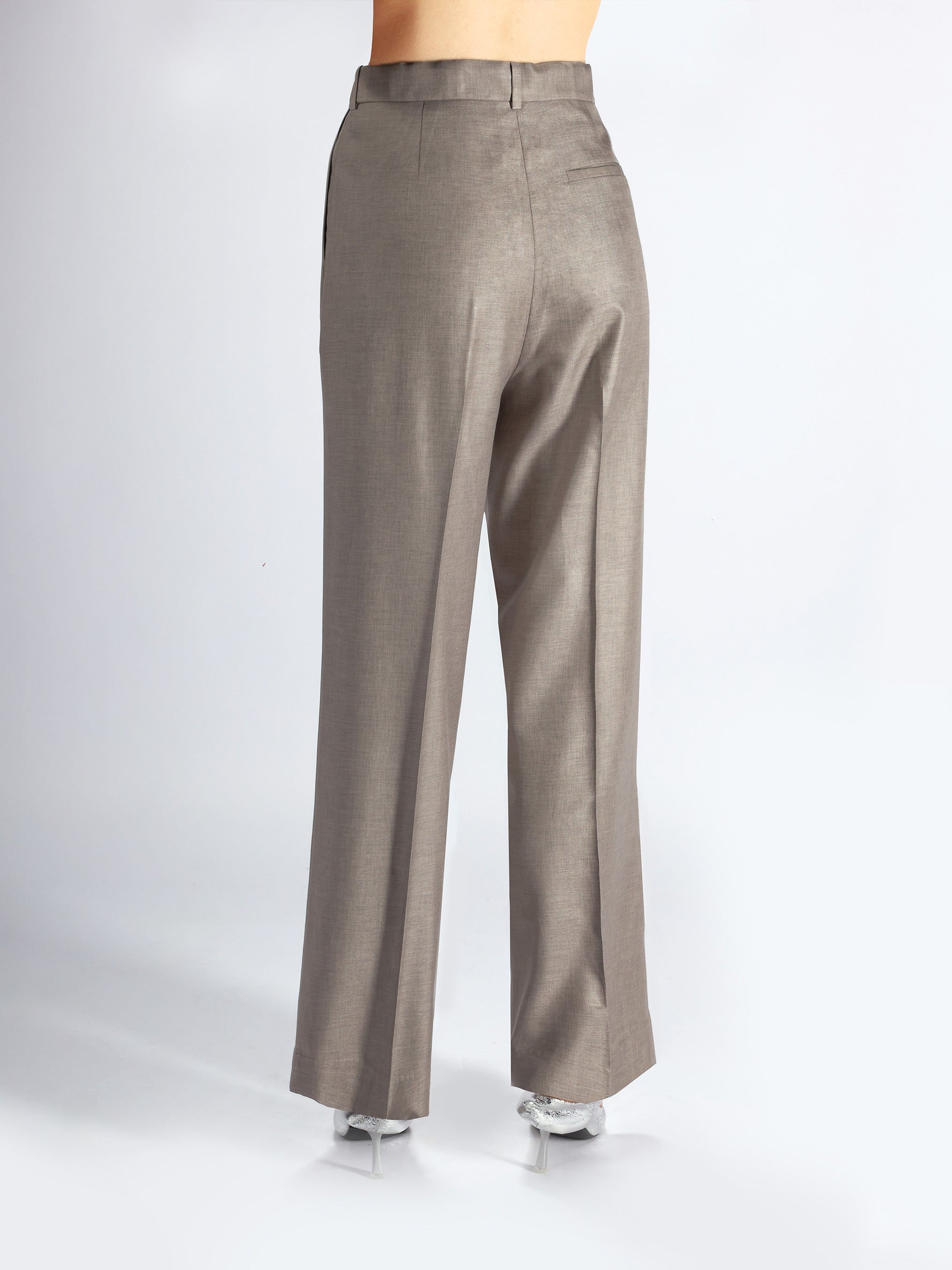 Crafted from fine grey suiting fabric, these straight-legged pants feature a discreet hidden elastic at the pocket side, side pockets, and a front pant hook closure.