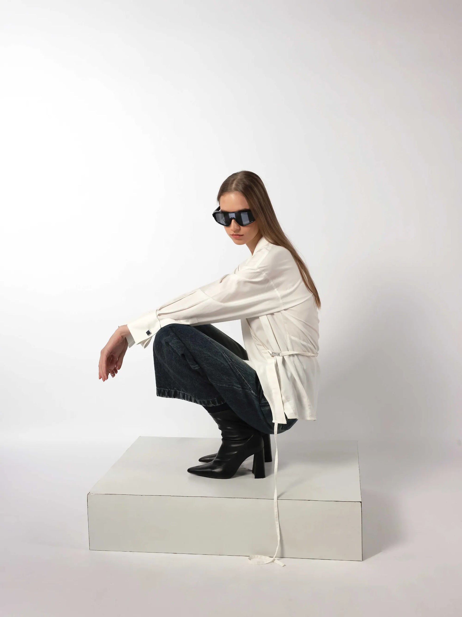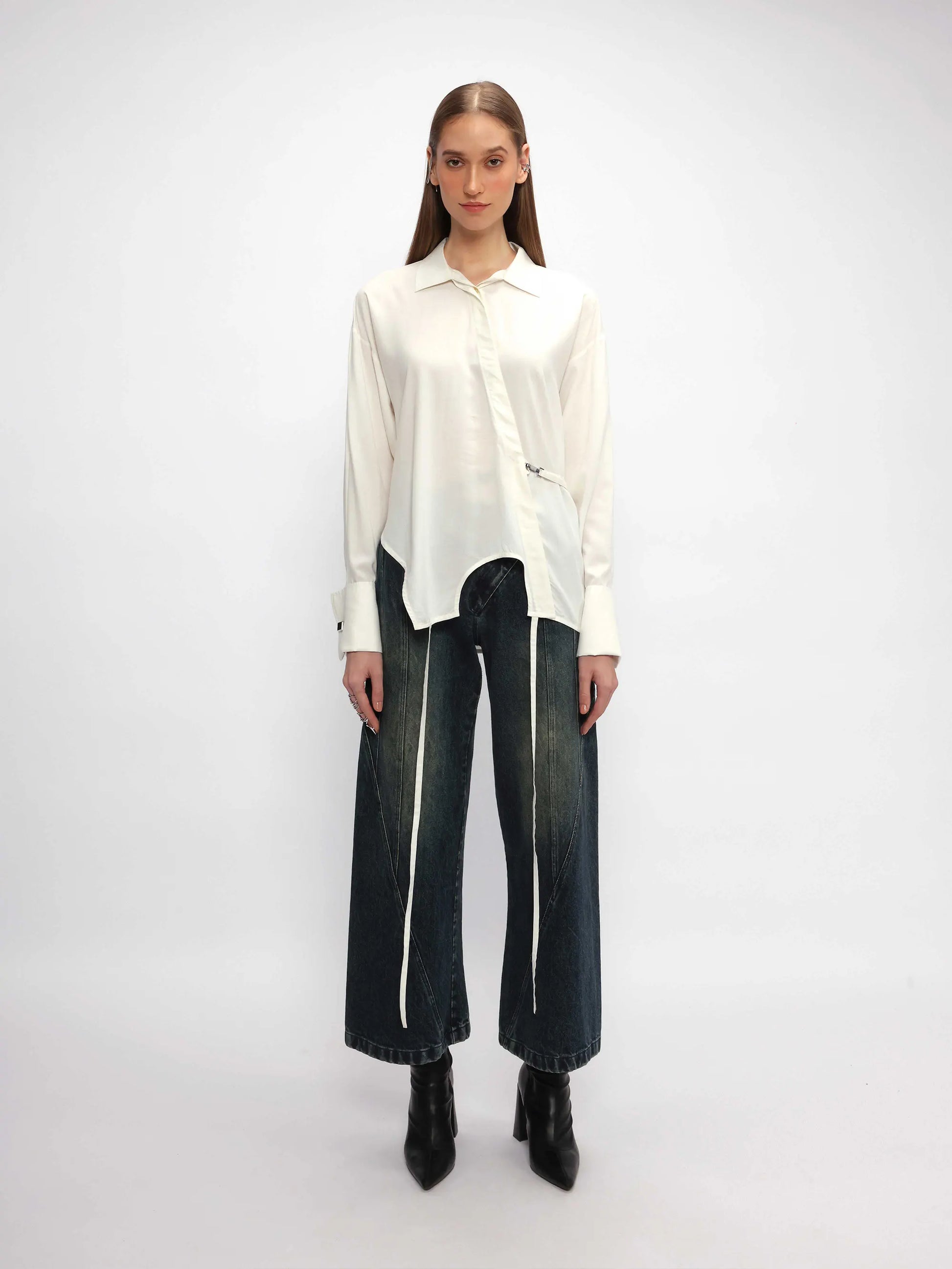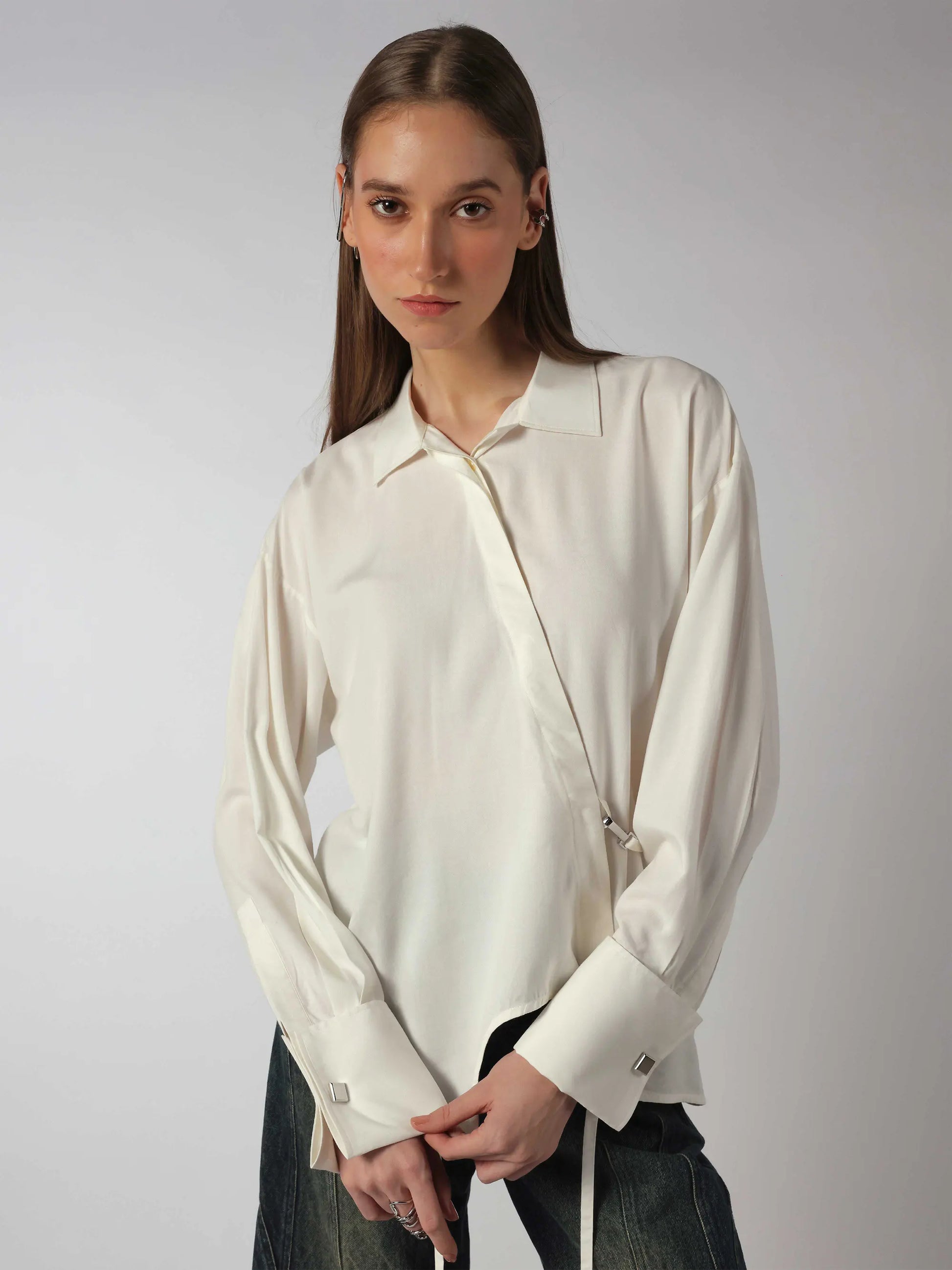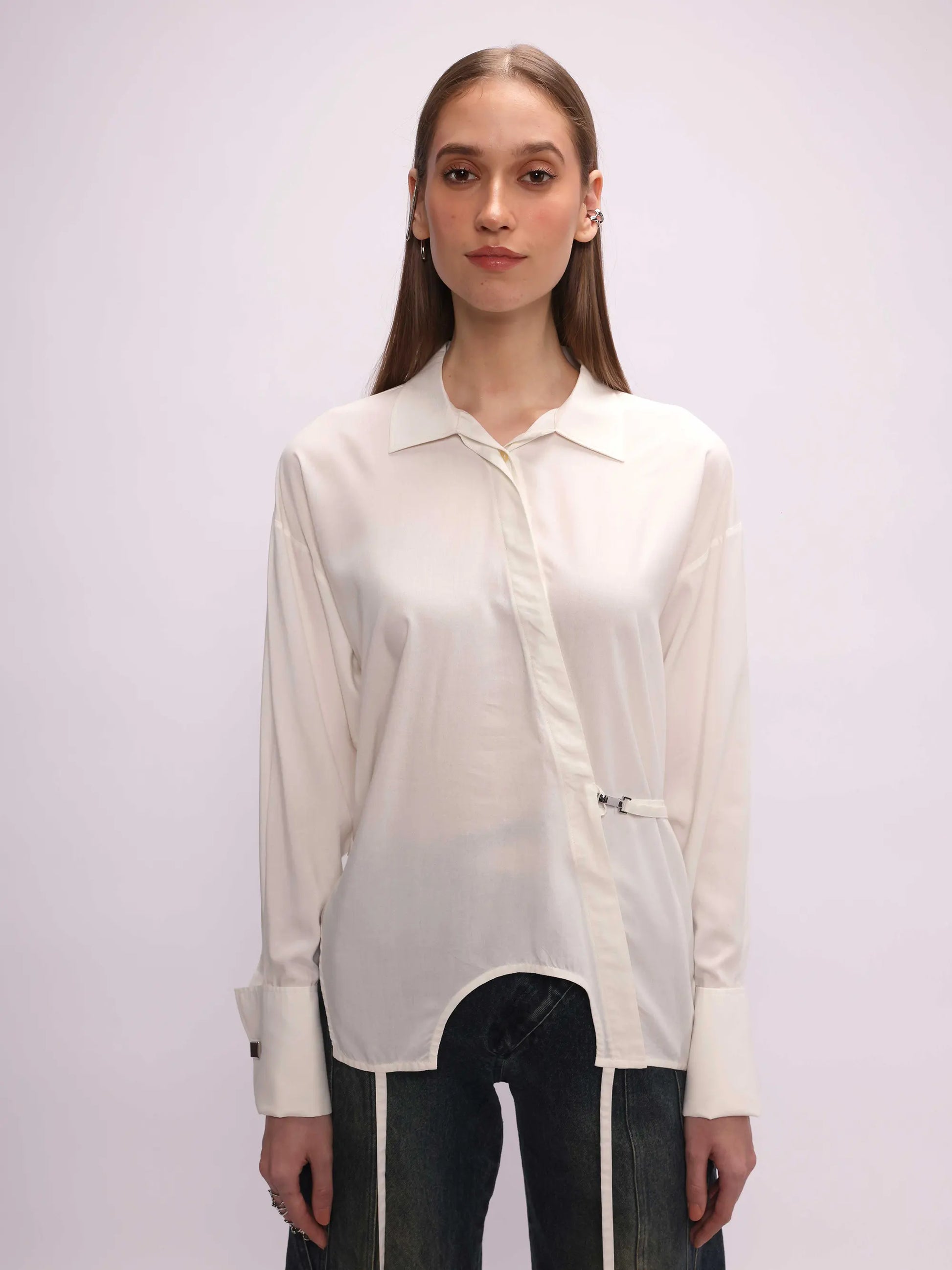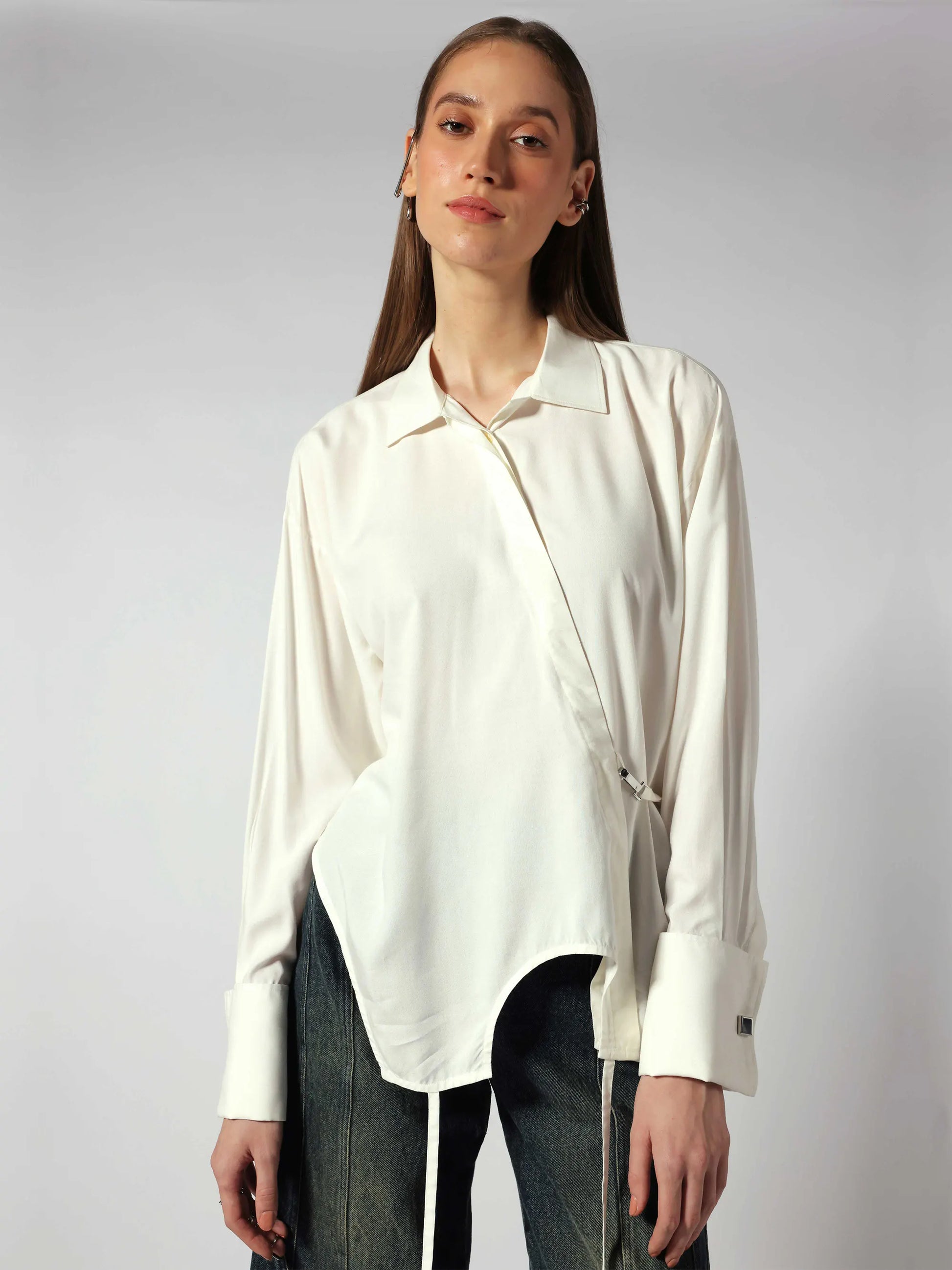 White shirt made in aloe vera fabric with antibacterial hypoallergenic properties. It features a designer hem with strings and asymmetrical concealed placket, inspired by the inverted neckline of the tank top. Designed with a french cuff, concealed placket and an adjustable back flap with a dog hook hardware that is versatile and easy to style.