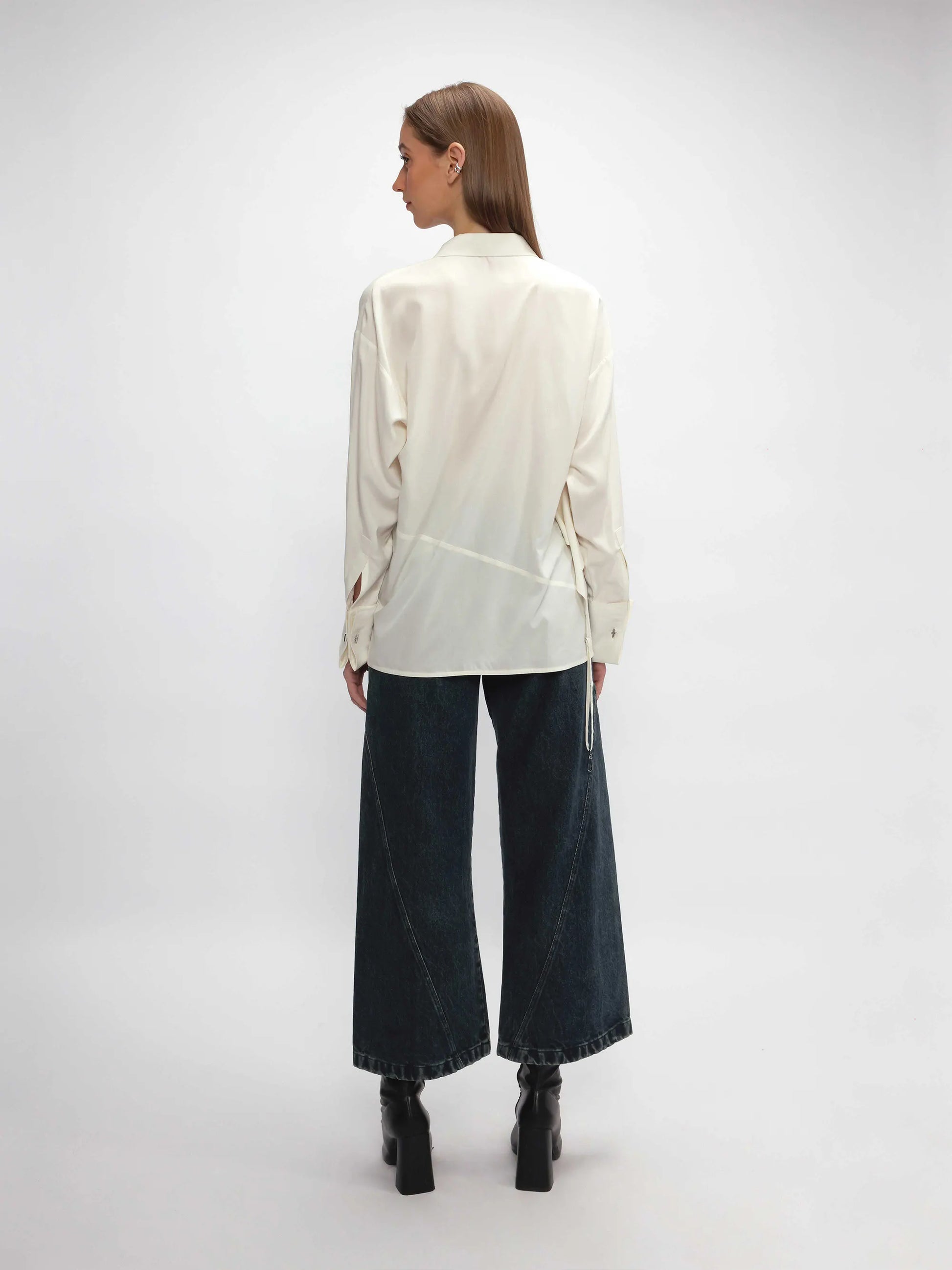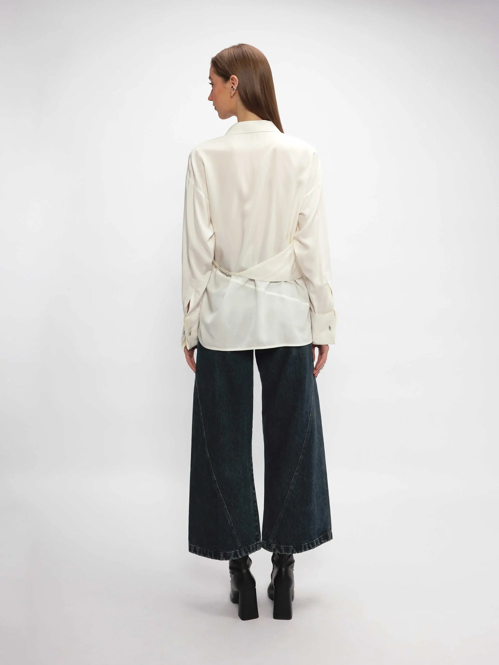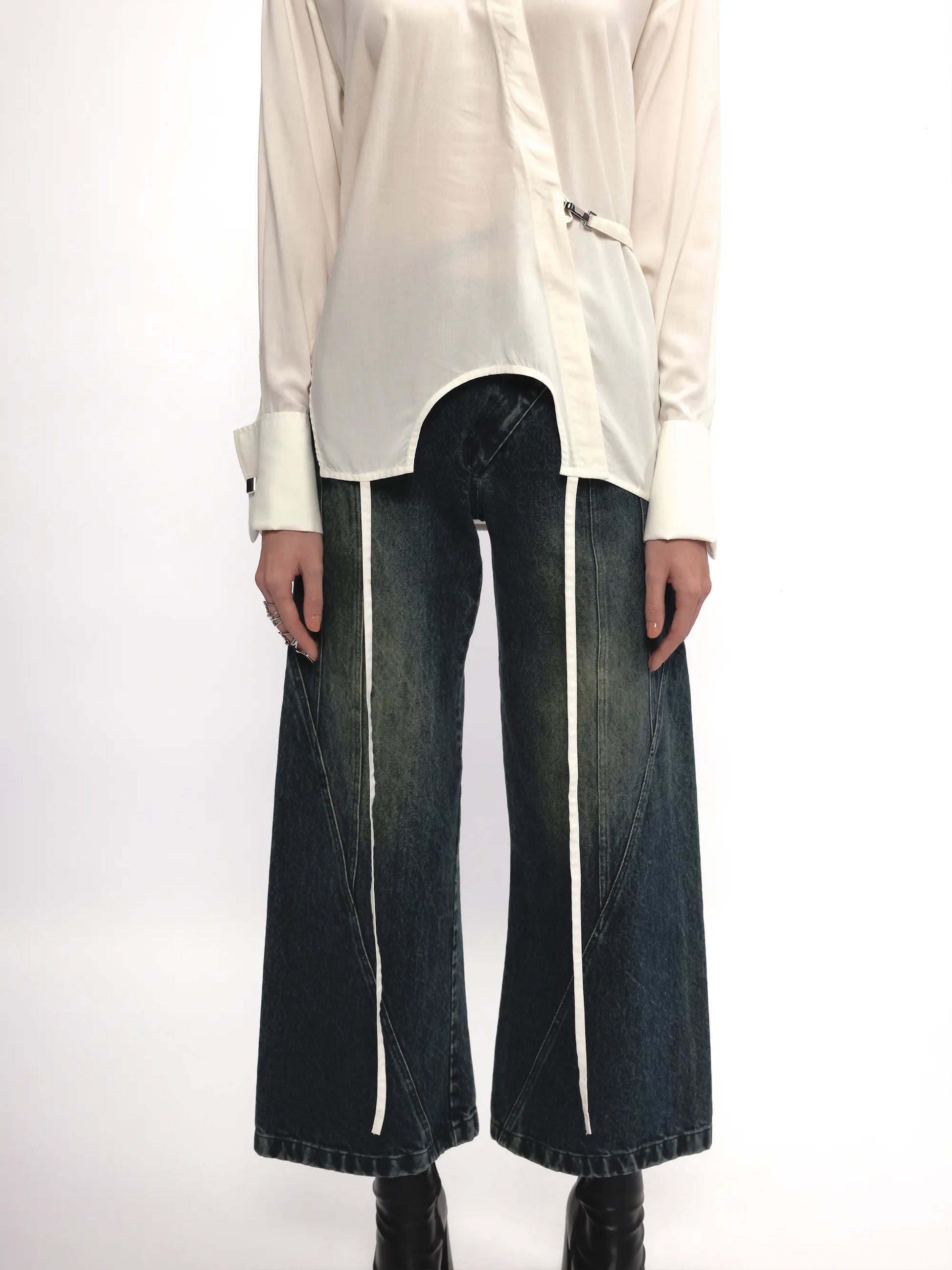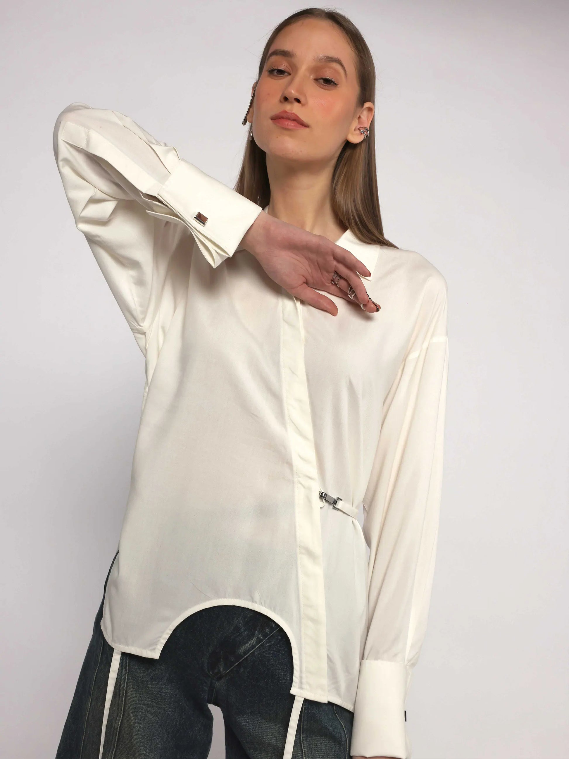 The design features a curved hem inspired by an upside-down tank top, along with a back flap that wraps to the front. A metal fixture cinches the waist for an adjustable fit, adding a modern touch. Finished with French cuffs and cufflinks, this shirt combines elegance with versatility.