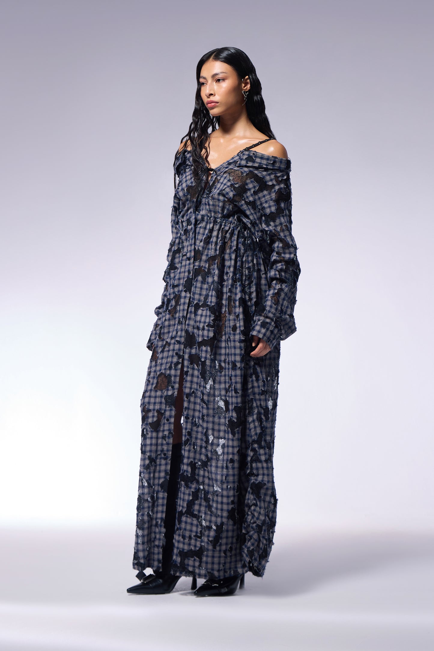 An oversized maxi shirt dress crafted from deconstructed tattered fabric. Metal hardware on the straps introduces an industrial edge, complementing the relaxed silhouette.