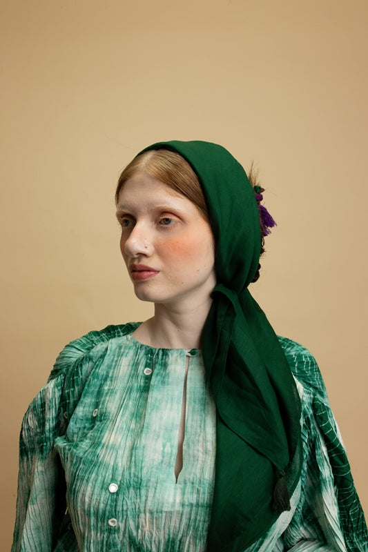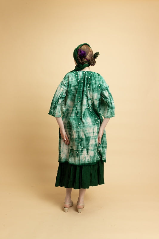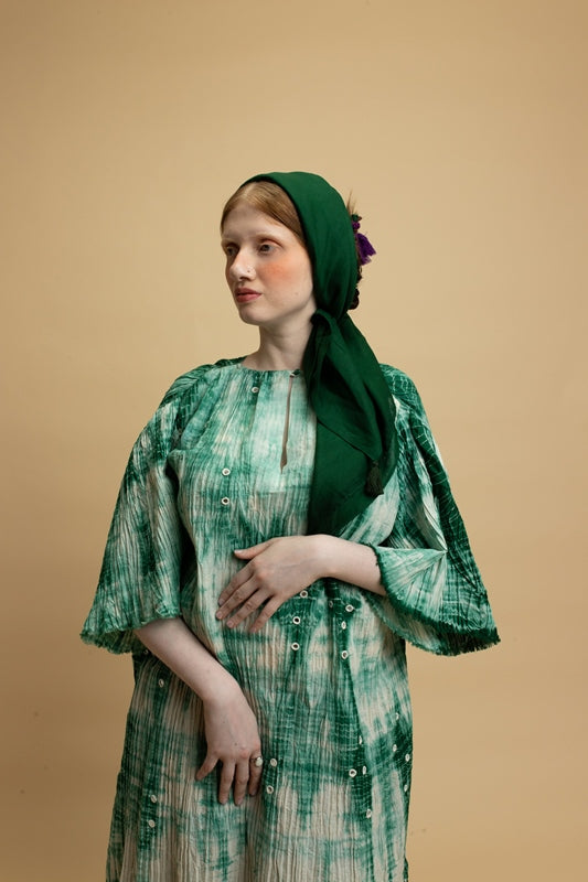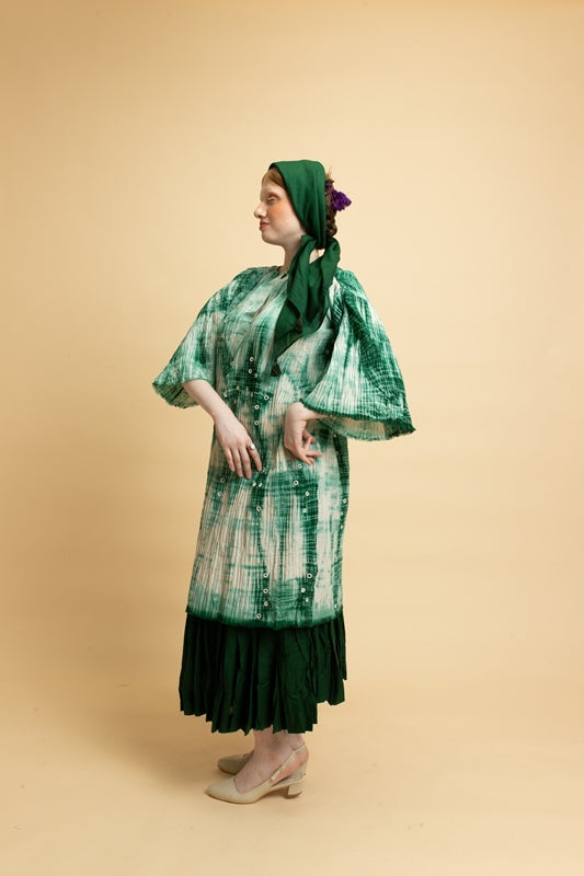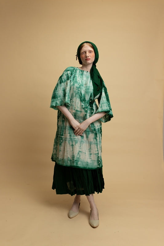The Moon collection is created using soft cotton mal-mal that is heat pleated to create texture. The fabric is then tied and dyed into different colors of Taurus green. The tunics are enhanced using hand mirrorwork embroidery details.