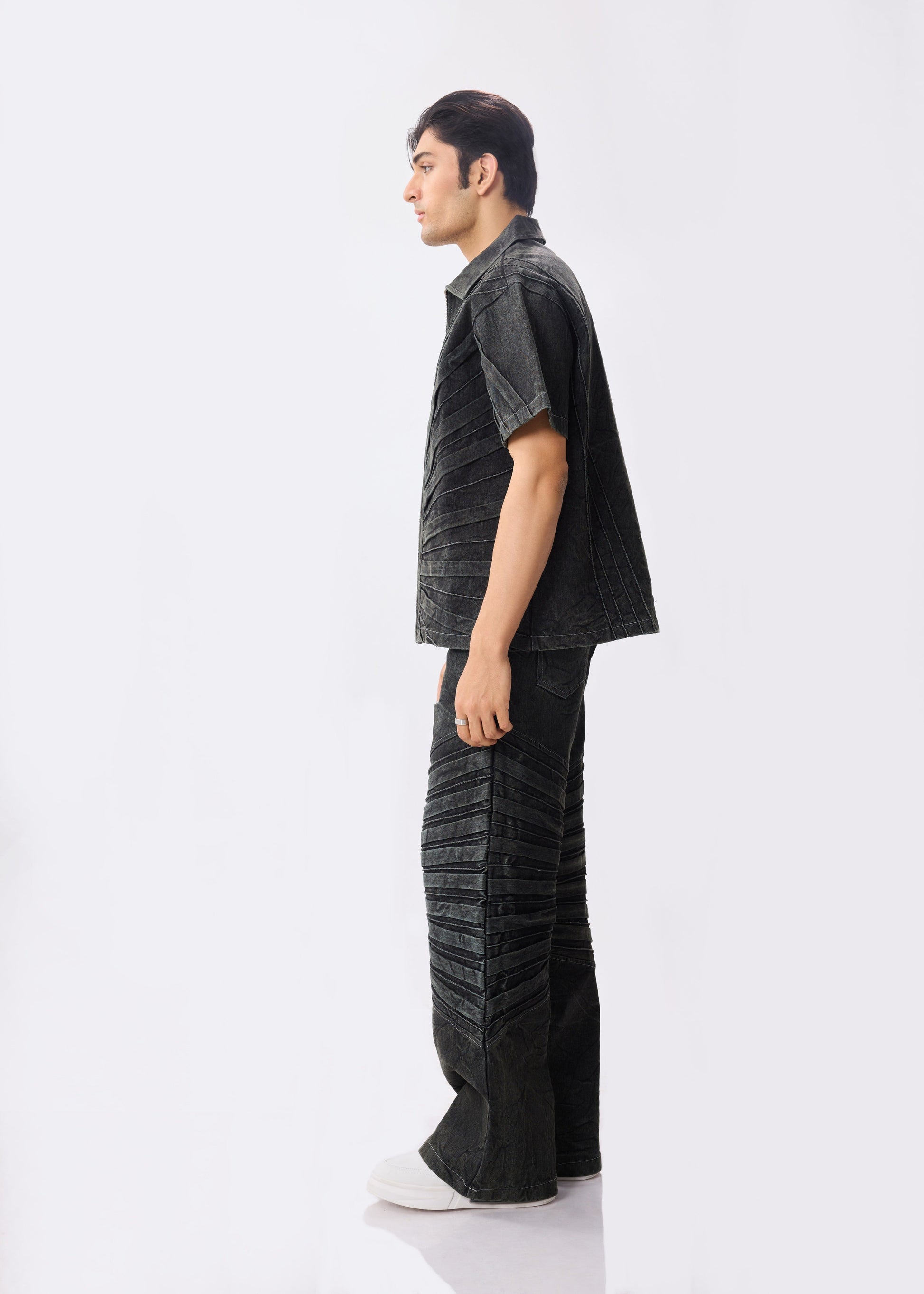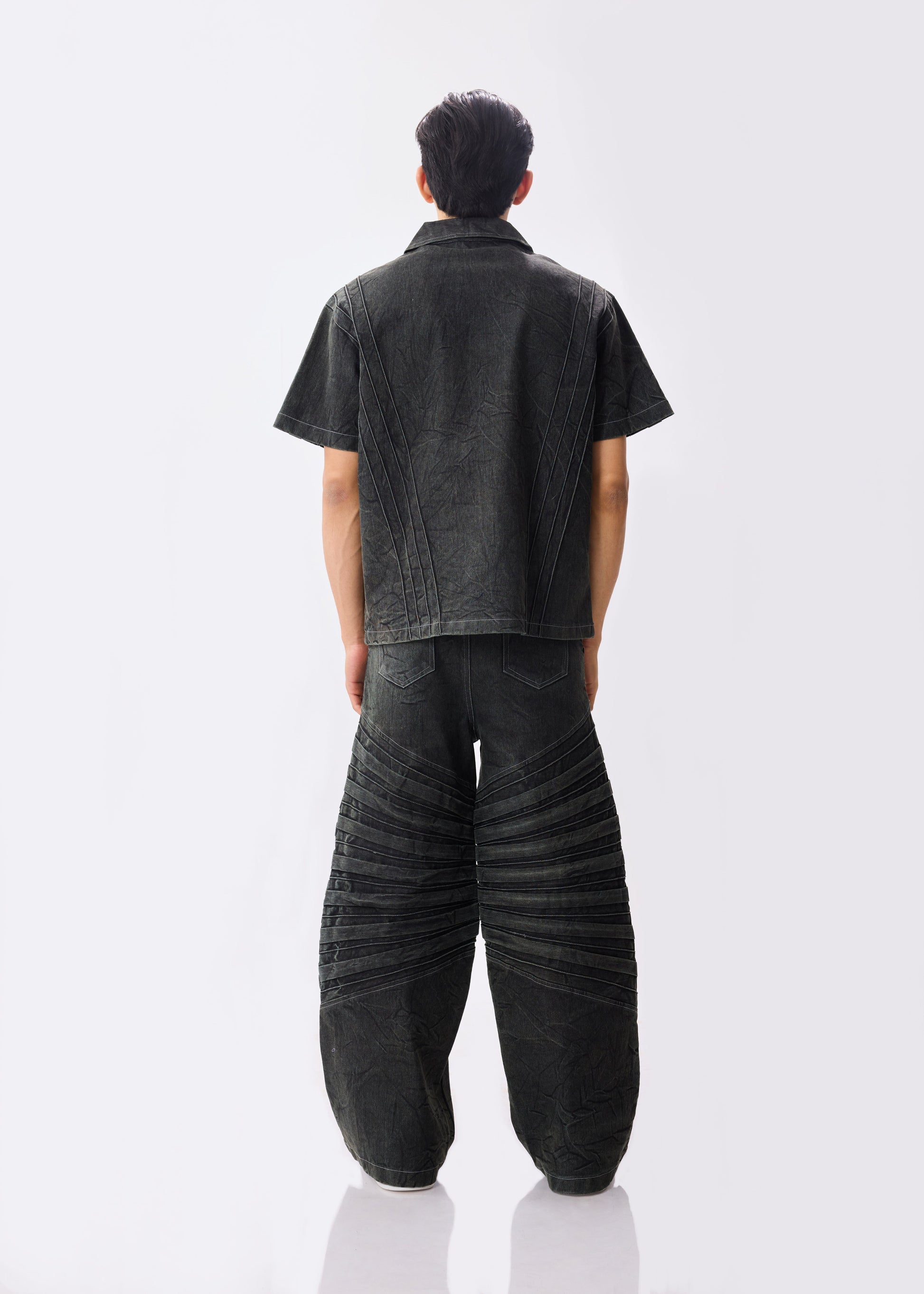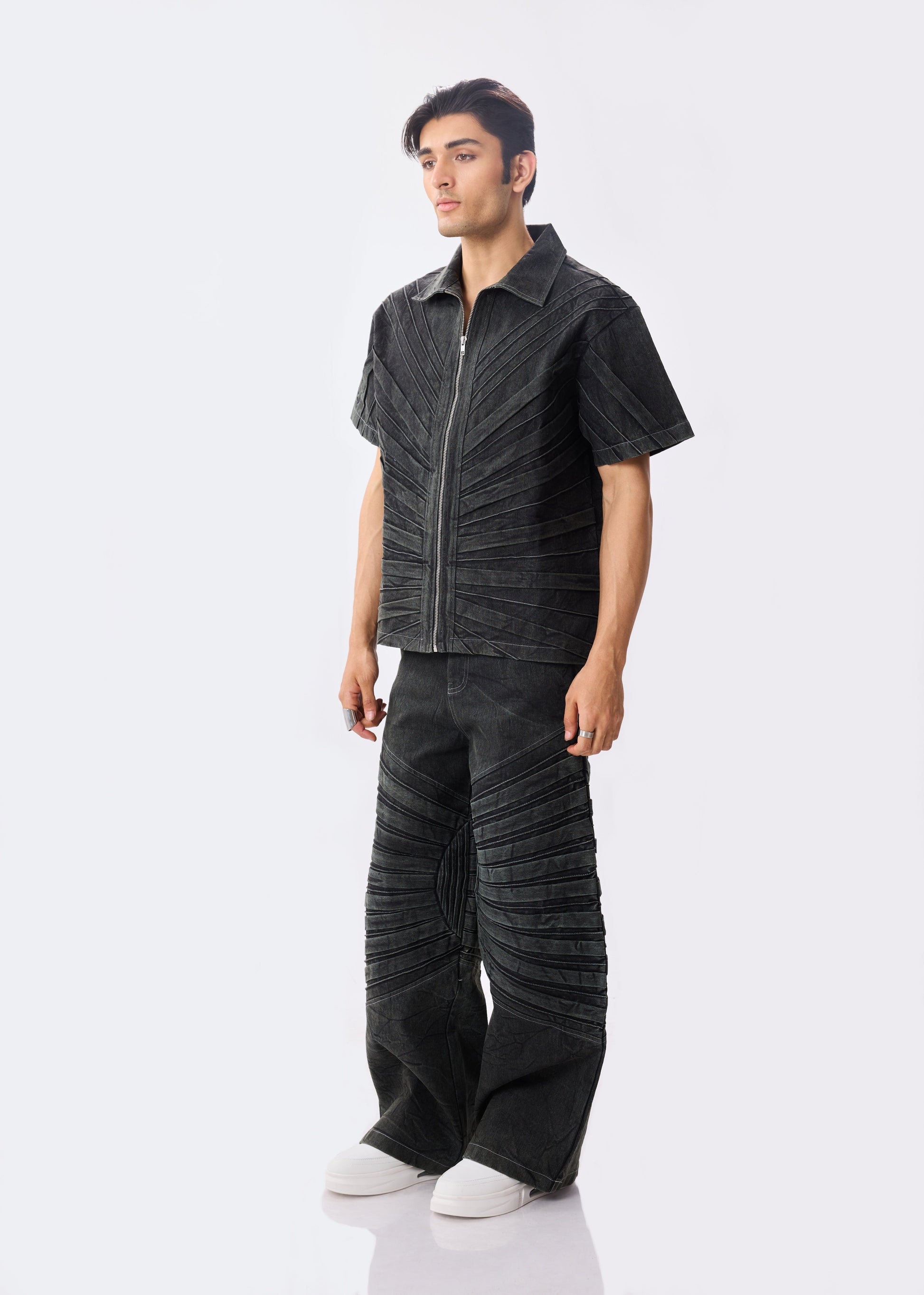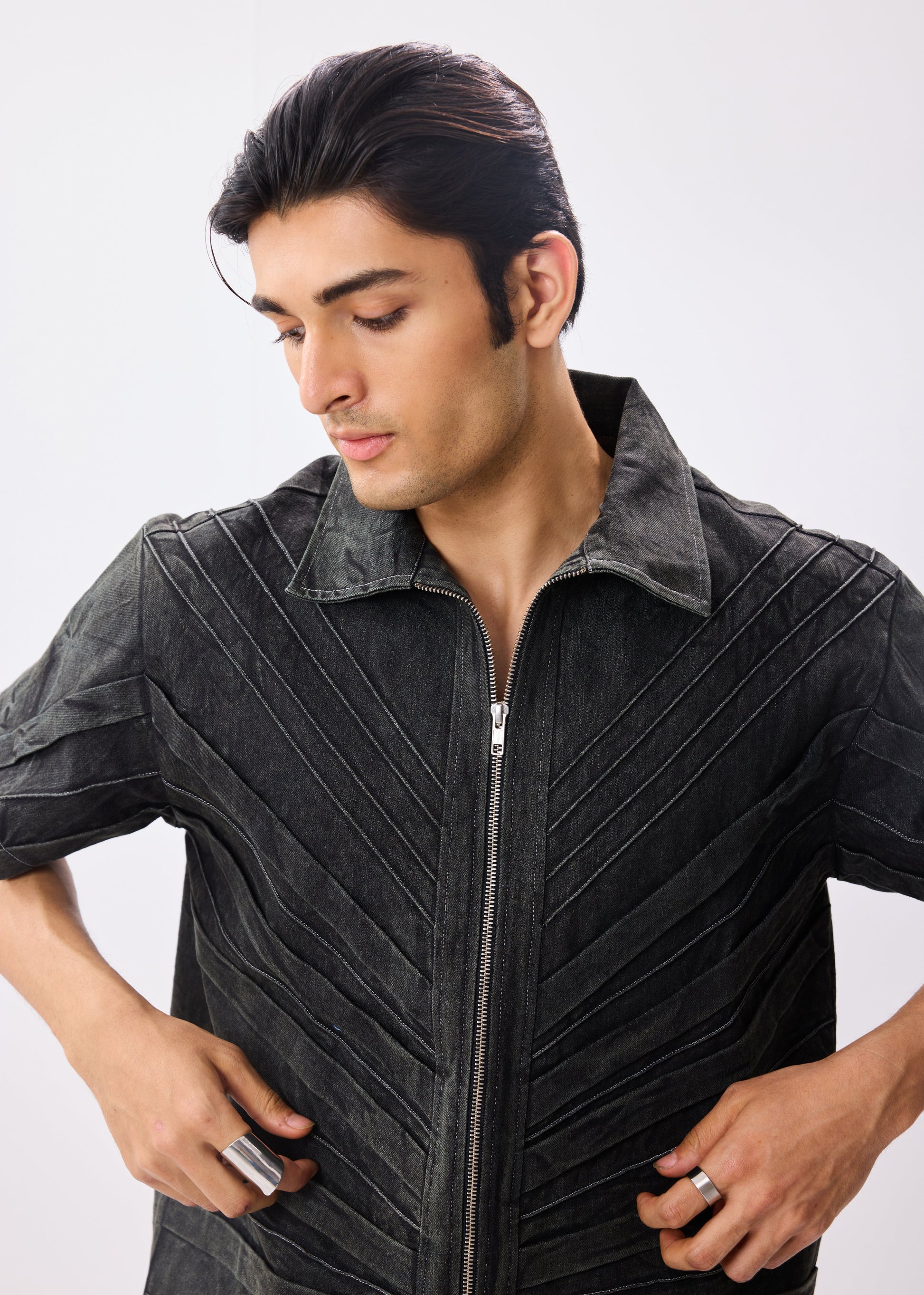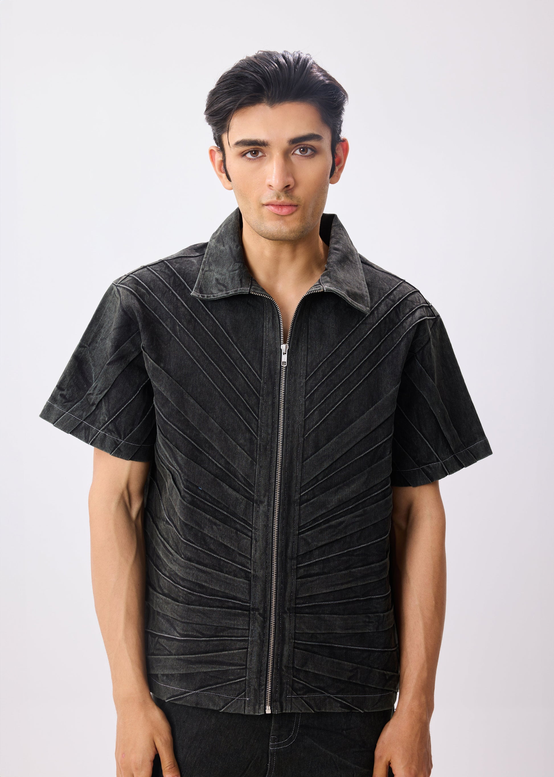 Constructed with utmost precision and attention to detail, our Technical Rays shirt is made with pleats and pintucks running from the center to the sides, throughout the shirt. Made with heavy weight denim fabric, the shirt sits right on the body giving it a straight fall. Front zipper adds a metallic element to the piece.
