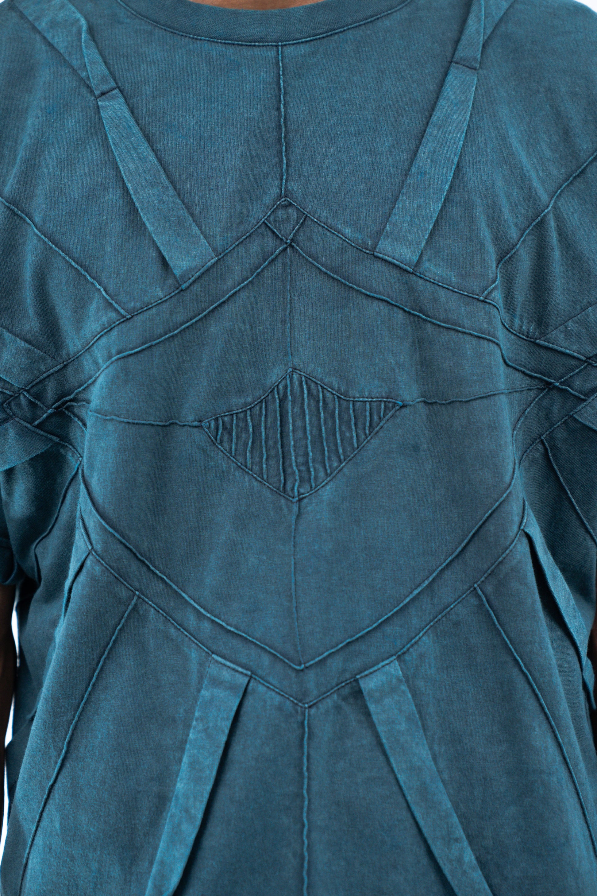 Crafted from a breathable white cotton jersey fabric, this box-fit t-shirt is enhanced with Thnwhn’s signature pleats and pintucks that are meticulously crafted and tucked to create the illusion of an armour. It also features panelling inspired from the will to stay strong as we come to face any challenge. It is washed and dyed in a sea-green aqua tone.