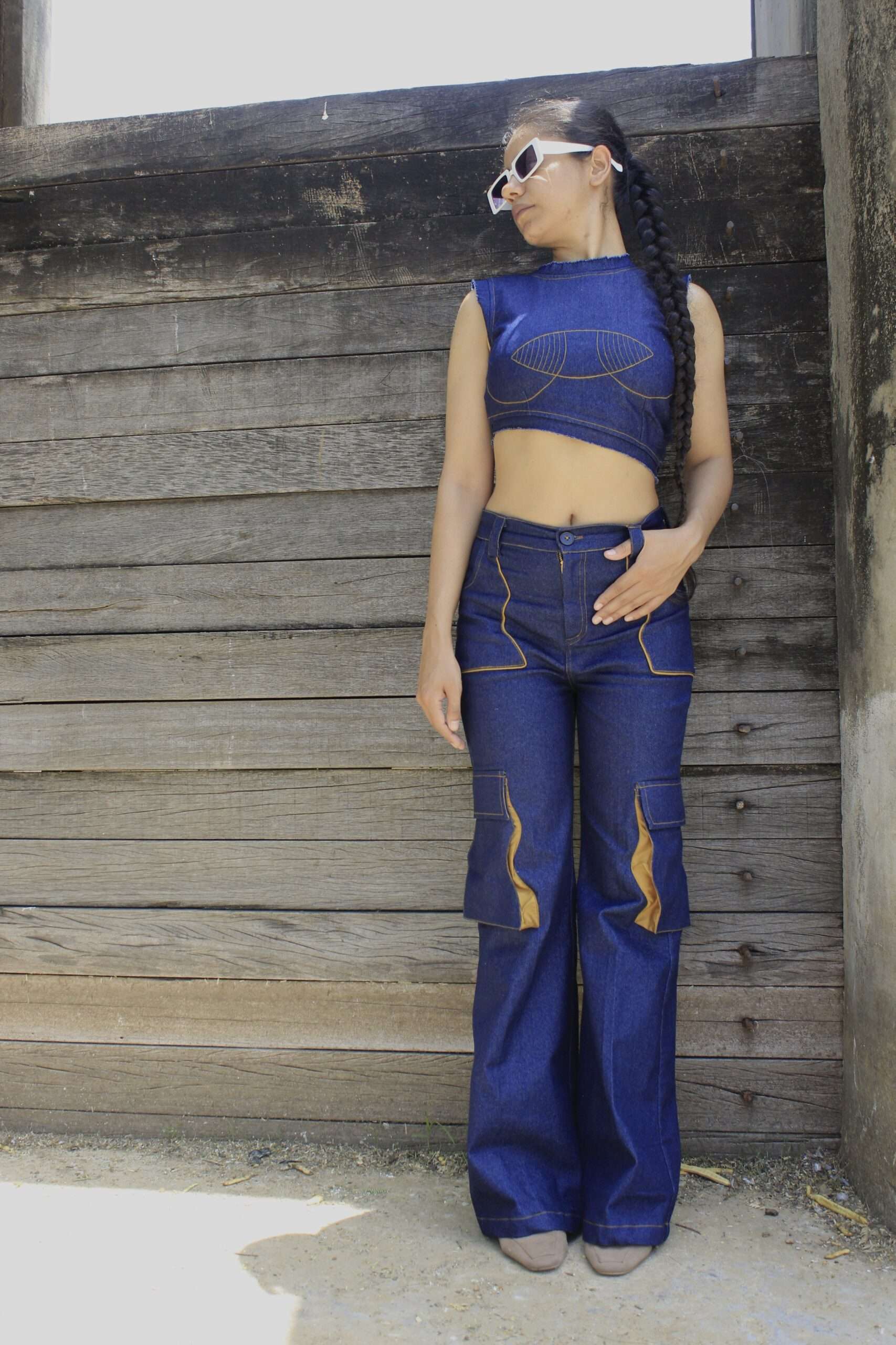 This top is made of navy blue denim fabric which gives you a structured fit. It has embroidery artwork in center-front with asymmetrical waist line. Made with loop-string fastening at the back.