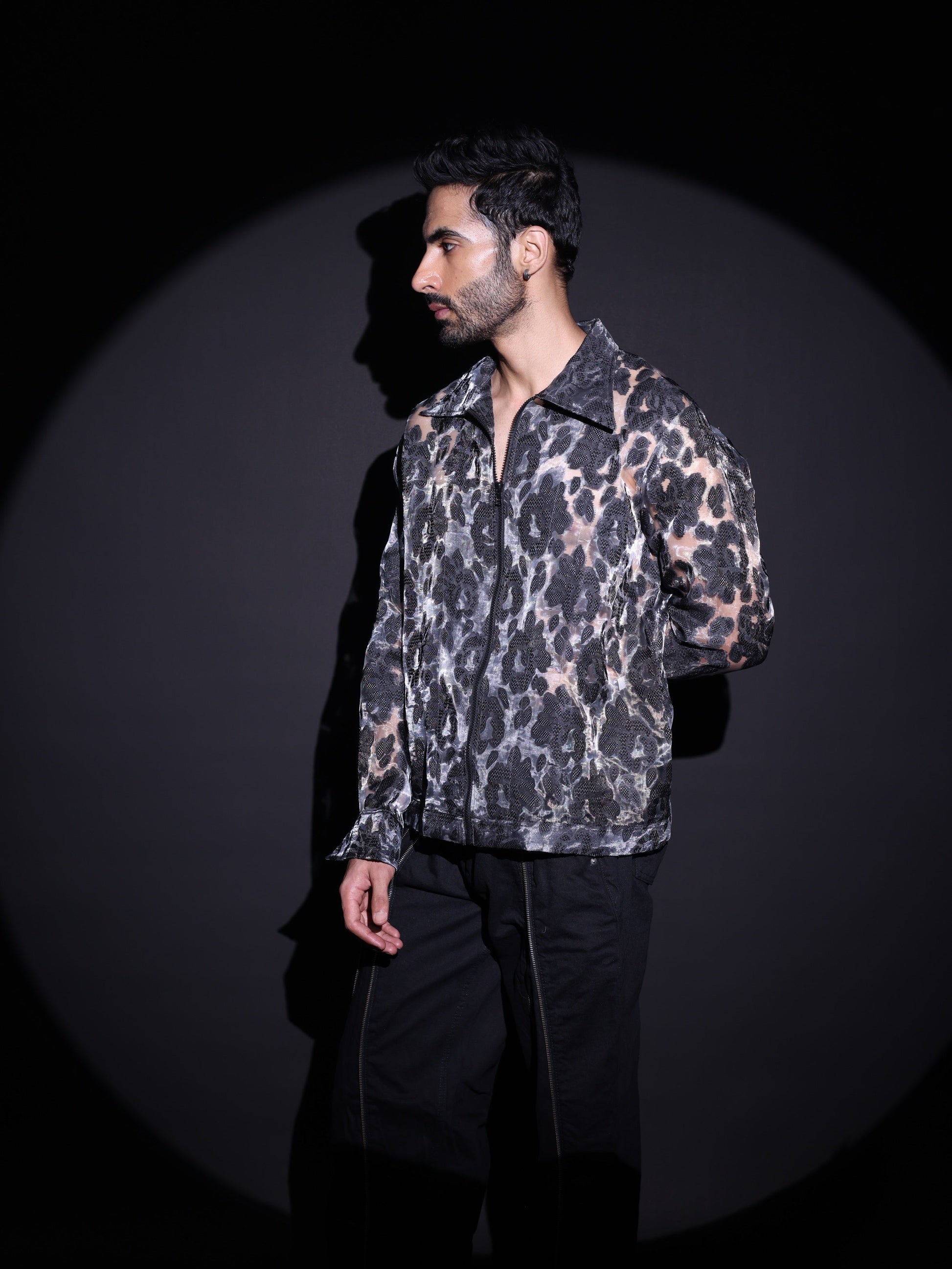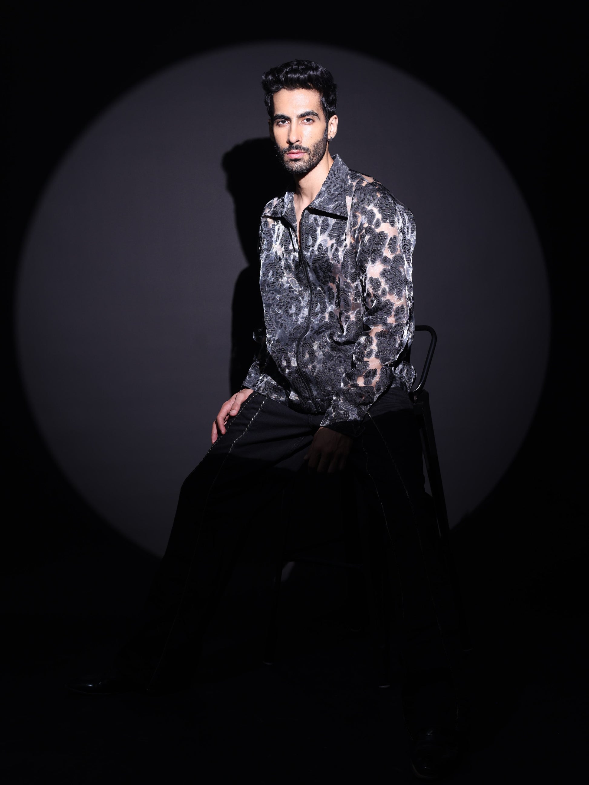 The Ashveil Zip Shirt is an ode to contrasts — softness meets structure, shadow meets skin. Designed in a translucent base with abstract floral overlays in ash grey and black, this zippered piece exudes quiet defiance. The full-sleeve silhouette and sharp collar add restraint to the otherwise untamed texture. Wear it zipped high for impact or slightly open for ease — this is a statement in undone elegance for the modern man.