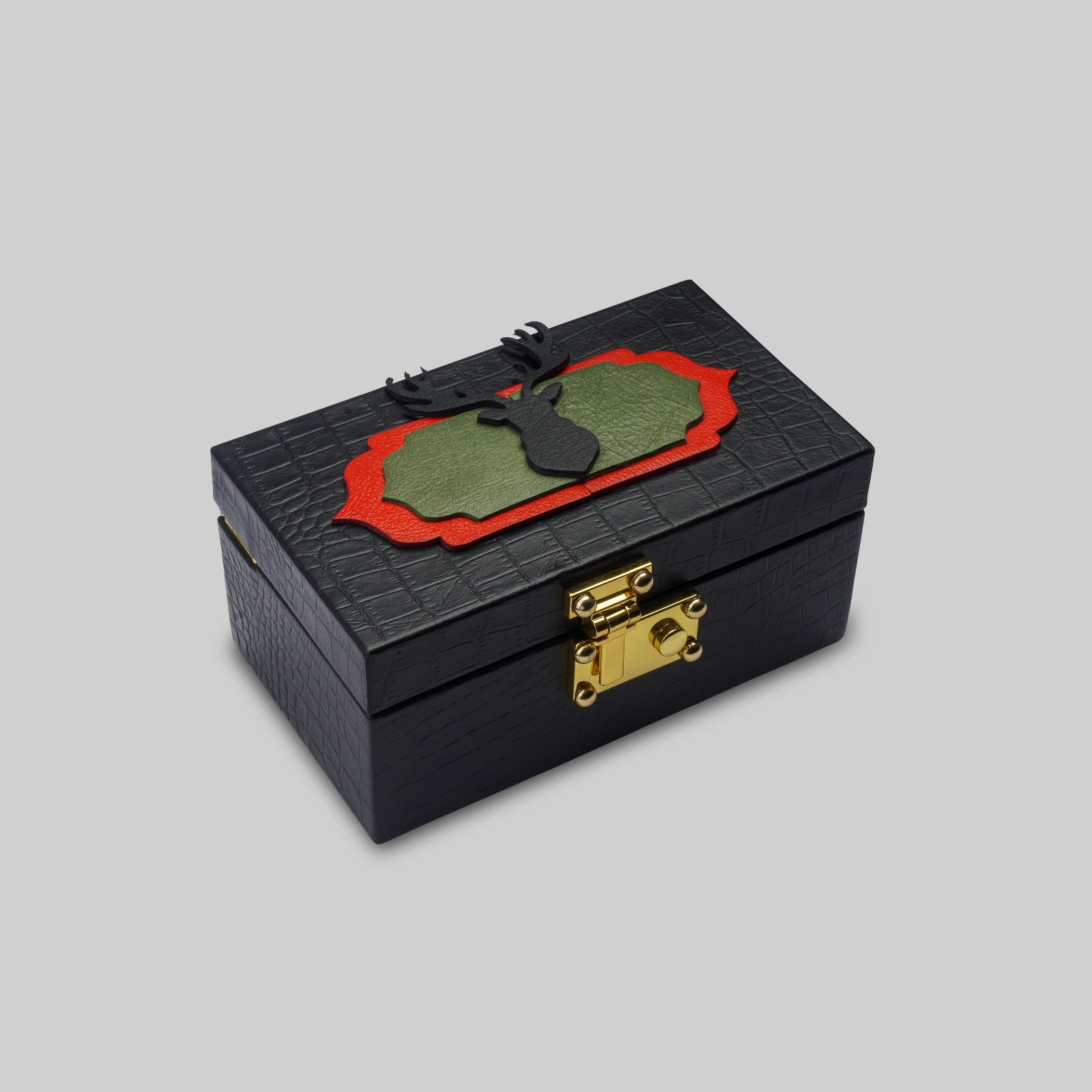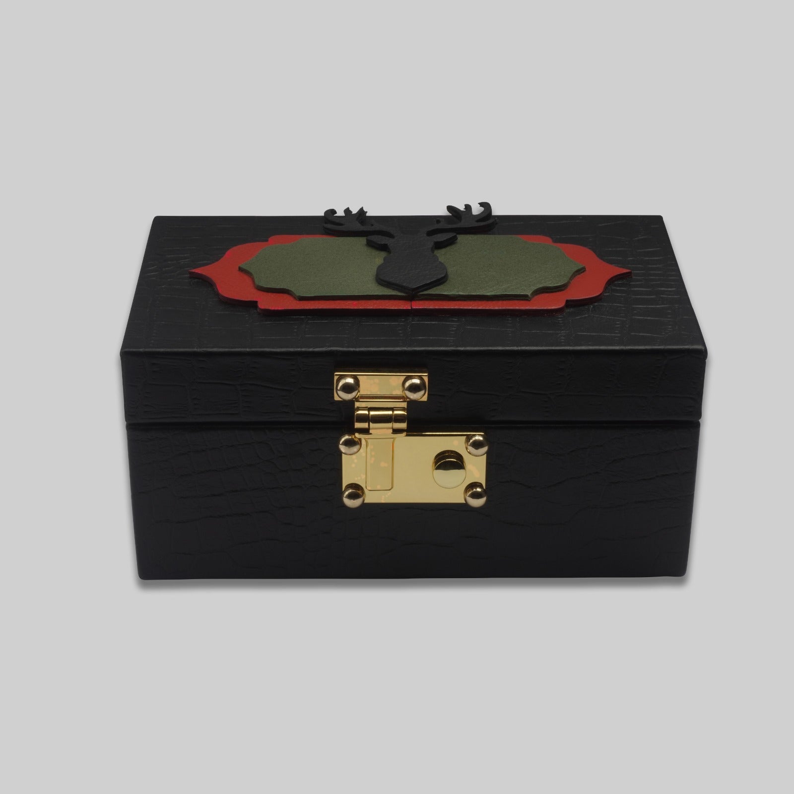 The Black Buck watch Box is a luxurious leather box that features a textured grainy finish and a deer symbol on top. Its interior is well-divided into two sections for perfectly keeping your watches. The lock is made with shiny metal and a quick-pressing button, adding a modern touch to the design.