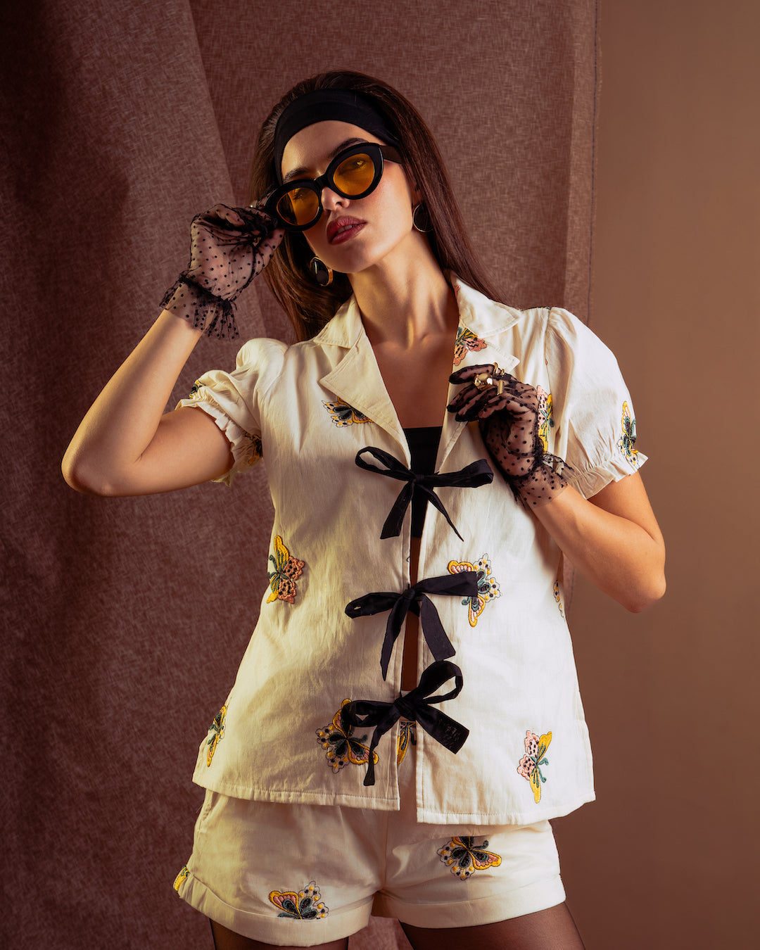 This cotton shorts set is the perfect causal holiday look. The top features a collared neck with short balloon sleeves & black contrast tie up. It is paired with semi fit matching shorts that have a soft cotton lining.
